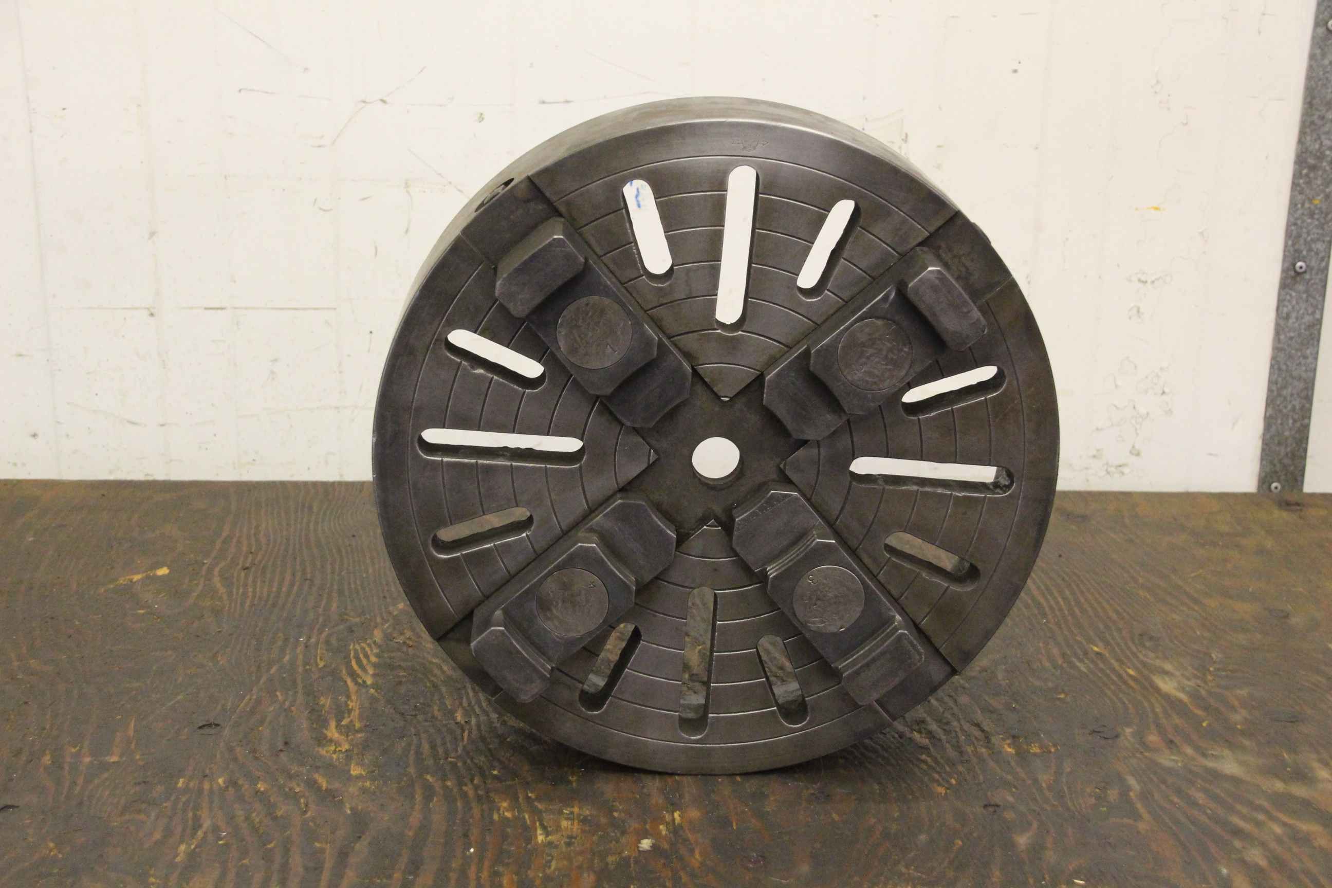 Face plate, face plate chuck, four-jaw chuck, facing chuck -Chuck size: Ø 400 mm -Through hole: Ø 28 mm -Recording: approx M77 x 6 -Weight: 41 kg