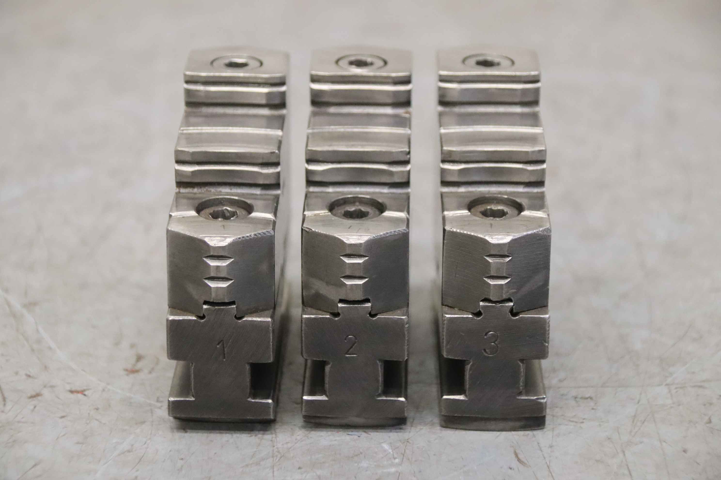 Interchangeable jaws, top jaws, three-jaw chucks, segment jaws, clamping jaws, step block jaws, step top jaws, block jaws, base jaws, interchangeable jaws, wedge bar chucks, interchangeable jaws power chucks-Top jaws: soft top jaws for wedge bar chucks, helical teeth-Jaw width: 22 mm-Dimensions: see photo technical. drawing-Total dimensions: 95/70/H55 mm-Total weight: 2.1 kg
