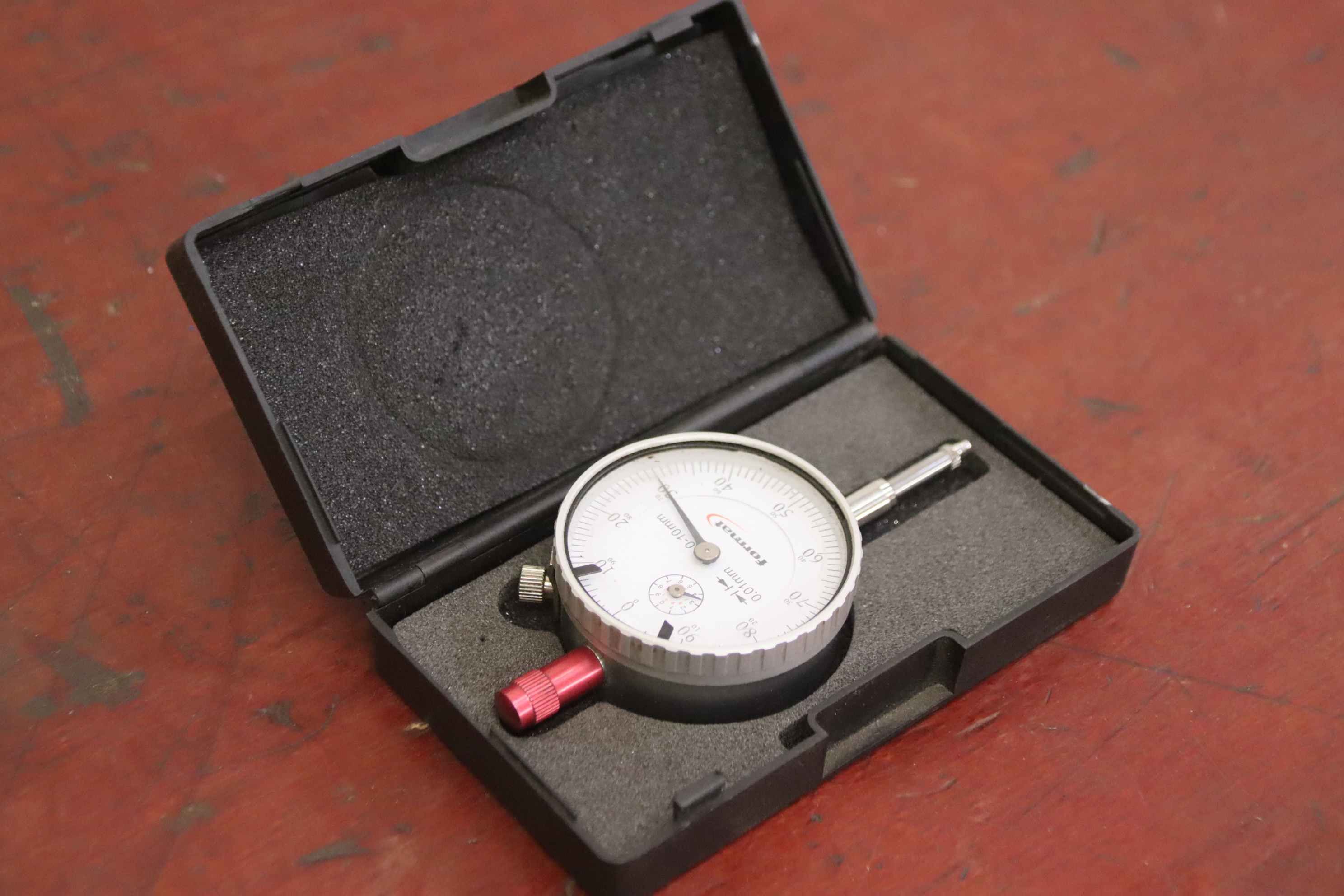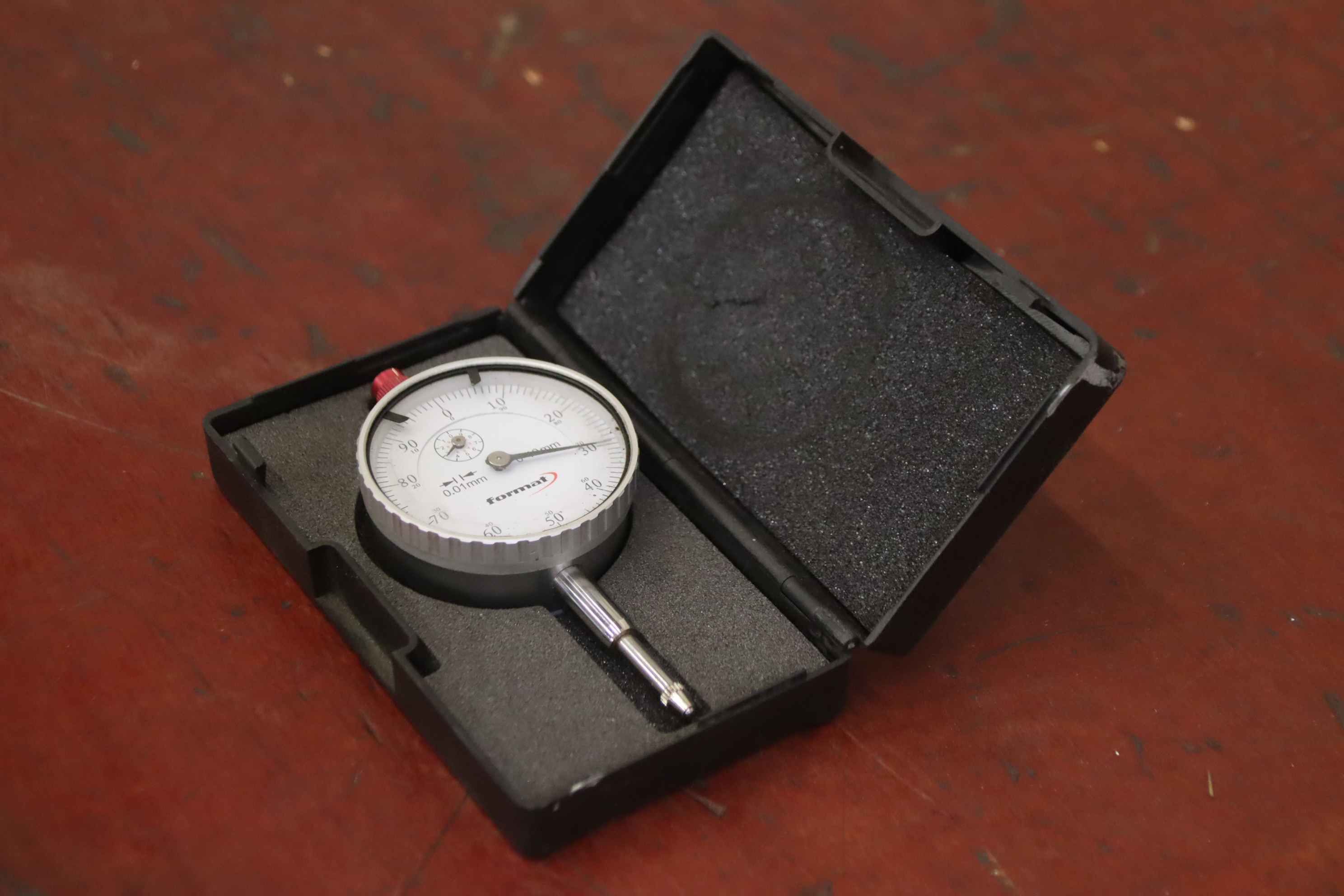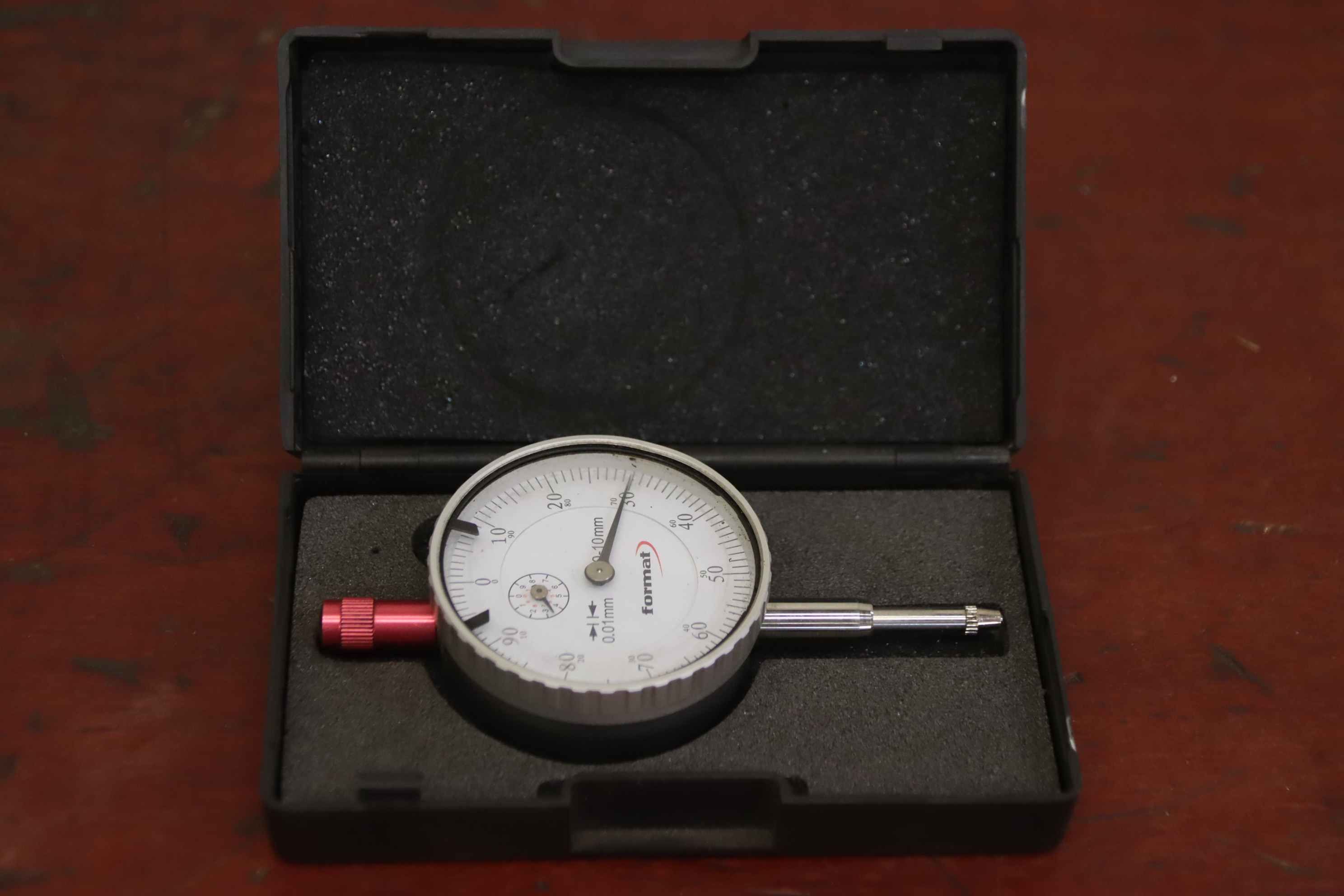 Dial indicator, dial gauge, measuring probe, measuring probe, precision dial gauge-Manufacturer: Format, precision dial gauge 10mm-Measuring range: 0-10 mm-Reading accuracy: 0.01 mm-Outer diameter: 58mm-Case dimensions: 130/75/H30 mm-Weight: 0.2 kg