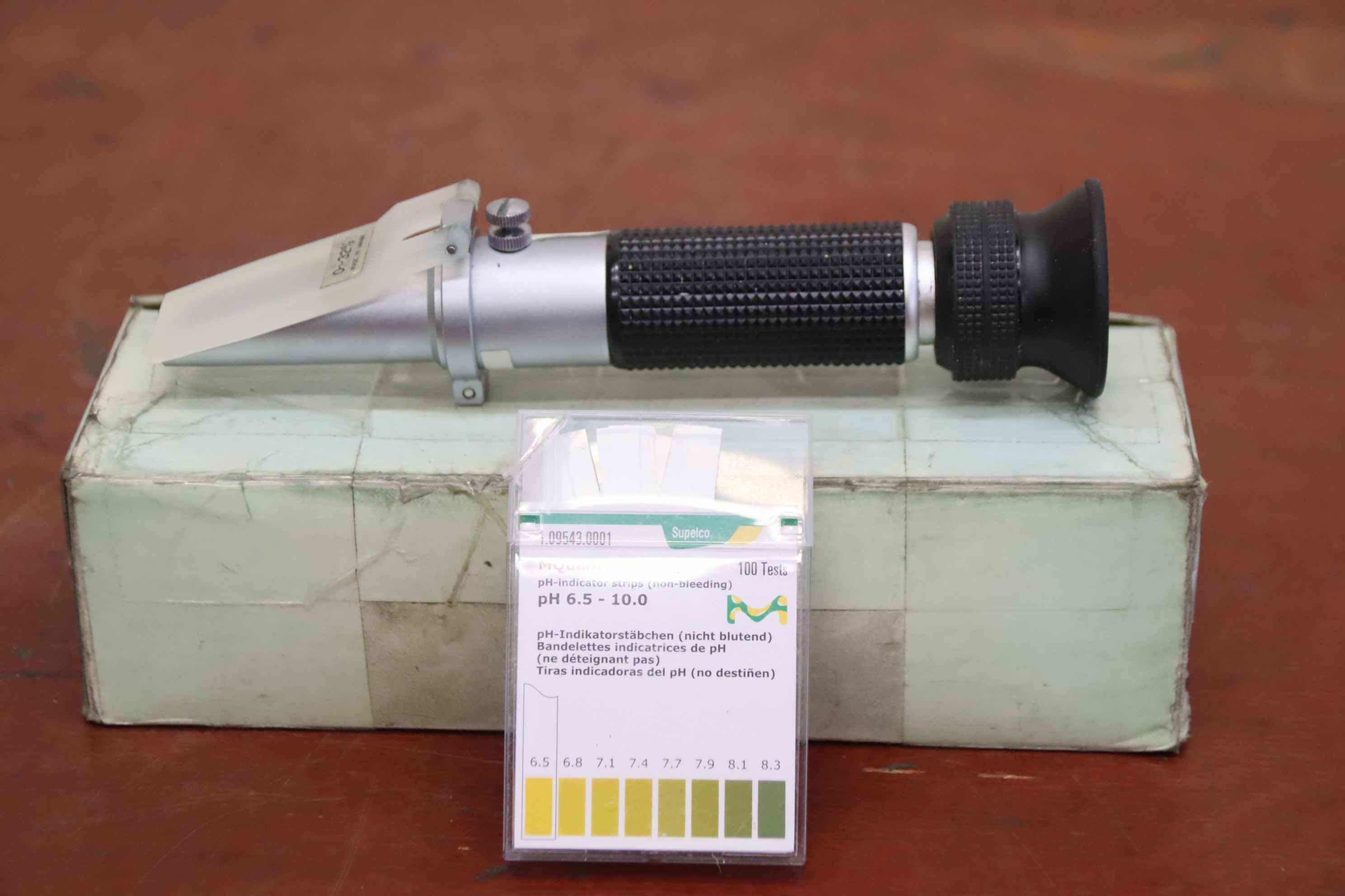 Skimmer coolant fluid, coolant refractometer, pH indicator, hand refractometer, refractometer-Refractometer: hand refractometer with pH indicator sticks-Measuring range: 0-32%-Carton dimensions: 200/70/H60 mm-Weight: 0.3 kg