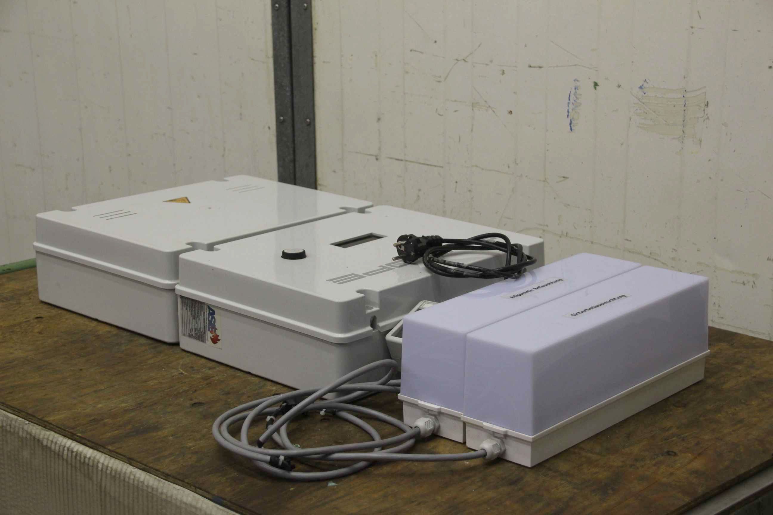 Power supply systems, construction site emergency lighting, escape sign luminaires, escape route luminaires, emergency and escape route lighting, emergency lights, escape routes-Emergency lighting with: charger and controller and batteries-Dimensions: 630/390/H260 mm-Weight: 25 kg