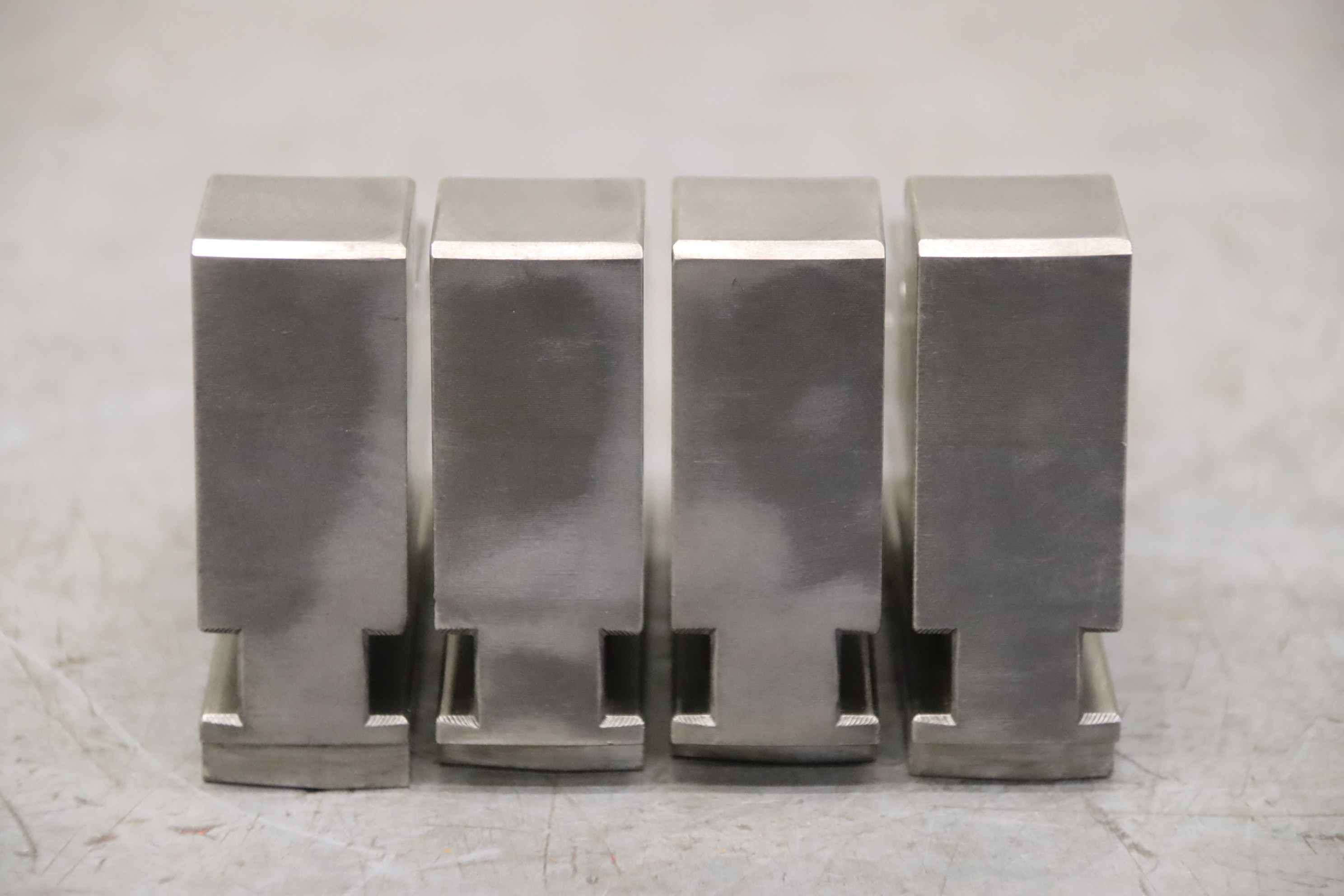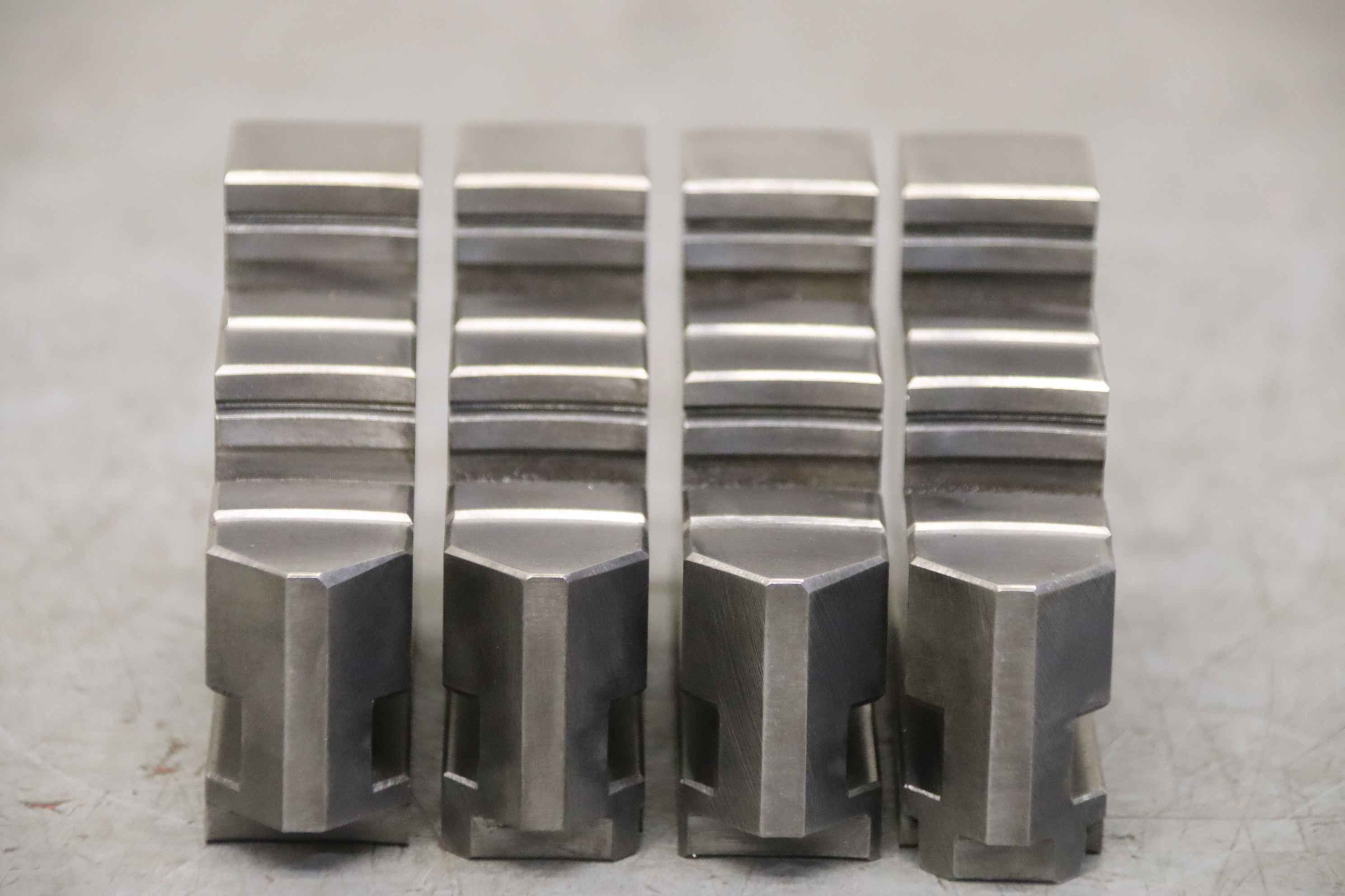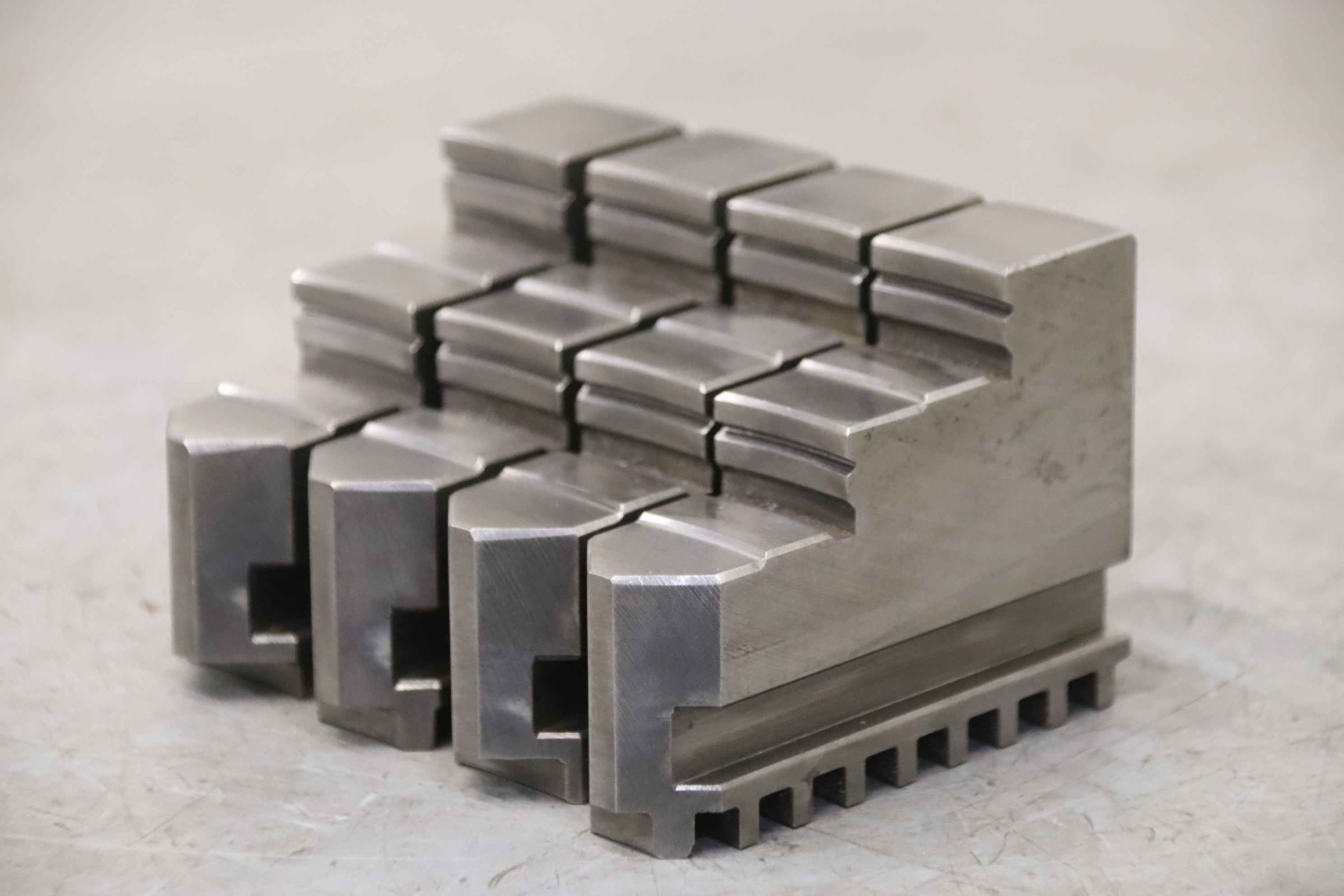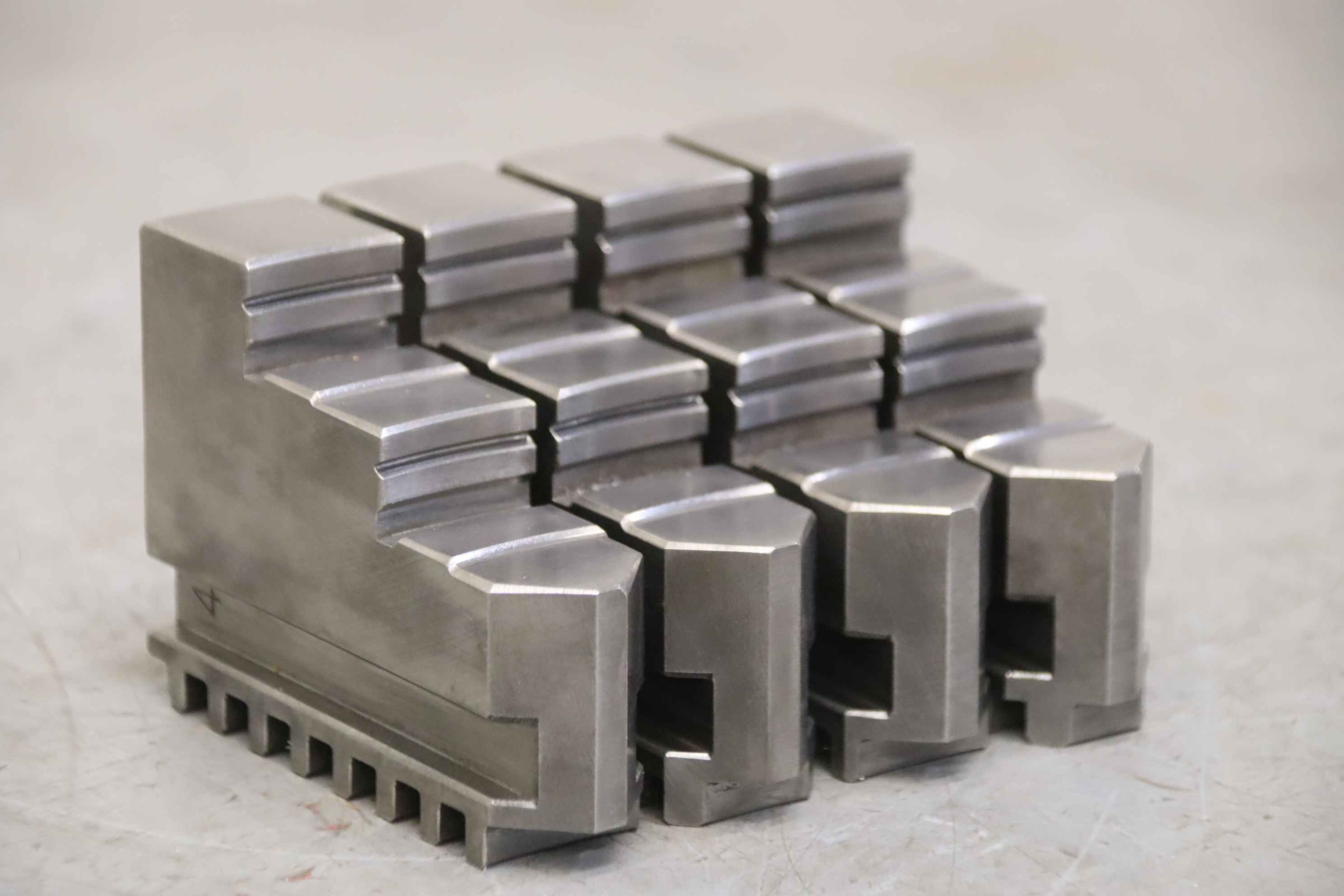 Interchangeable jaws, top jaws, three-jaw chucks, segment jaws, clamping jaws, step block jaws, step top jaws, block jaws, base jaws, 4-jaw set-Top jaws: Turning jaw set, 4-piece, hard-Jaw width: 24 mm-Dimensions: see photo techn. drawing-Quantity: 2 sets of interchangeable jaws available-Price: per set-Dimensions: 92/97/H67 mm / 90/100/H70 mm-Total weight: 2.9 kg/set