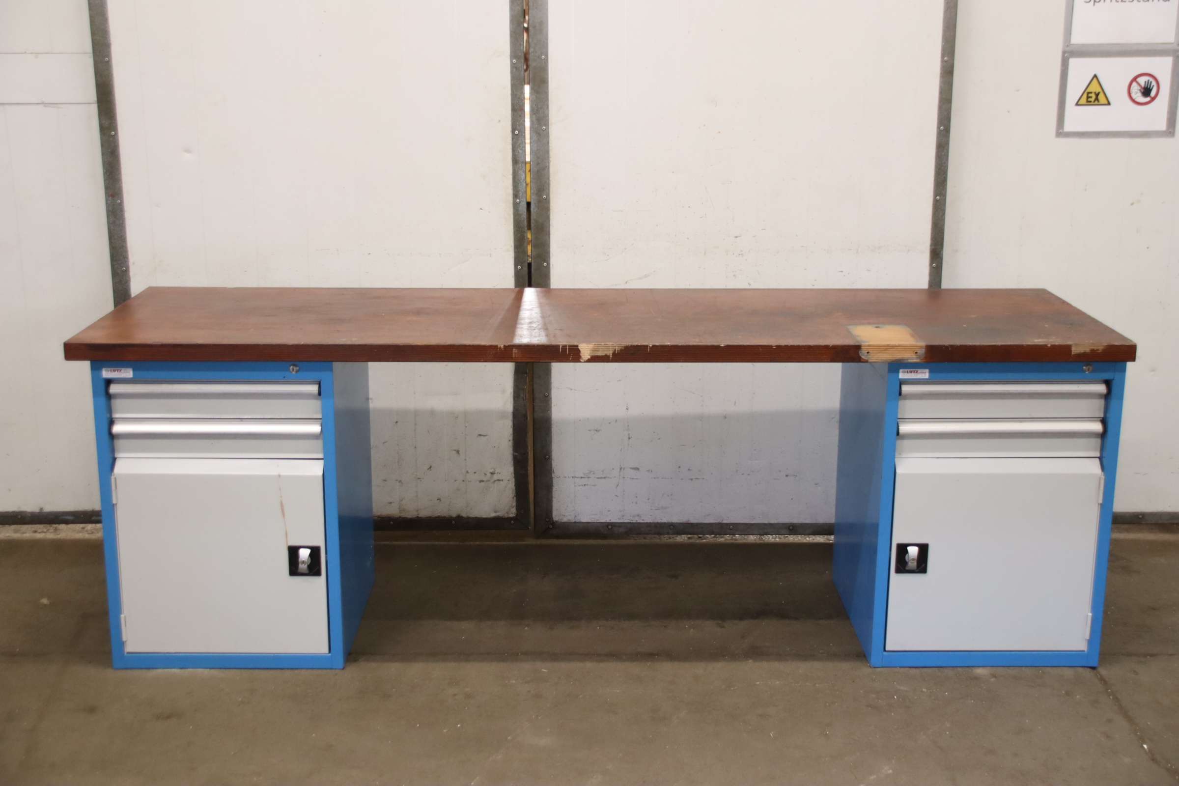 Workbench, work table, assembly bench, assembly table, work table -Manufacturer: KLW Lutz, workbench / solid worktop with base cabinets -Worktop: 2500/700/H850 mm -2x drawer cabinet: 2 drawers, layout/height see photos -Transport dimensions: 2500/700/H855 mm -Weight: 152 kg