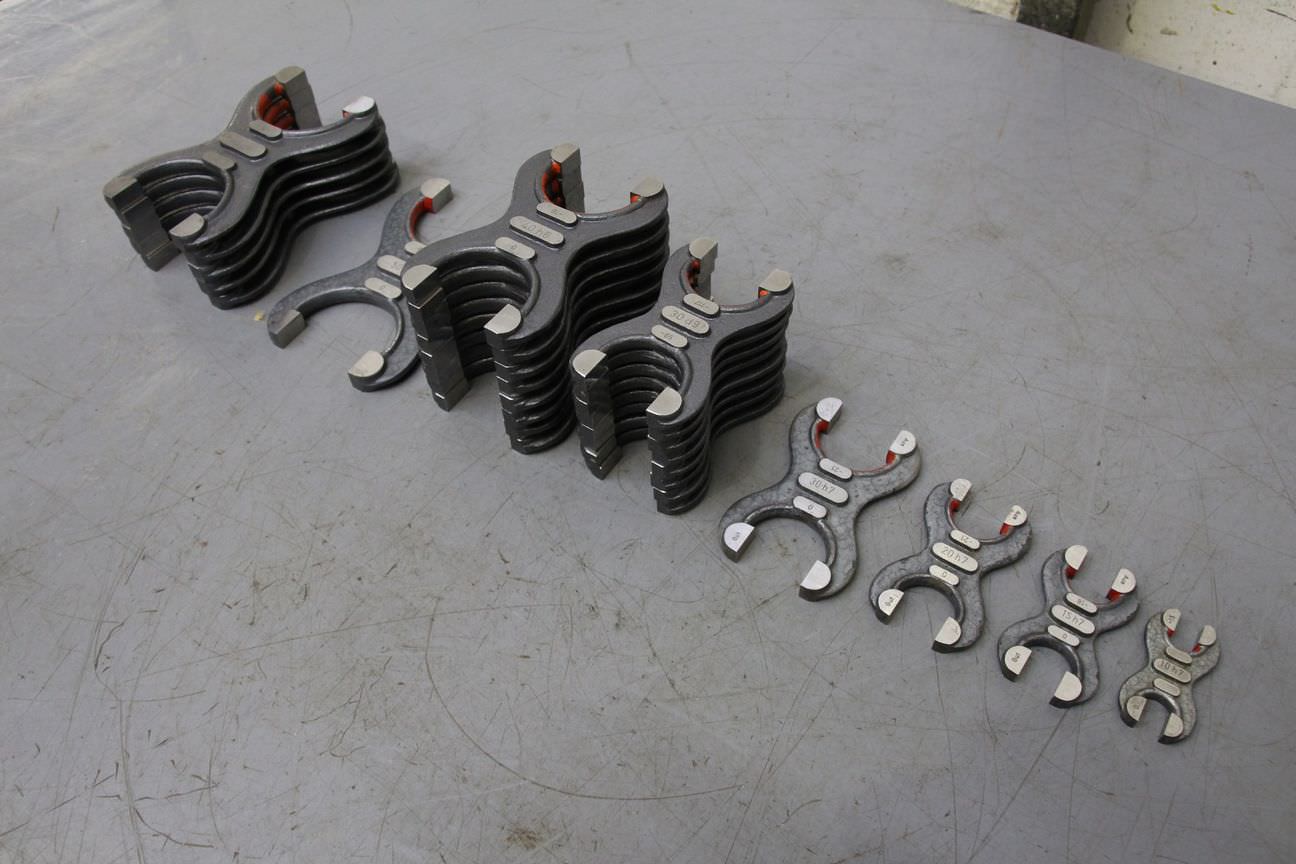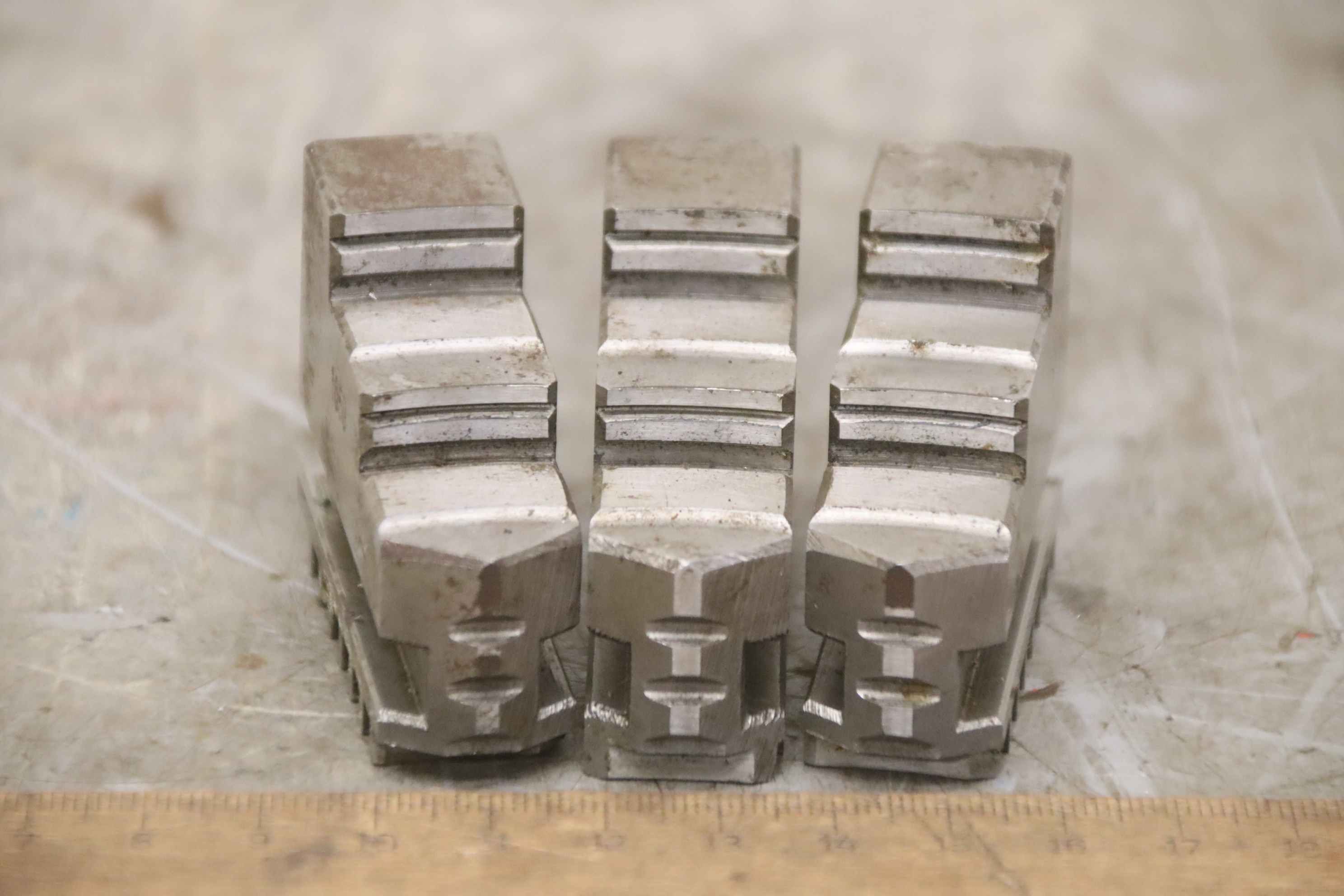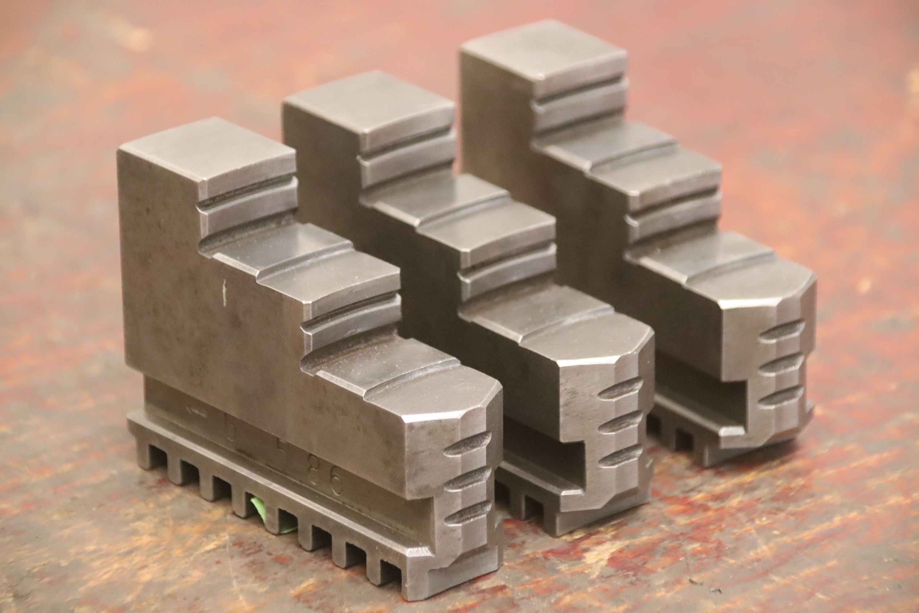 Interchangeable jaws, top jaws, three-jaw chuck, segment jaws, clamping jaws, stepped block jaws, stepped top jaws, block jaws, base jaws, 4-jaw set-Top jaws: Jaw set for three-jaw lathe chucks, hard-Jaw width: 18 mm-Dimensions: see photo techn. drawing-Total dimensions: 54/54/H42 mm-Total weight: 0.6 kg