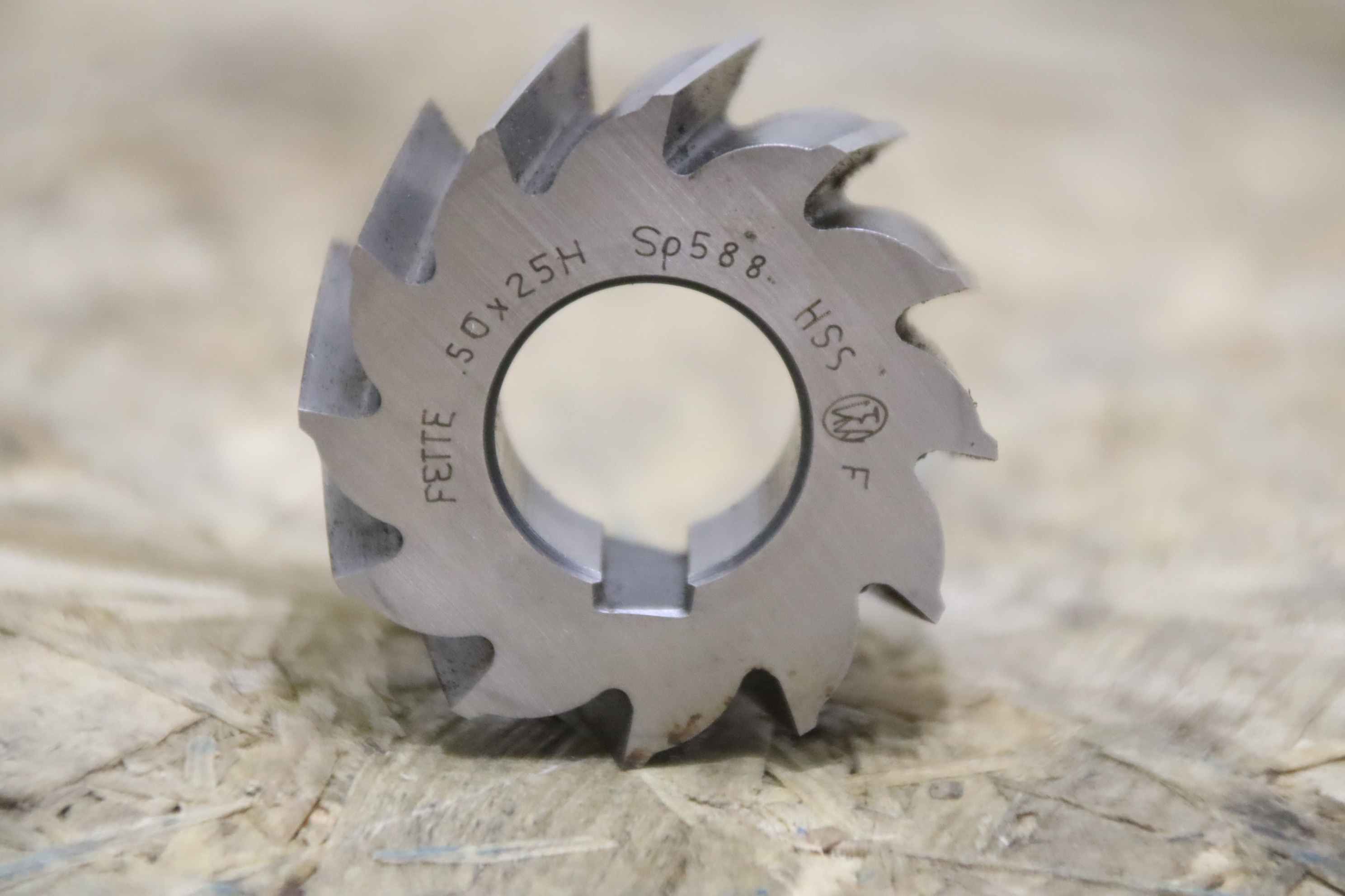 Shell end milling cutters, shell milling cutters, milling cutters, shell milling cutters-Manufacturer: Fette, shell end mill with longitudinal groove-Type: Fette 50 x 25 H Sp 588-Intake: with fitting groove-Cutting material: HSS-Dimension: Ø 50 x 25 x 22 mm-Weight: 0.2 kg