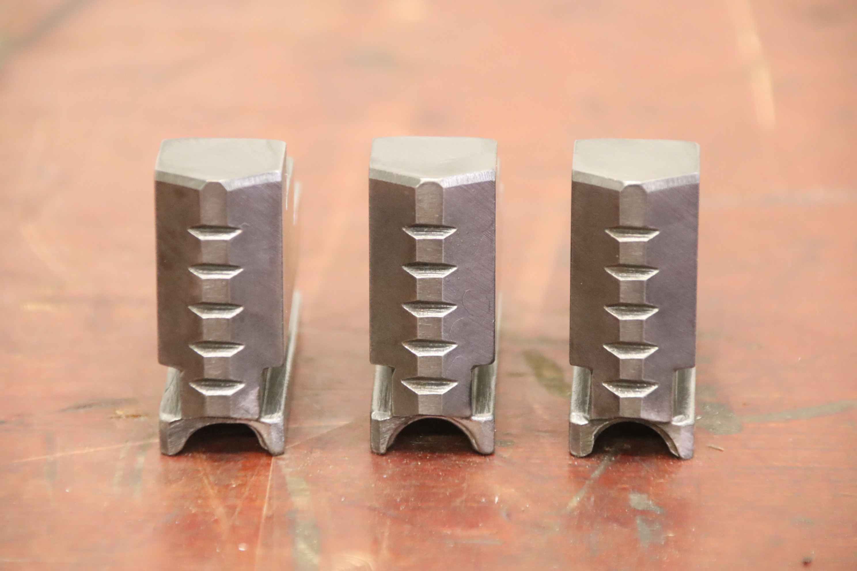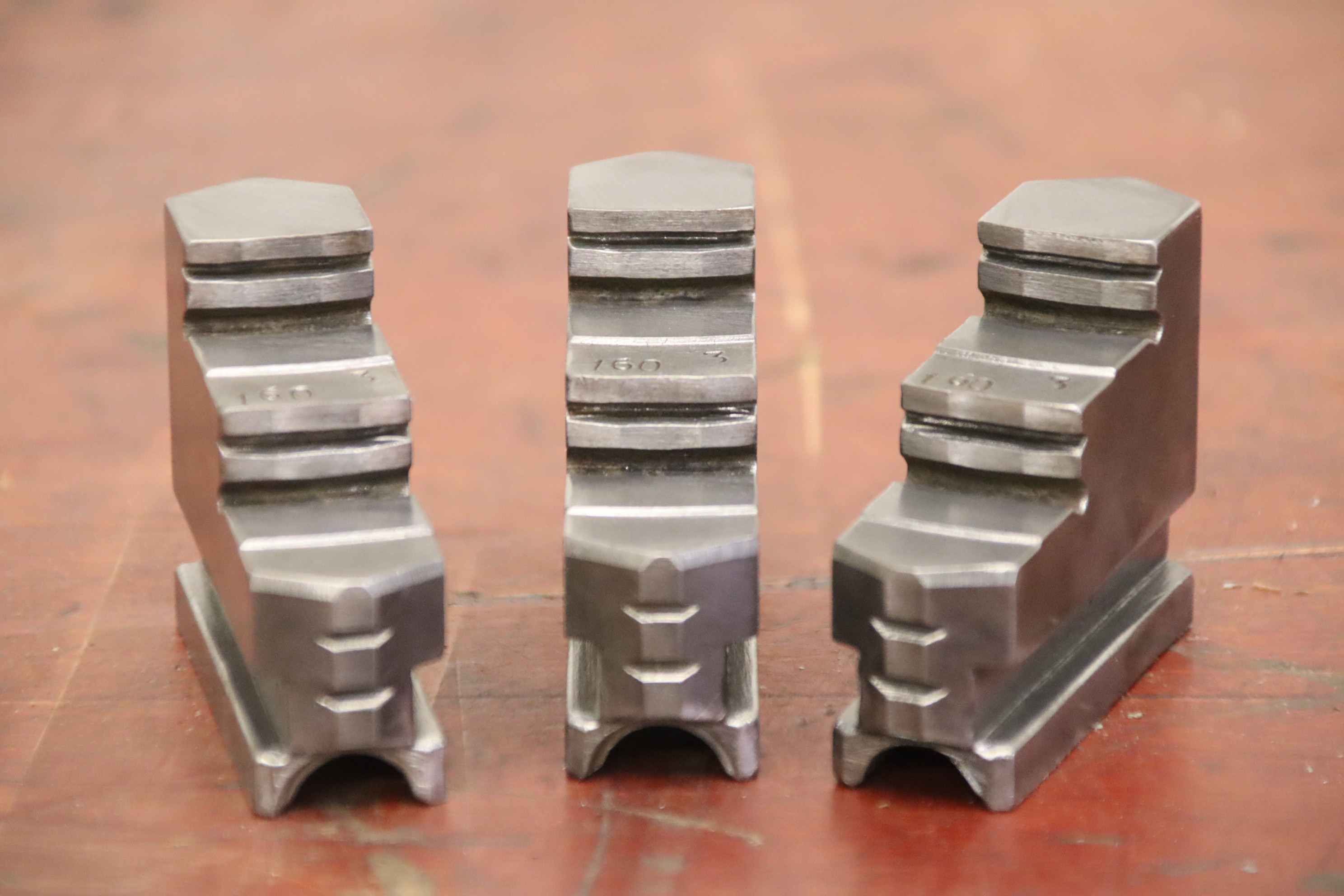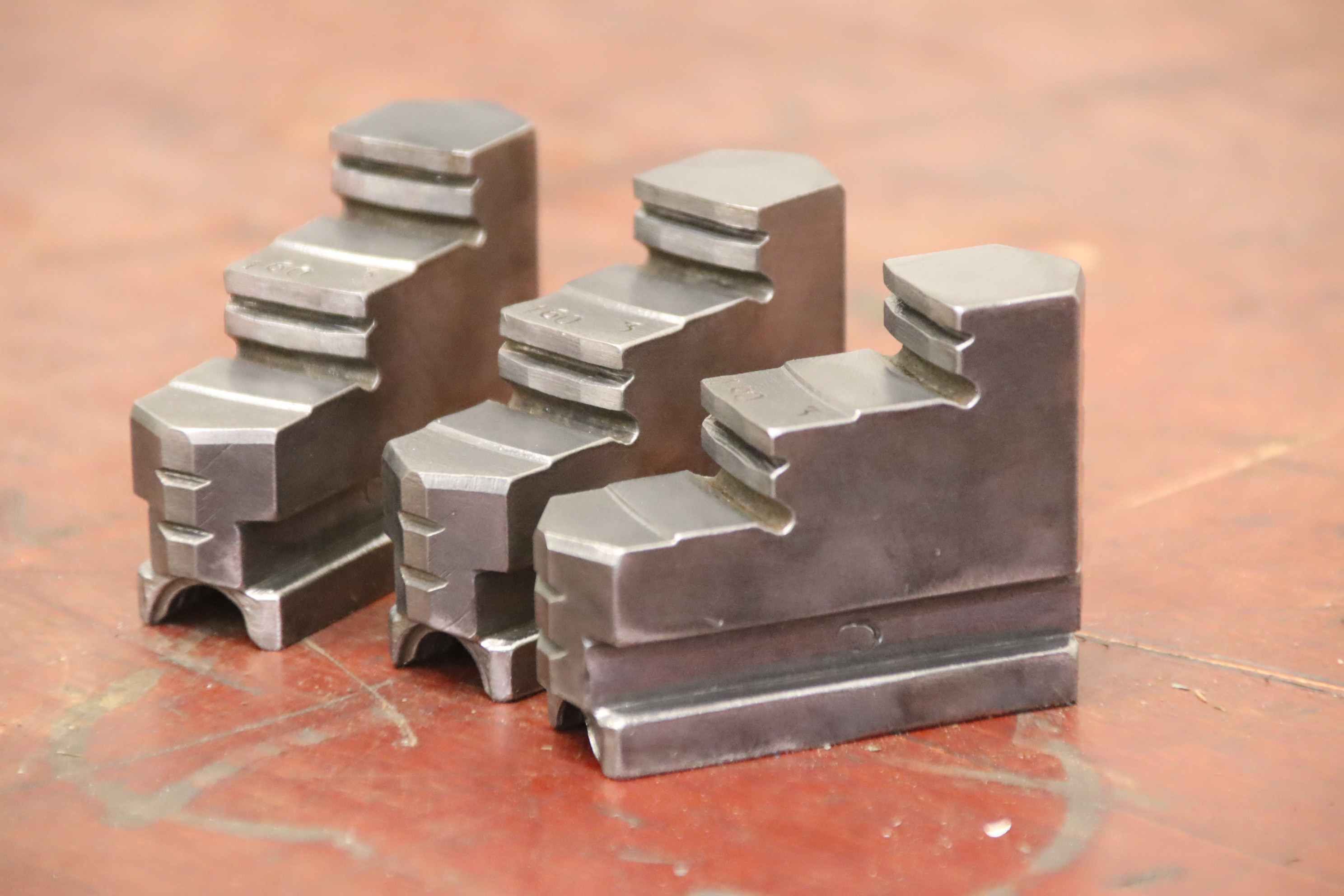 Interchangeable jaws, top jaws, three-jaw chucks, segment jaws, clamping jaws, stepped block jaws, stepped top jaws, block jaws -Interchangeable jaws: 3-piece hard top jaw set -Width: 40 mm -Dimensions total: 107/120/H55 mm -Total weight: 3.2 kg
