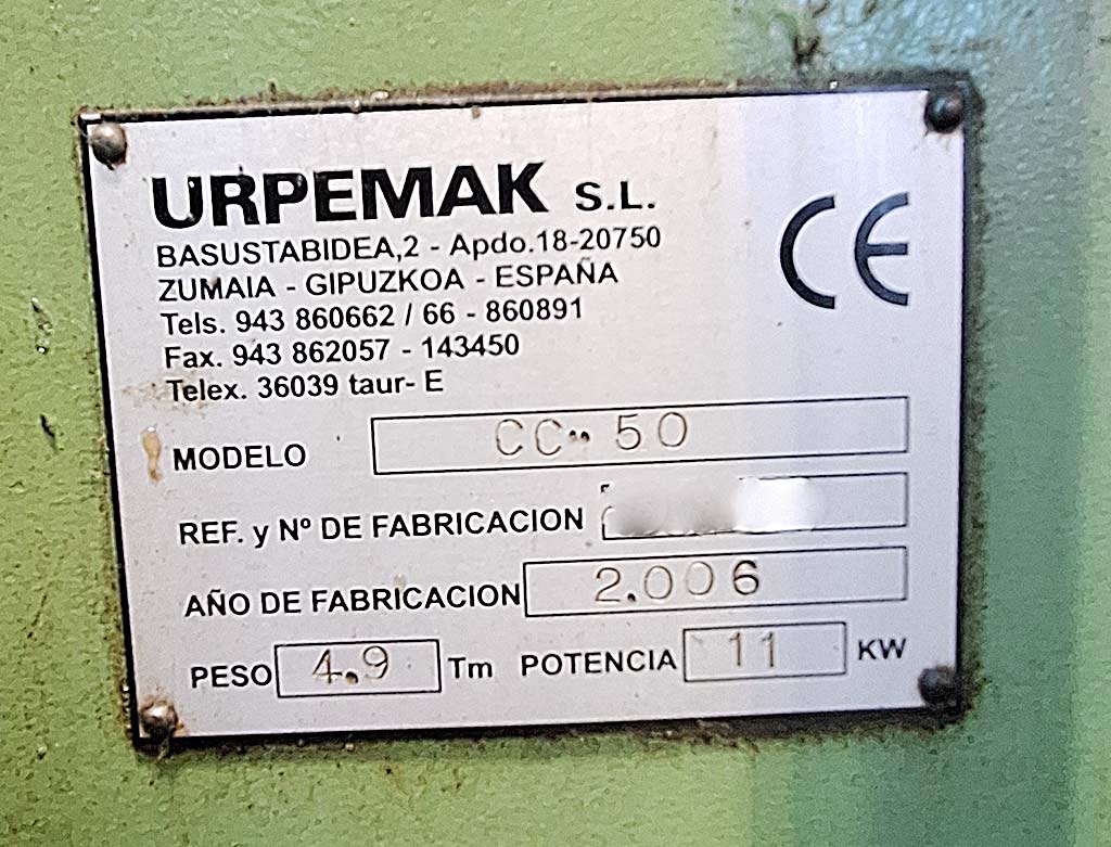 Alüminyum için soğuk kamaralı döküm makinesi Urpemak mevcuttur. Sıkıştırma kuvveti: 50t, merdane genişliği: 500mm, bağlantı çubuğu aralığı: 500mm, atış ağırlığı: 50cm³, ejektör kuvveti: 6400kg, bağlı yük: 11kW, ağırlık: yaklaşık 4900kg. Yerinde inceleme mümkündür.