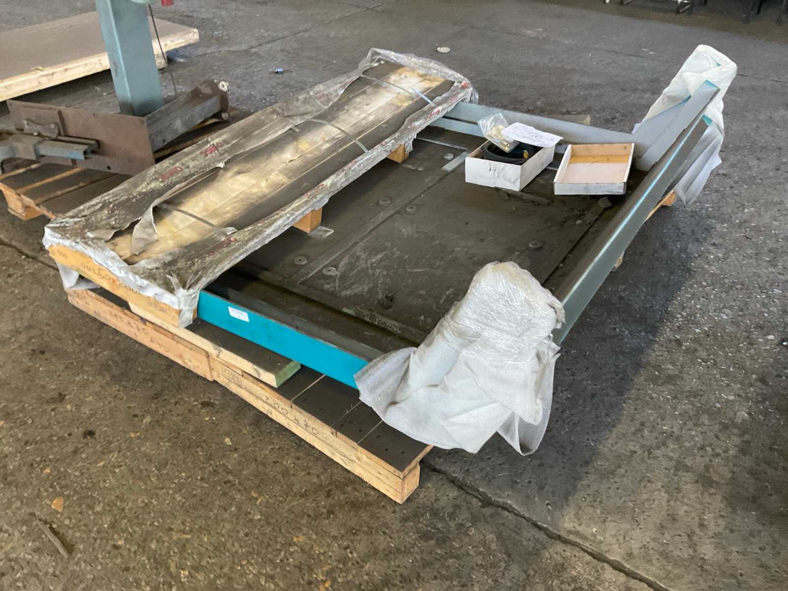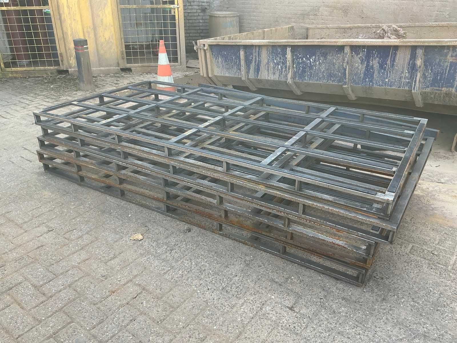 4 tonnes of stacked galvanized steel floor panels used for industrial construction flooring. The panels are neatly arranged on a wooden pallet, ready for installation or transport. These elements are typically used as load-bearing components in mezzanines, factory floors, or elevated platforms, providing strong and durable support for heavy industrial applications. In the background, several large transport crates can be seen inside a warehouse setting. Per panel: LONG- 3M HIGHT- 75MM WIDTH- 0,20M WEIGHT - 18,4KG