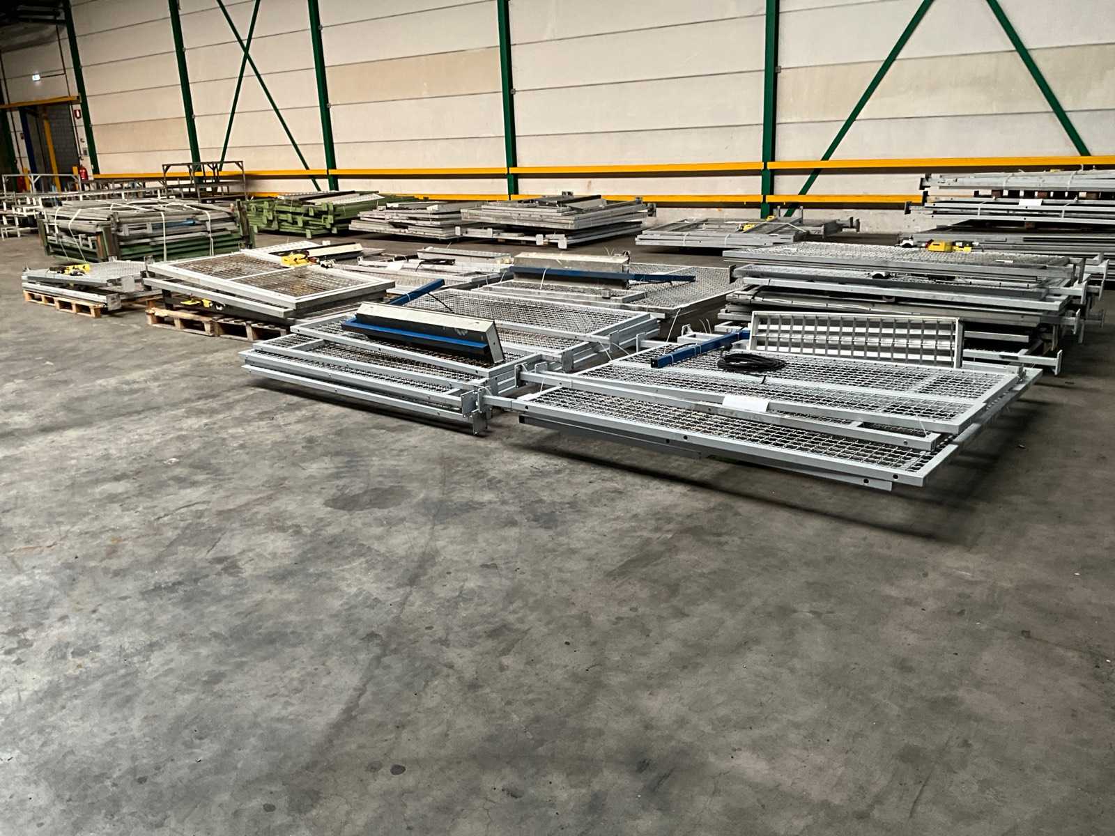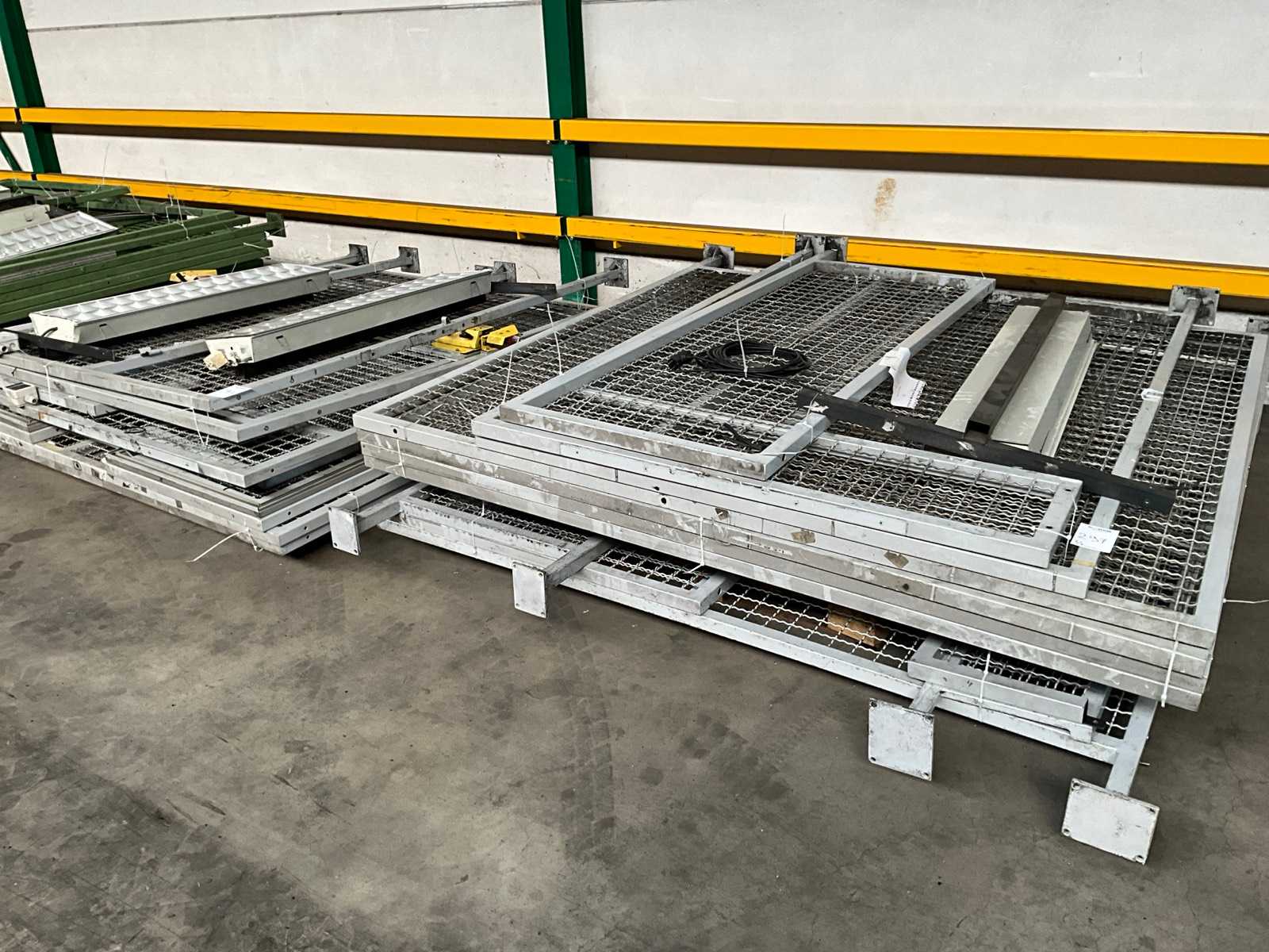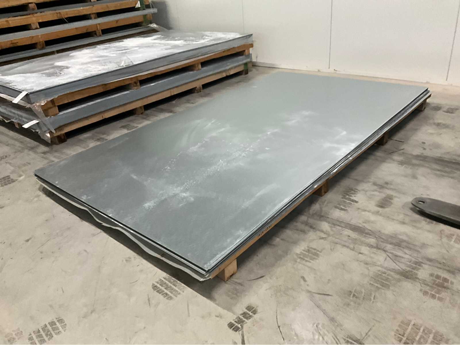 5 tonnes of stacked galvanized steel floor panels used for industrial construction flooring. The panels are neatly arranged on a wooden pallet, ready for installation or transport. These elements are typically used as load-bearing components in mezzanines, factory floors, or elevated platforms, providing strong and durable support for heavy industrial applications. In the background, several large transport crates can be seen inside a warehouse setting. Per panel: LONG- 3M HIGHT- 75MM WIDTH- 0,20M WEIGHT - 23,2KG