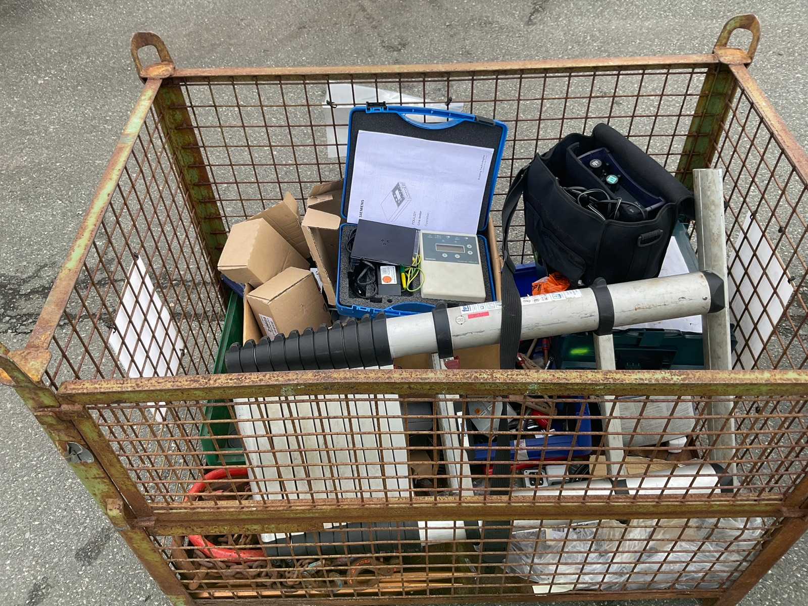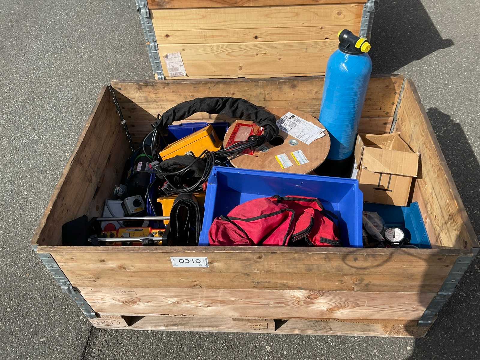 Contents: cable drums, electrical control units (yellow box), a blue pressure vessel or filter as well as various cables and bags