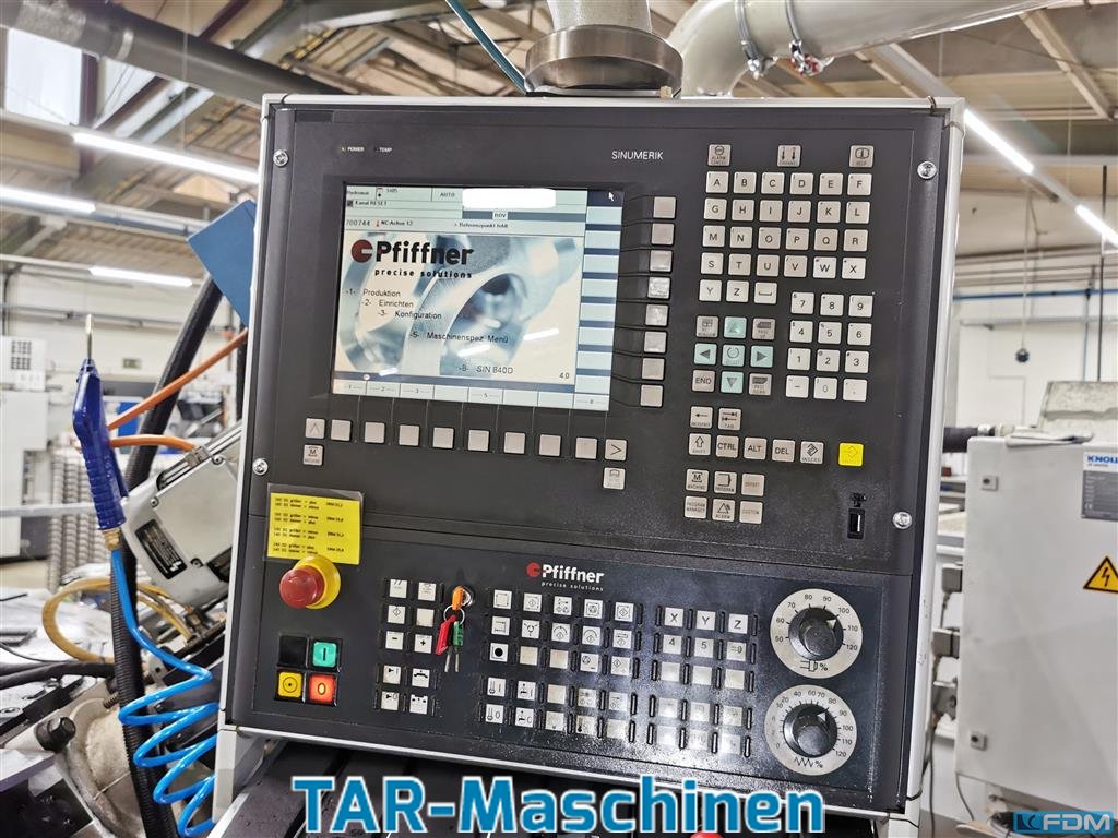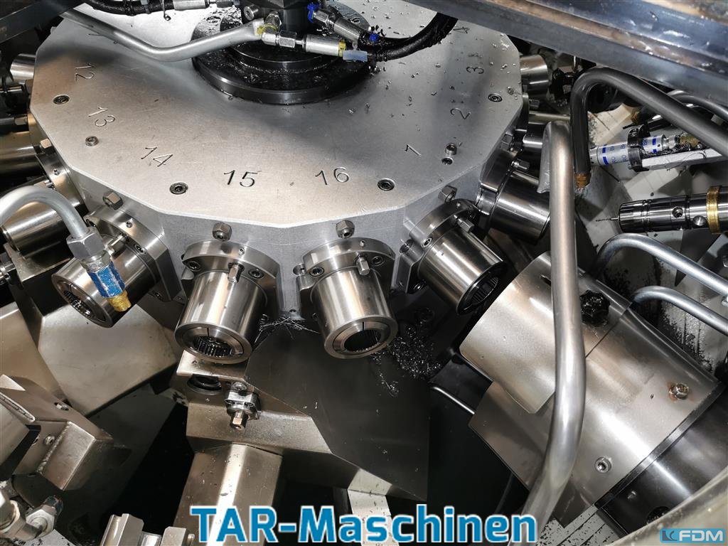 Article: Rotary transfer machineManufacturer: PfiffnerType: Hydromat HB 32-45/16 CNCYob: 2013Electro-hydraulically controlled, fully automaticExtract from offer:Coolant system with chip conveyor and Knoll vacuum rotation filterHigh pressure pump 50 barSecond coolant ringWater cooler type 1600Collets type B32-45 UPControl: Siemens Sinumerik 840D - CNC / S7-PLC incl. modem (for teleservice)1 bar loading magazine type IEMCA: bundle loader (yob. 2011)1 Sawing unit: Saw blade D250mm2 Feed unit VE 26/80-HSK: Spindle stroke max. 80mm; spindle speed max. 7200 rpm; drive power up to 2.2kW; HSK 322 Vertical support 26/80 with 36° angular position2 drilling head 26/80-HSK: HSK 321 feed unit VE 36/100-HSK: spindle stroke max. 100mm; spindle speed max. 5430 rpm; drive power up to 2.2kW; HSK 404 Feed unit VE 36/100-HSK internal cooling: Spindle stroke max. 100mm; spindle speed max. 5430 rpm; drive po ...