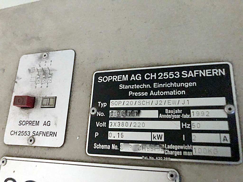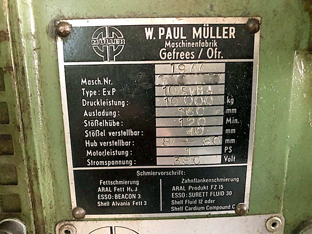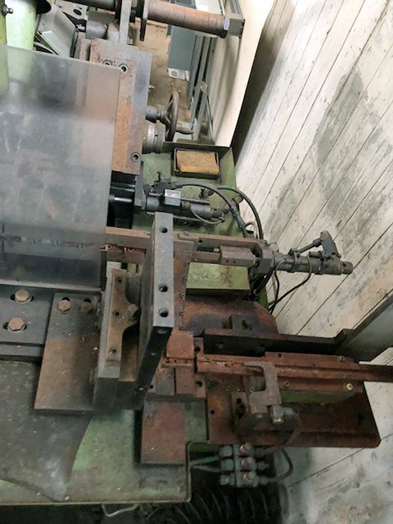 Various used machines for metal processing are available. 1) Eccentric press Müller ExP 10.SVBA, year of manufacture: 1977, pressing force: 10t, outreach: 160mm, stroke rate: 120/min, ram adjustment: 40mm, stroke adjustment: 72mm, weight: approx. 800kg. 2) 3x decoiler Soprem SOP/20, year of manufacture: 1992/1992/1998, load capacity: 100kg, max. coil outer diameter: 850mm, max. strip width: 100mm, speed: 22rpm. 3) Welding closing system Messer FP500K, year of manufacture: 1977, outreach: 165mm. 4) Feeding machine Felss FR16-V, year of manufacture: 2002, max. tube diameter: 16mm, upsetting shaft speed: 342rpm. On-site inspection is possible.