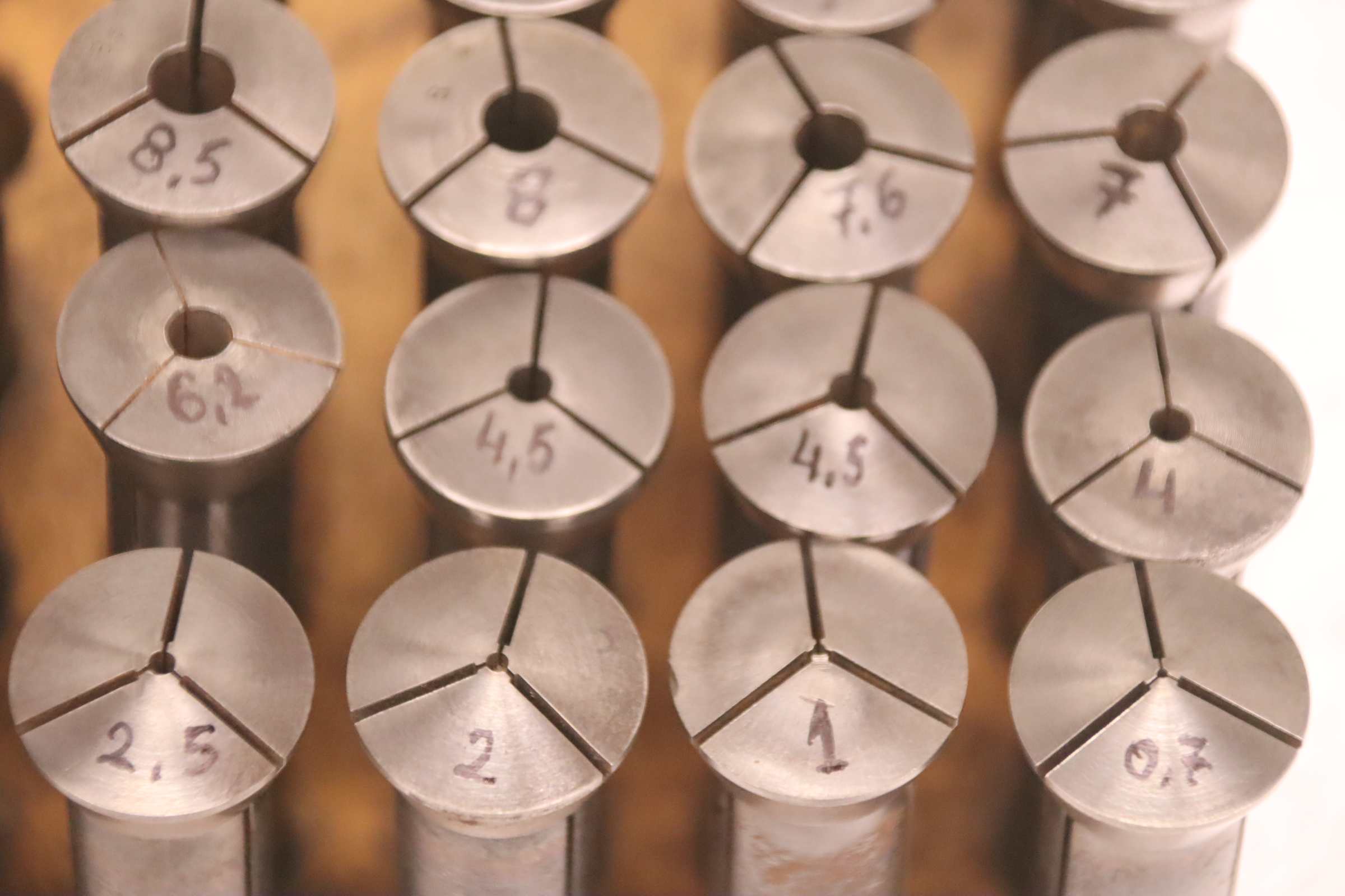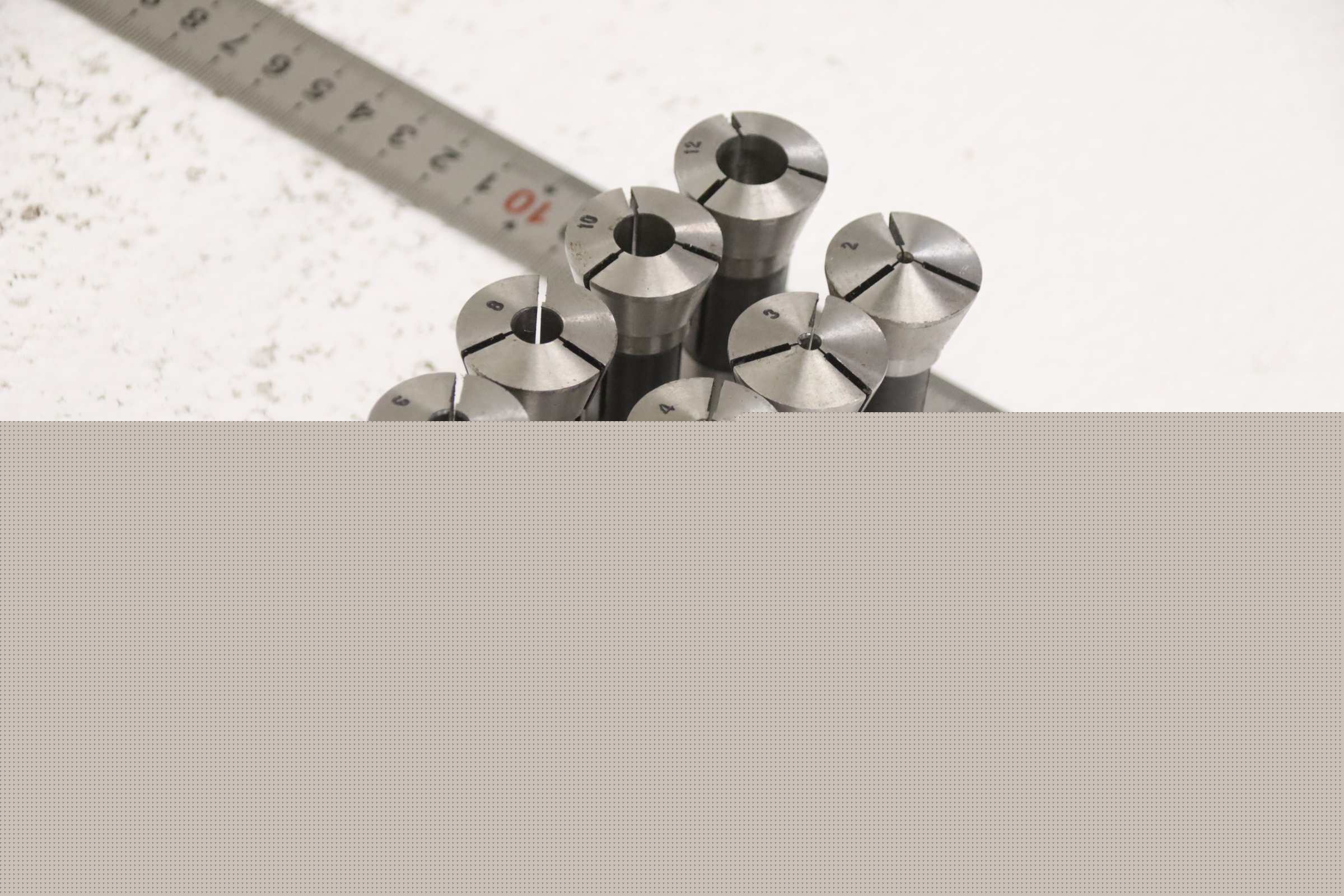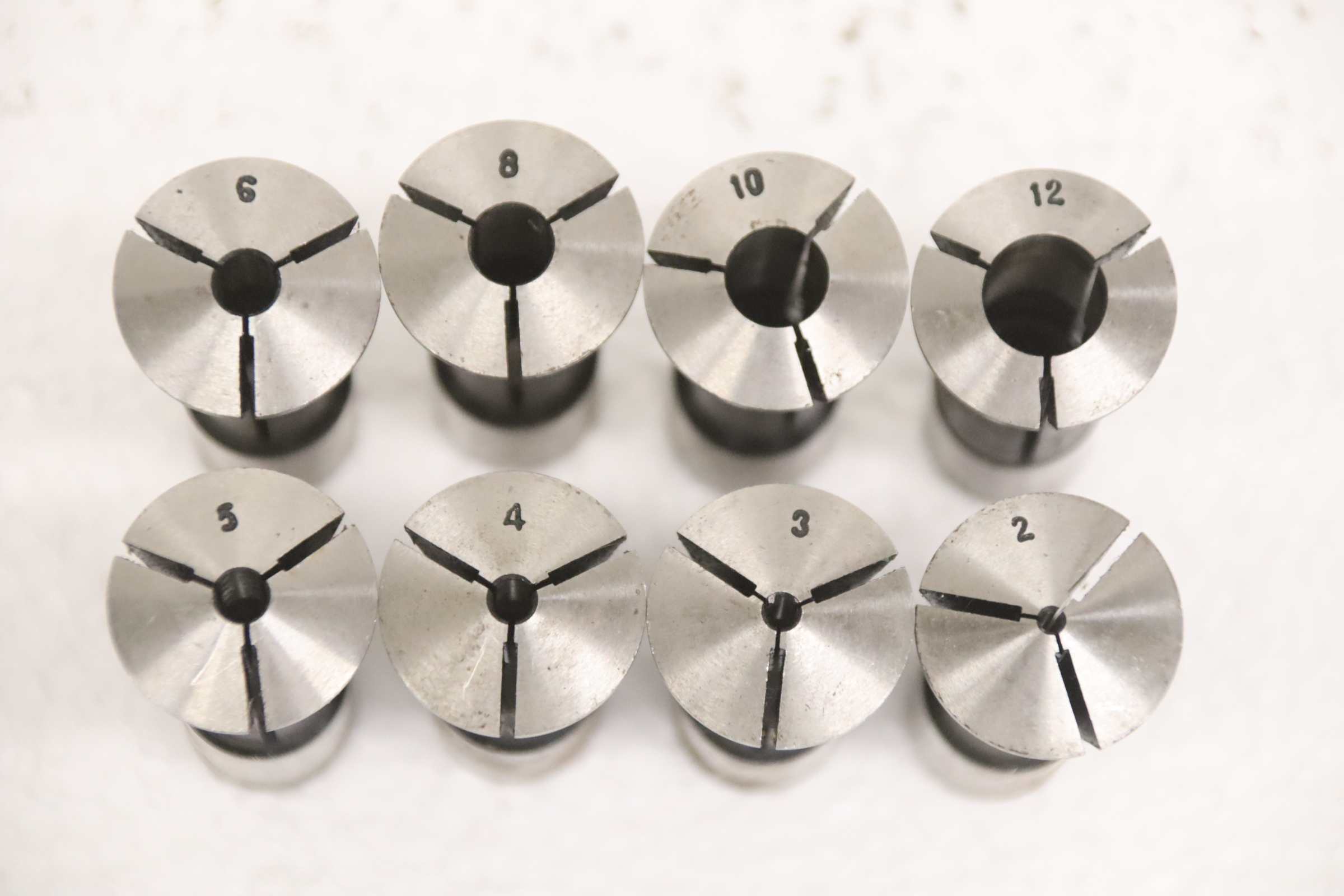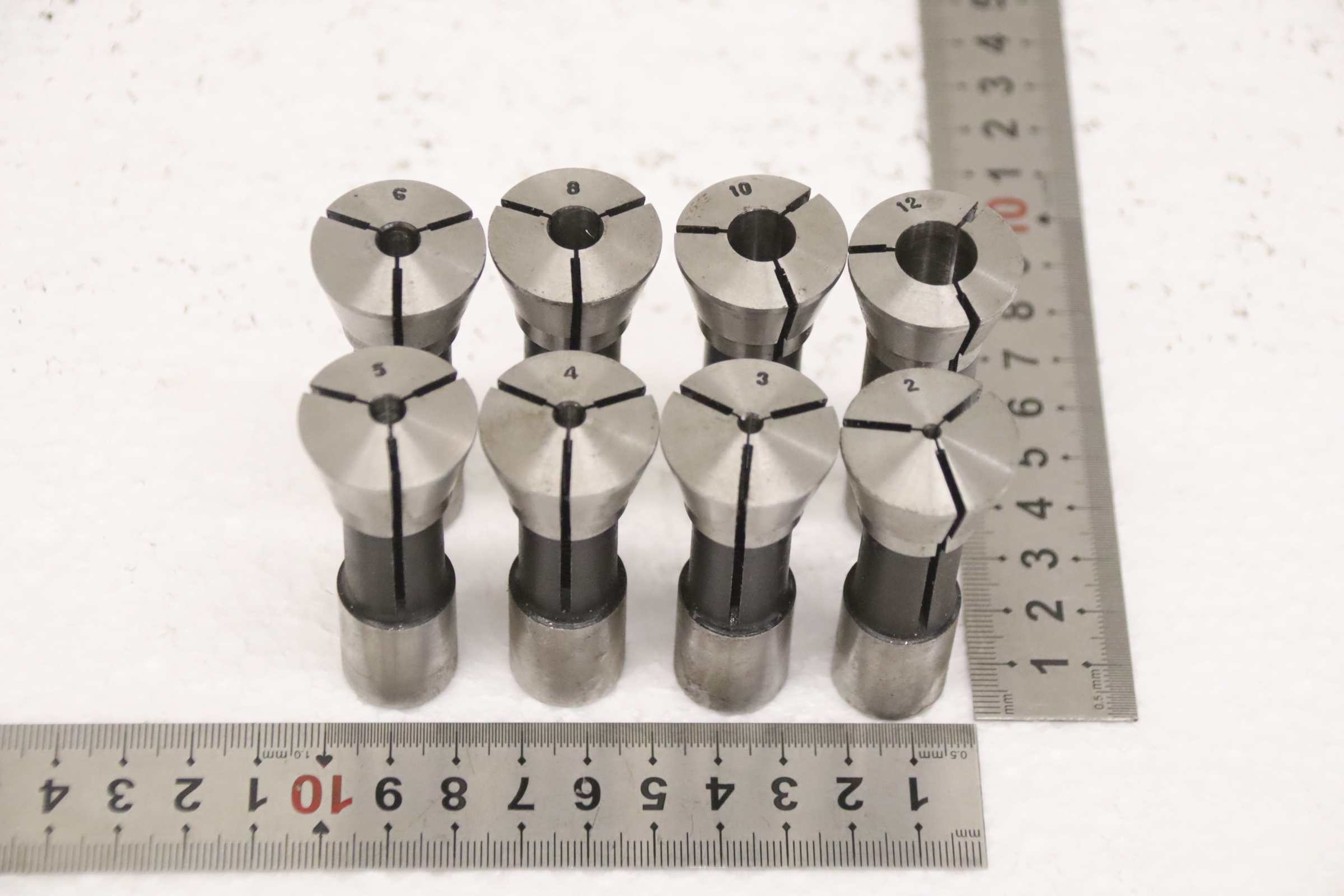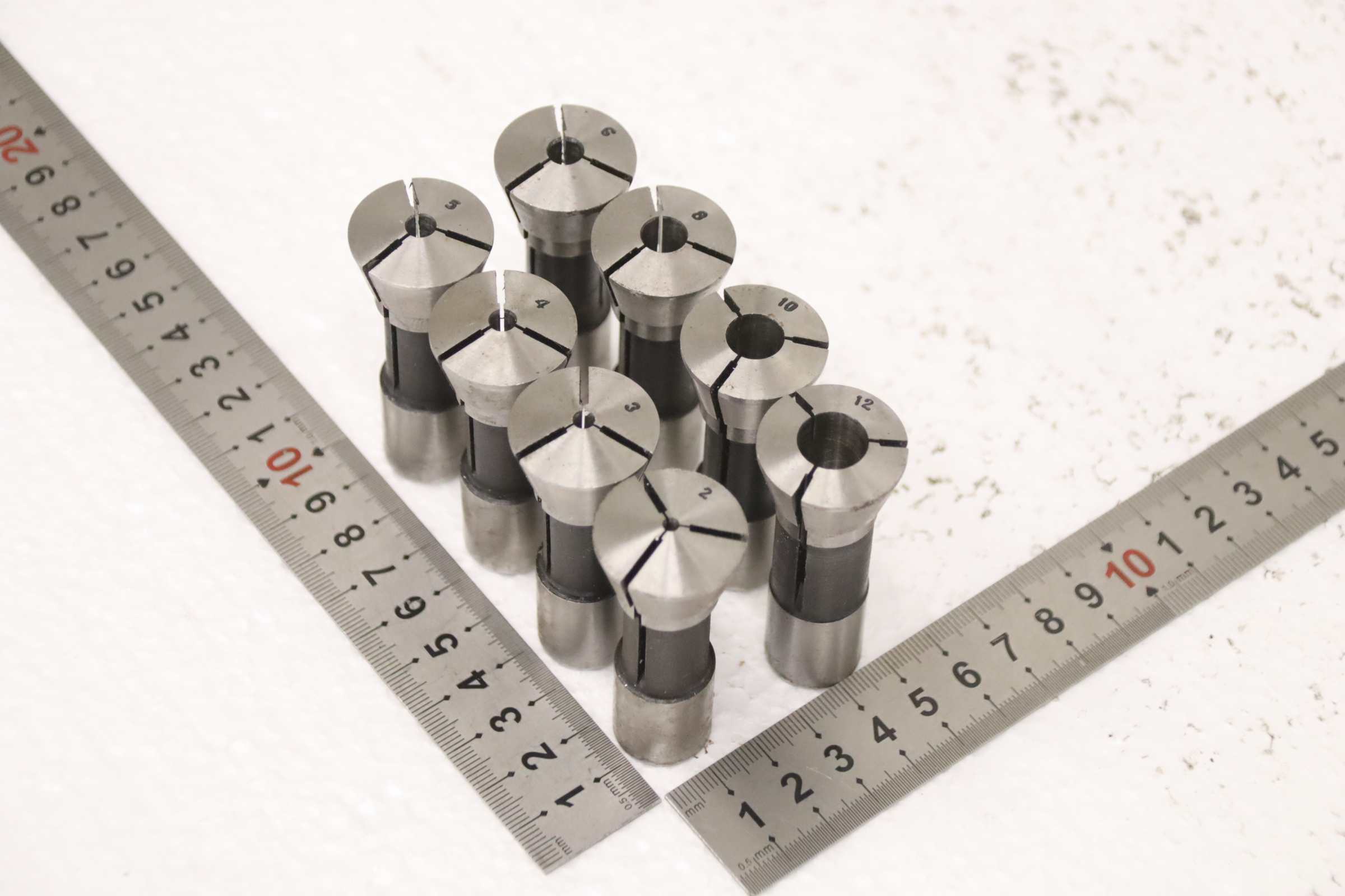 Collet head, pressure collet, collet sleeves, collet, tool holder, tool holder, milling chuck, milling tool, collets -Clamping sleeves: Length 65 mm, 8 pieces -Sizes: Ø 2 - 12 mm, see photos / parts list -Price/Fee: complete -Transport dimensions: 110/60/H65 mm -Weight: 0.7 kg