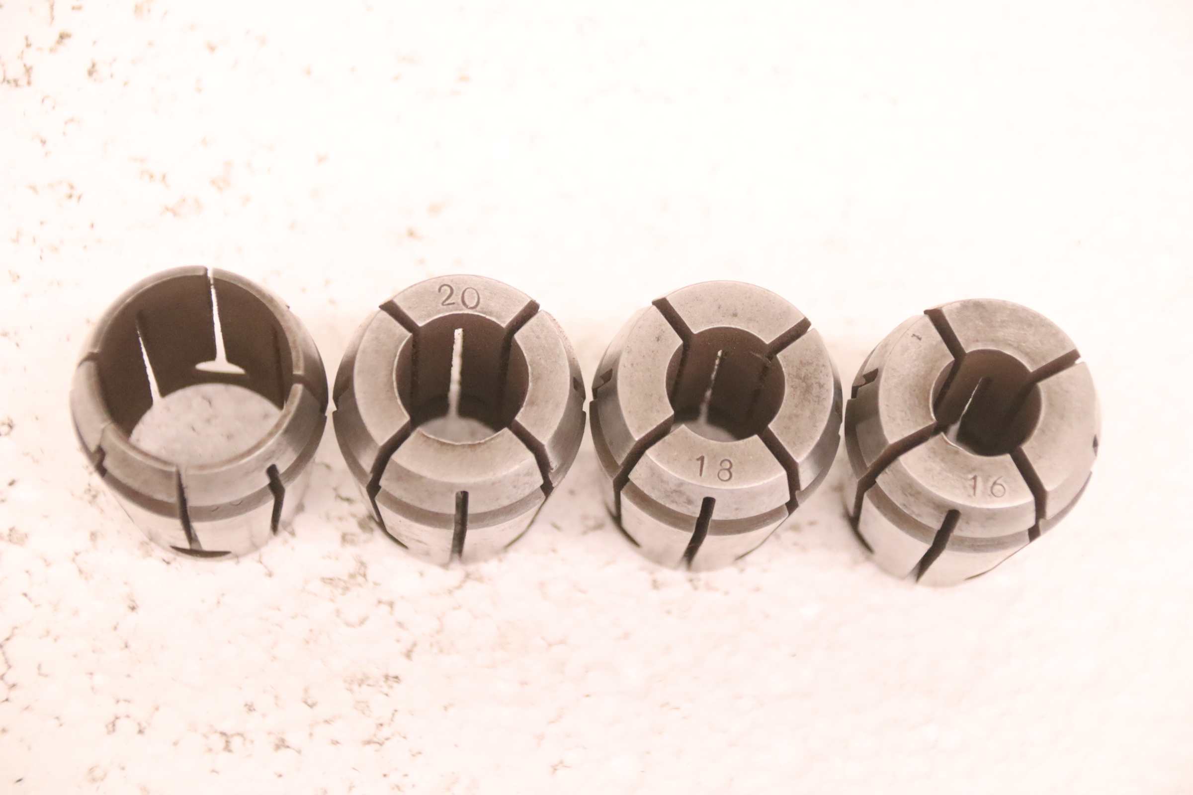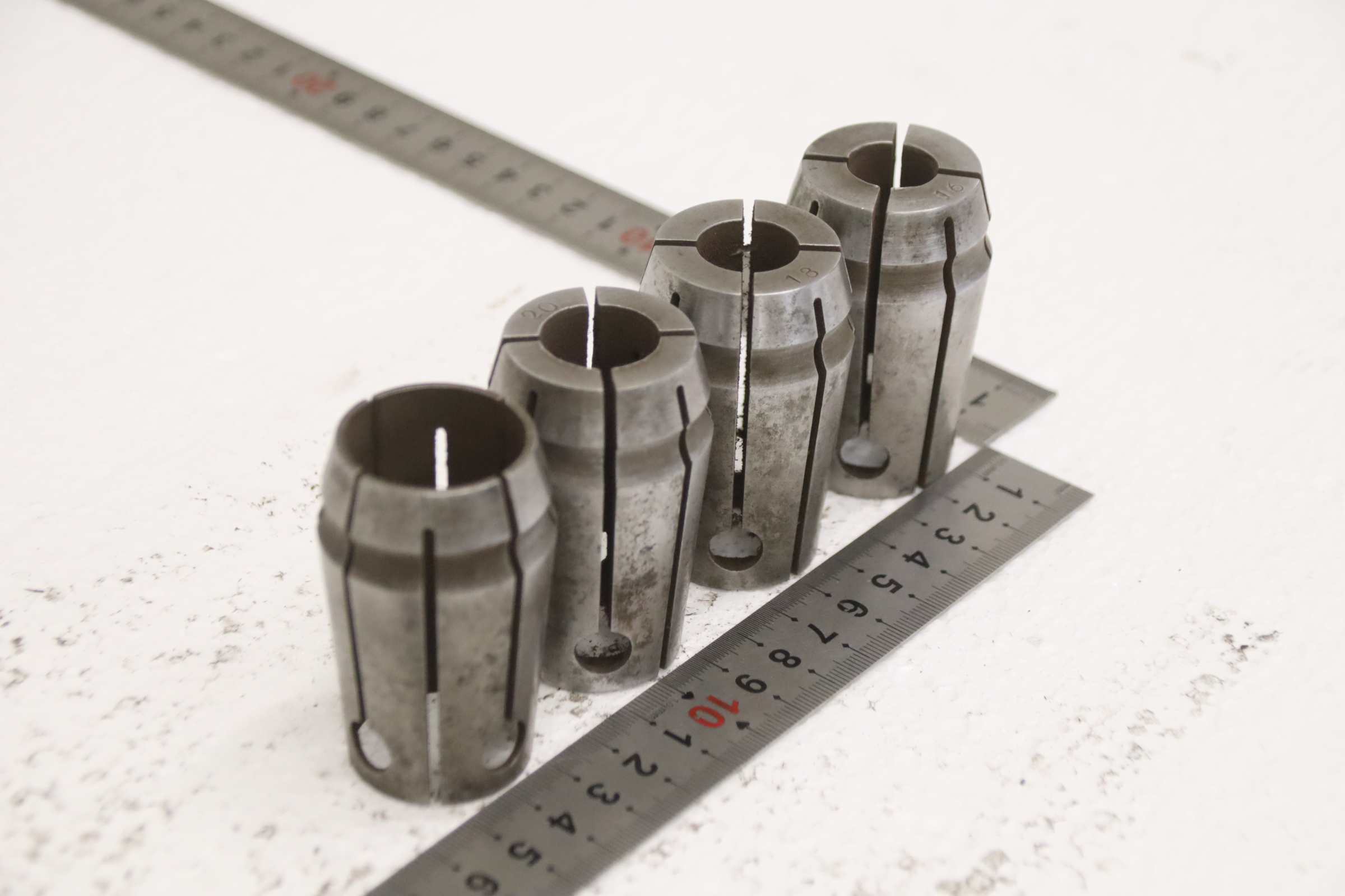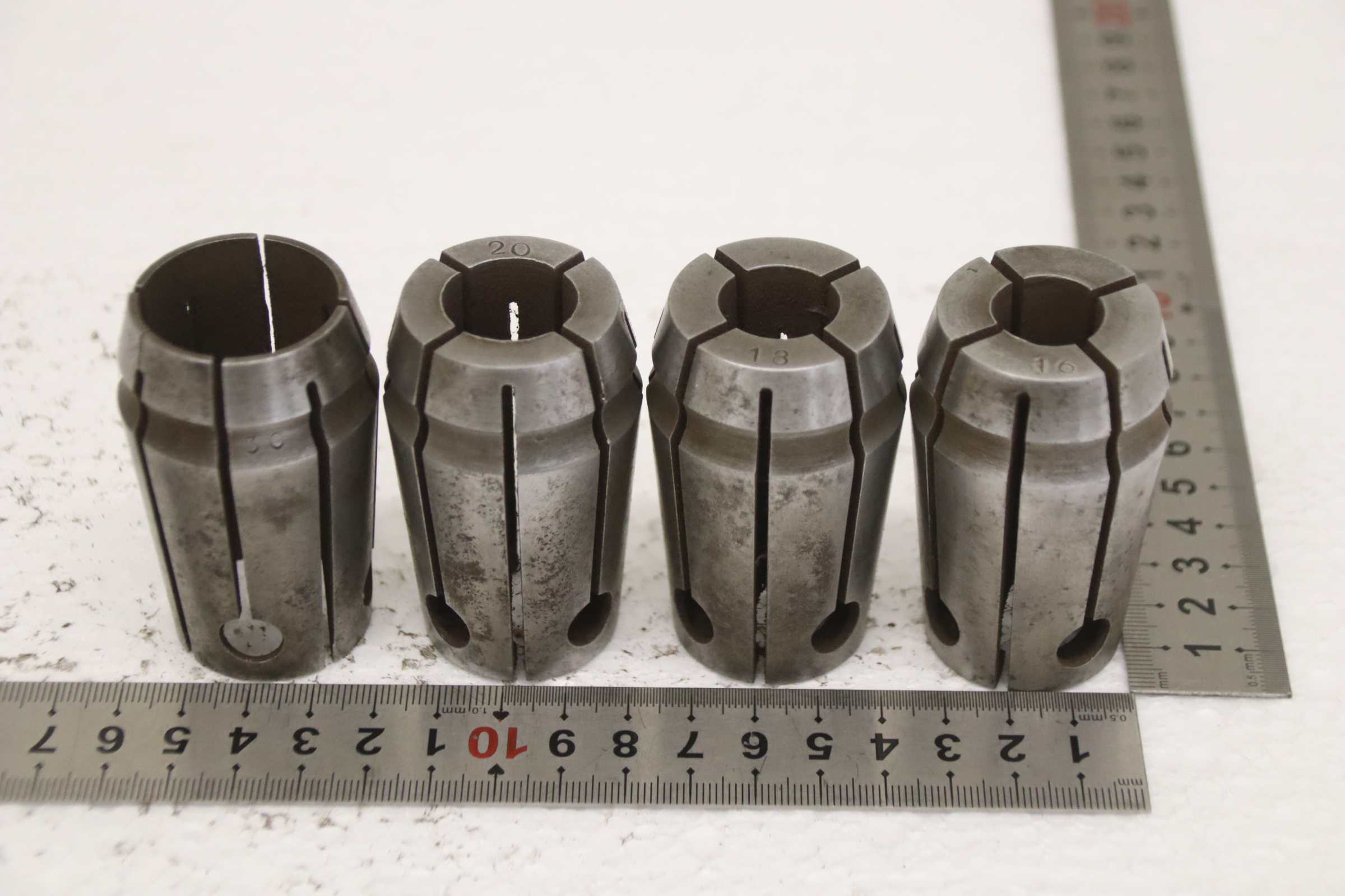Collet head, pressure collet, collet sleeves, collet, tool holder, tool holder, milling chuck, milling tool, collets -Clamping sleeves: Length 65 mm, 4 pieces -Sizes: Ø 16/18/20/30 mm, see photos -Price/Fee: complete -Transport dimensions: 80/80/H65 mm -Weight: 1.0 kg