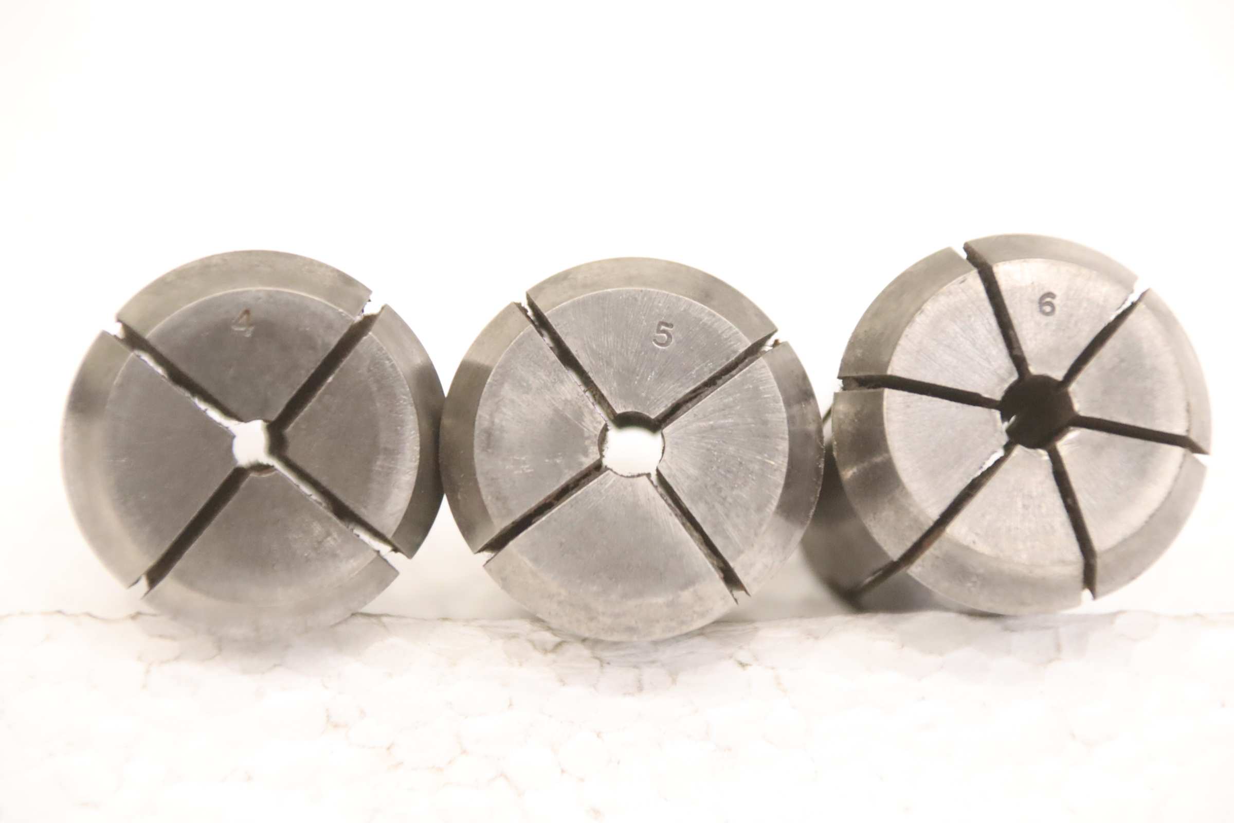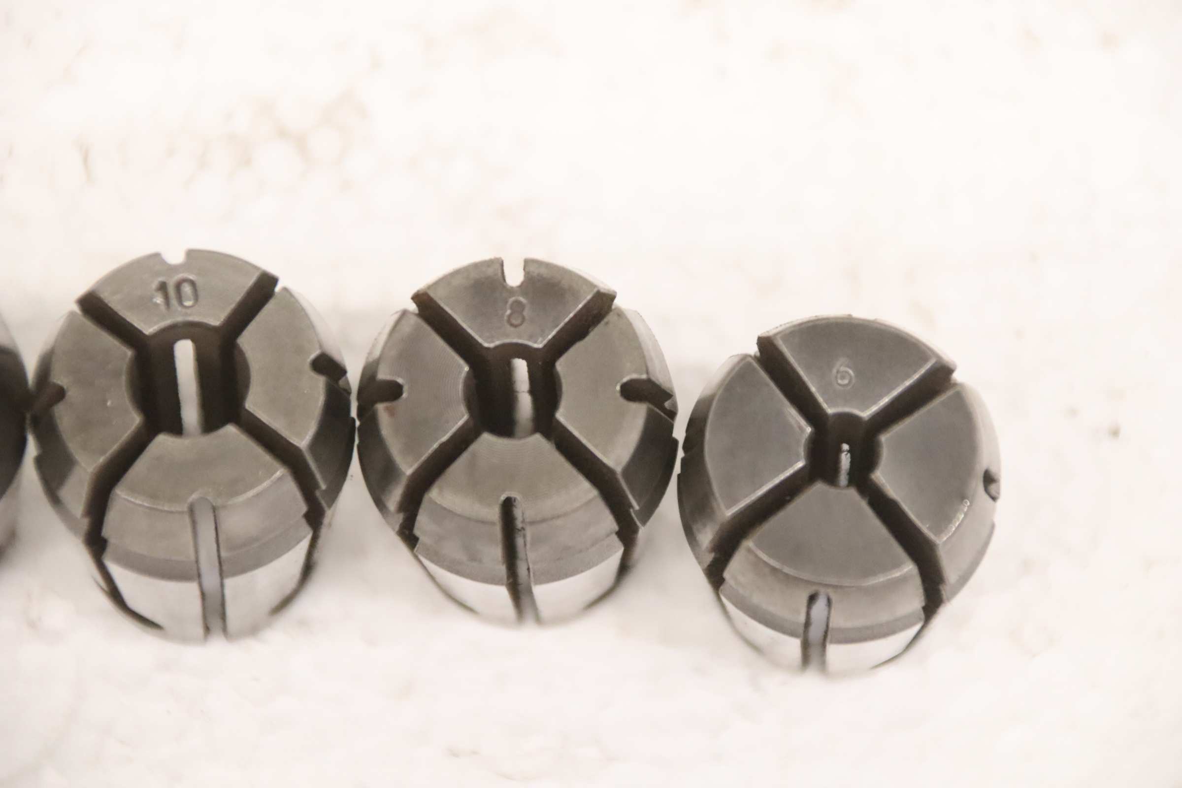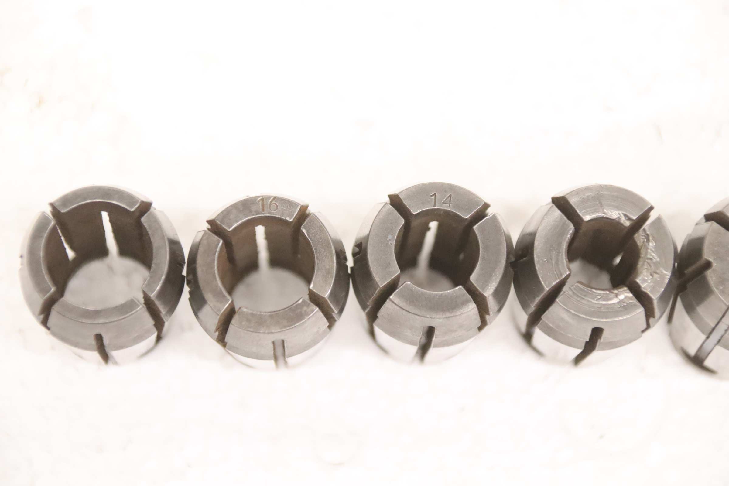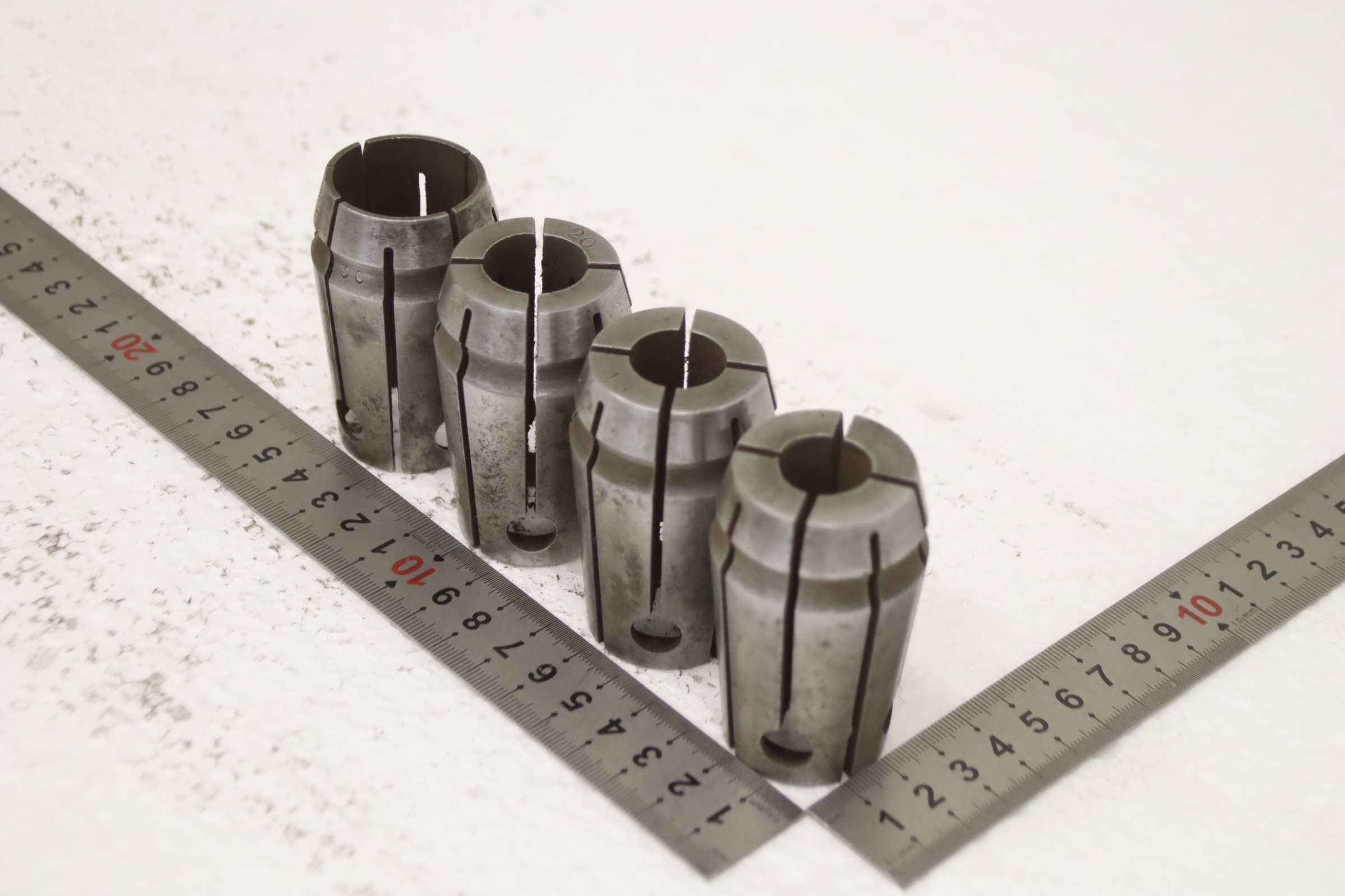 Collet head, pressure collet, collet sleeves, collet, tool holder, tool holder, milling chuck, milling tool, collets -Clamping sleeves: Length 65 mm, 4 pieces -Sizes: Ø 16/18/20/30 mm, see photos -Price/Fee: complete -Transport dimensions: 80/80/H65 mm -Weight: 1.0 kg