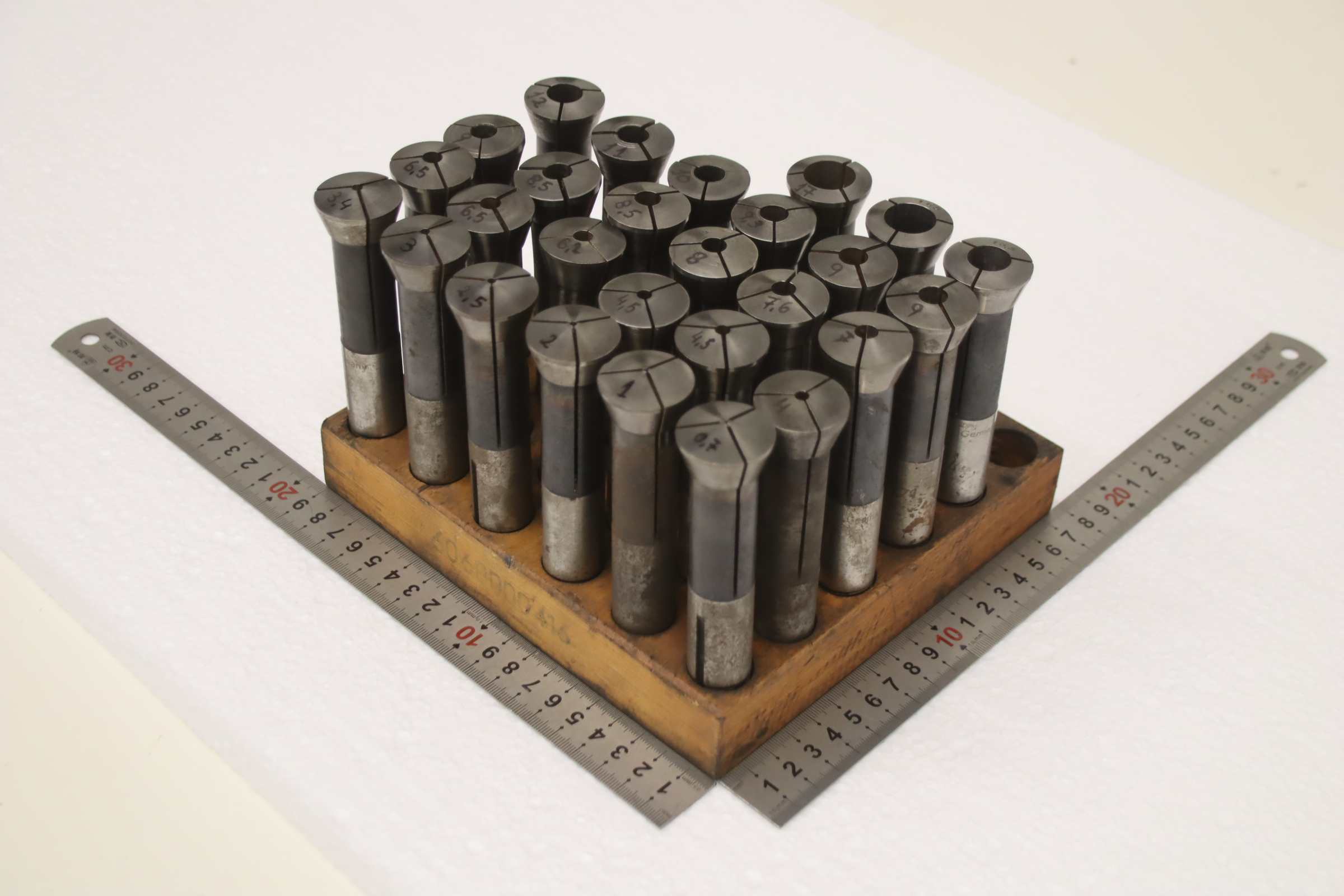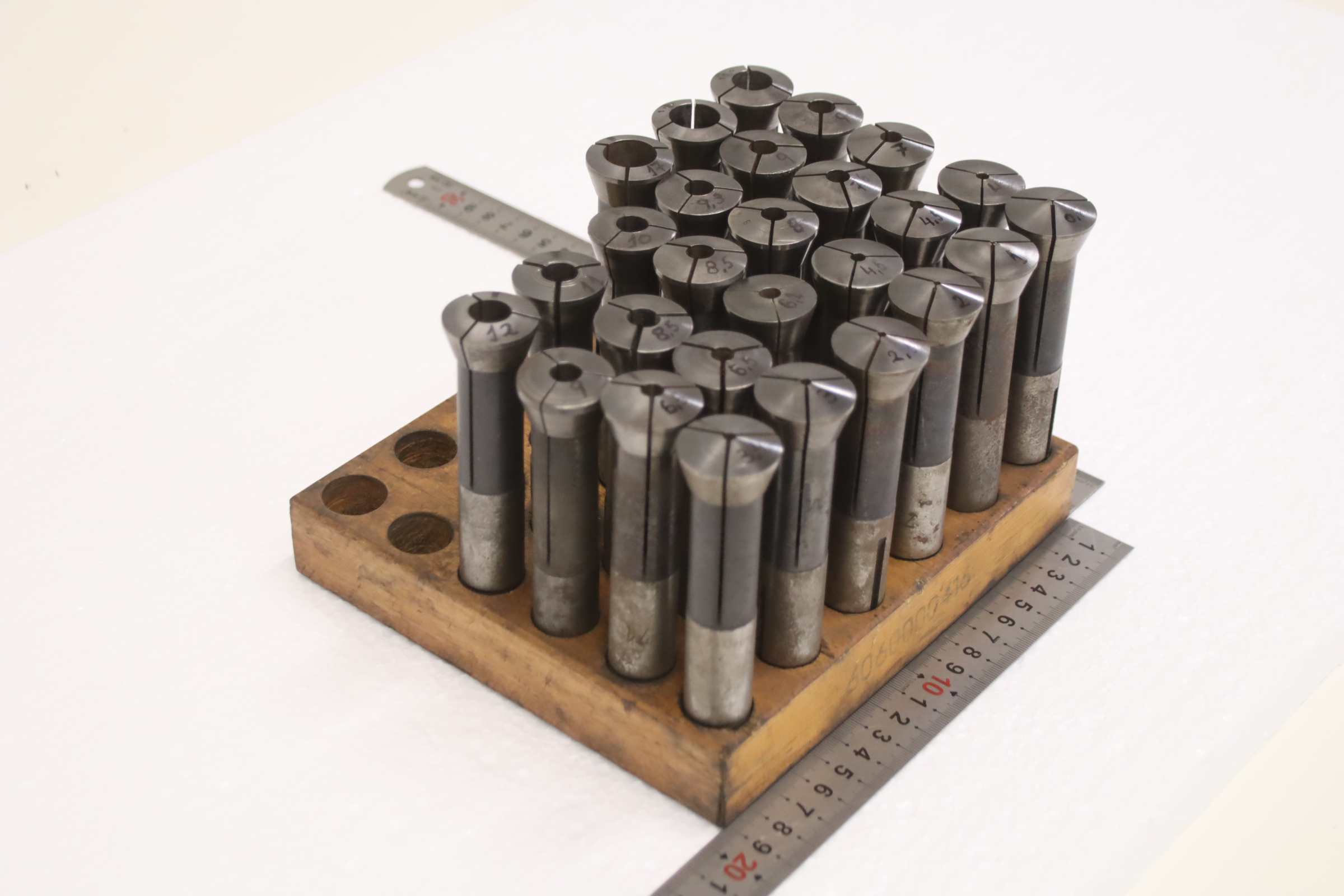Collet head, pressure collet, collet sleeves, collet, tool holder, tool holder, milling chuck, milling tool, collets -Clamping sleeves: Length 125 mm, 27 pieces -Sizes: Ø 0.7 - 17 mm, see photos / parts list -Price/Fee: complete -Transport dimensions: 195/180/H130 mm -Weight: 4.7 kg