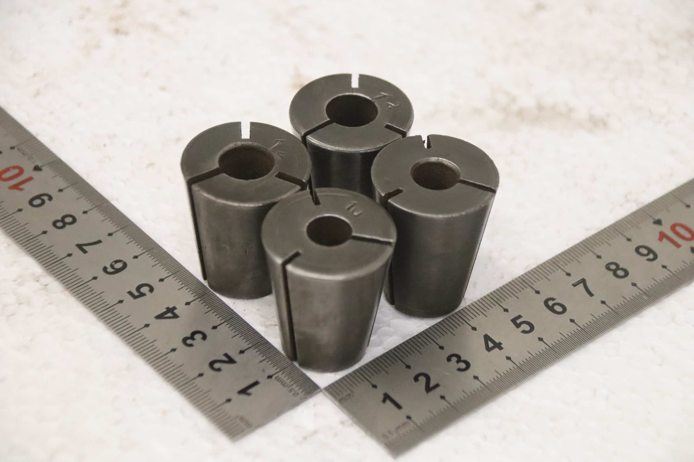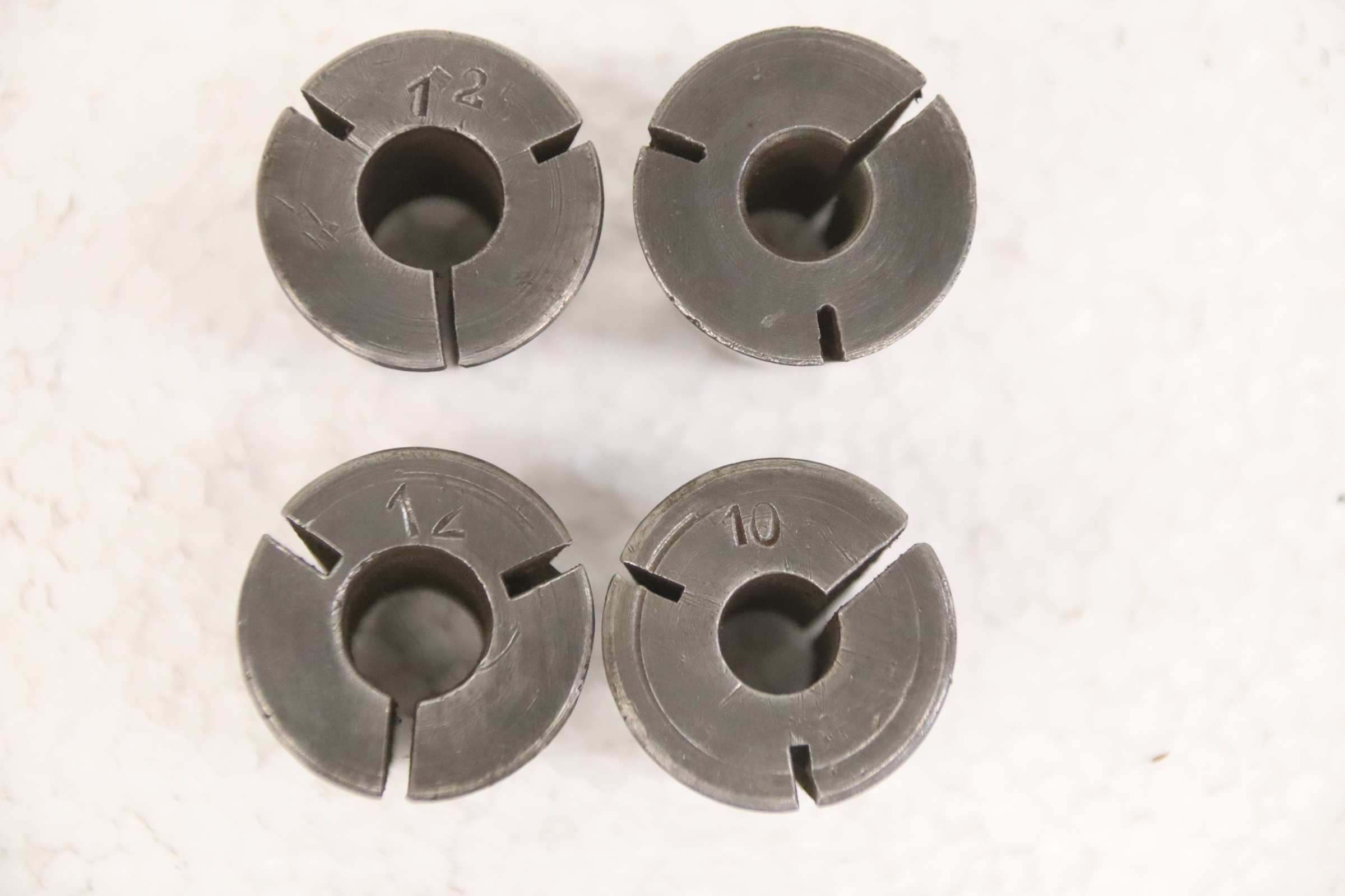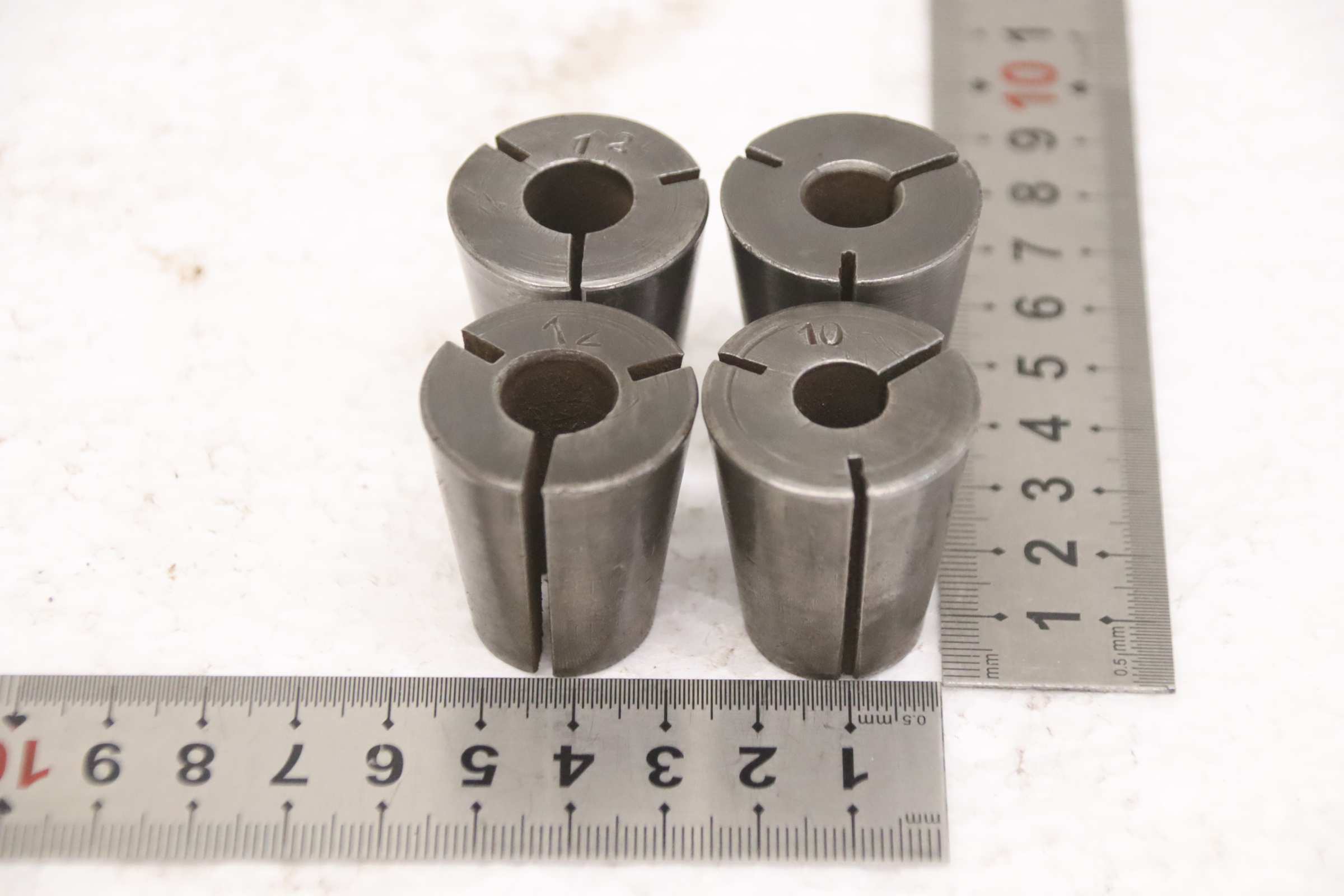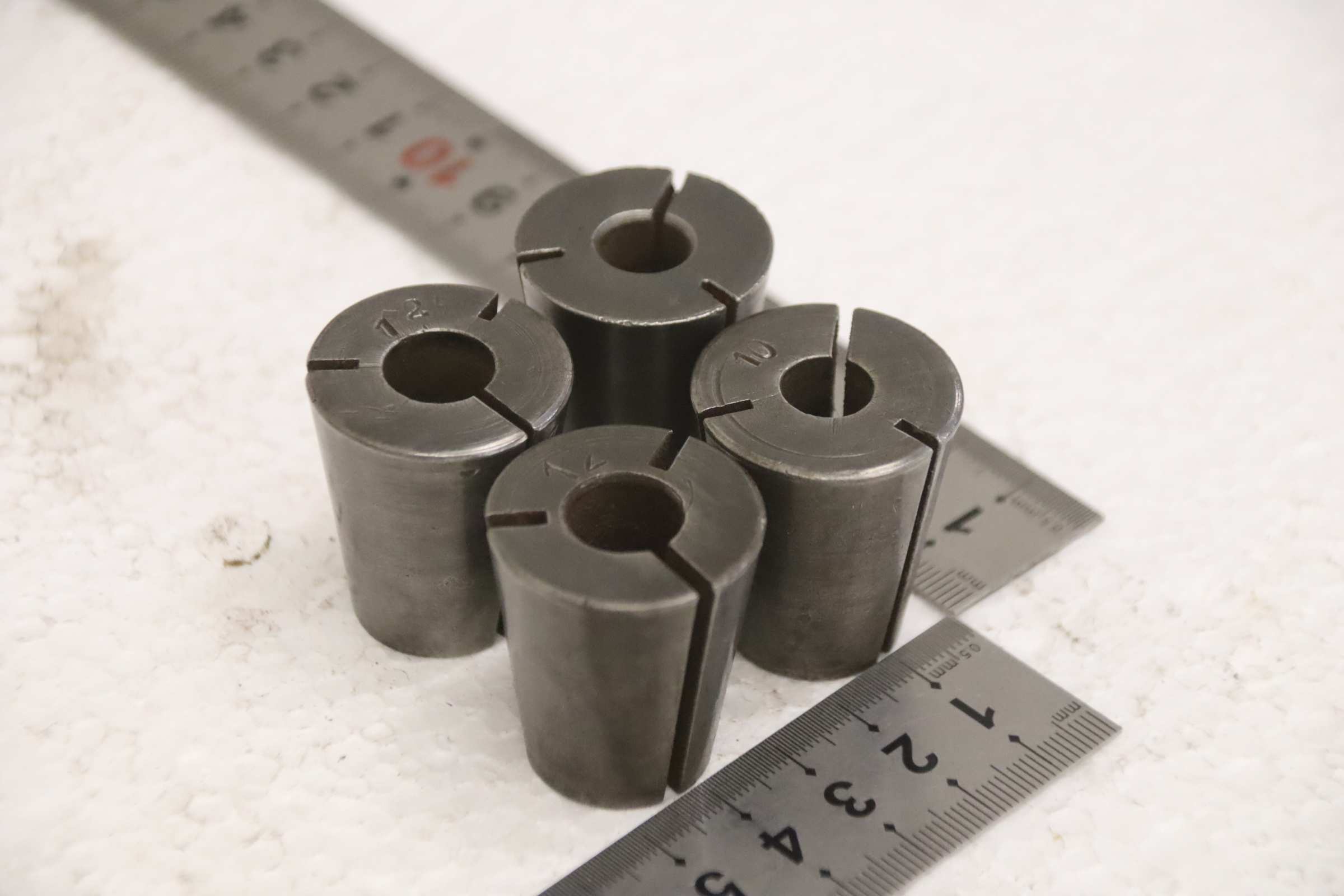 Collet head, pressure collet, collet sleeves, collet, tool holder, tool holder, milling chuck, milling tool, collets -Clamping sleeves: Length 35 mm, 4 pieces -Sizes: 2x Ø 10/12 mm each, see photos -Price/Fee: complete -Transport dimensions: 60/60/H35 mm -Weight: 0.4 kg