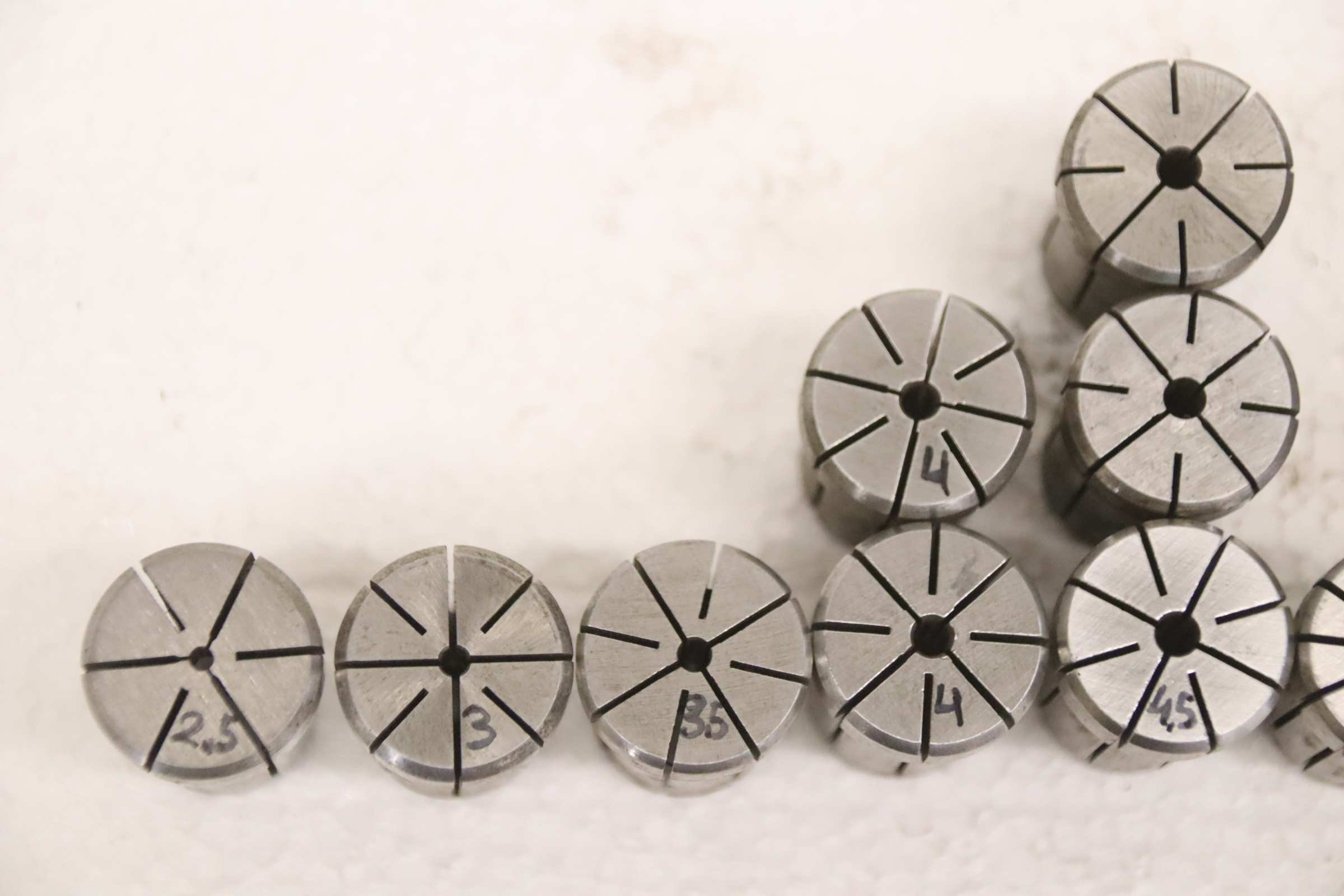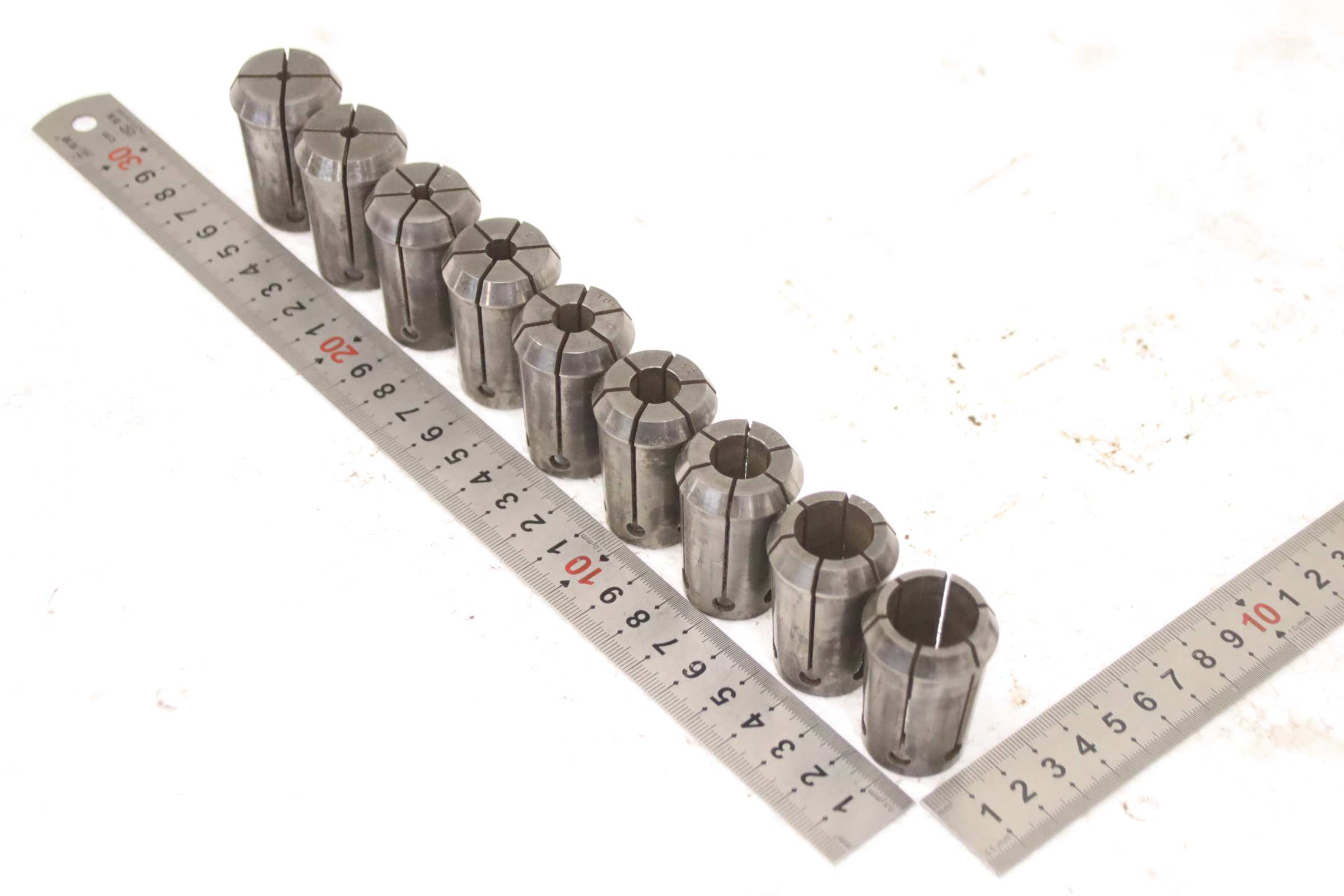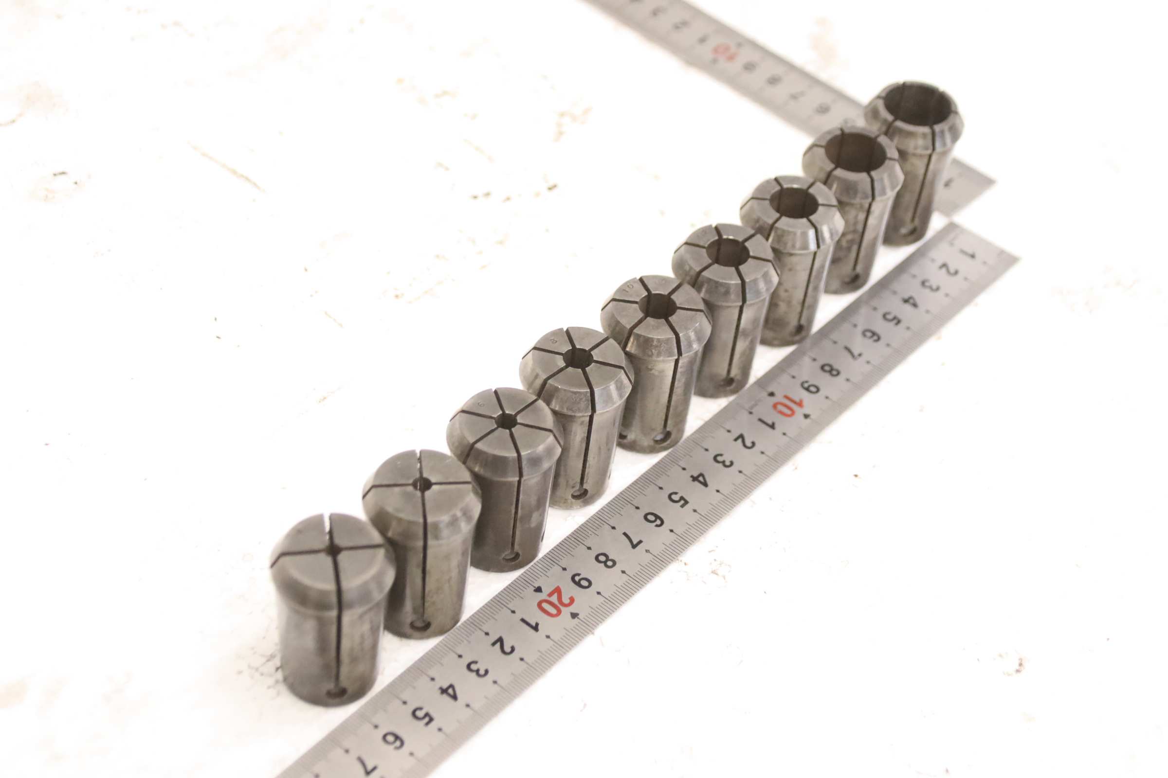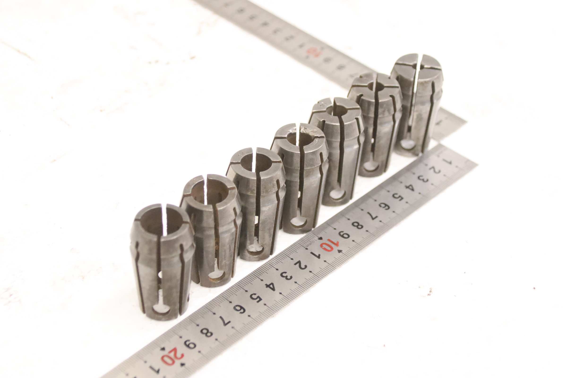 Collet head, pressure collet, collet sleeves, collet, tool holder, tool holder, milling chuck, milling tool, collets -Clamping sleeves: Length 45 mm, 9 pieces -Sizes: Ø 4/5/6/8/10/12/14/18/20 mm, see photos -Price/Fee: complete -Transport dimensions: 100/100/H45 mm -Weight: 1.0 kg