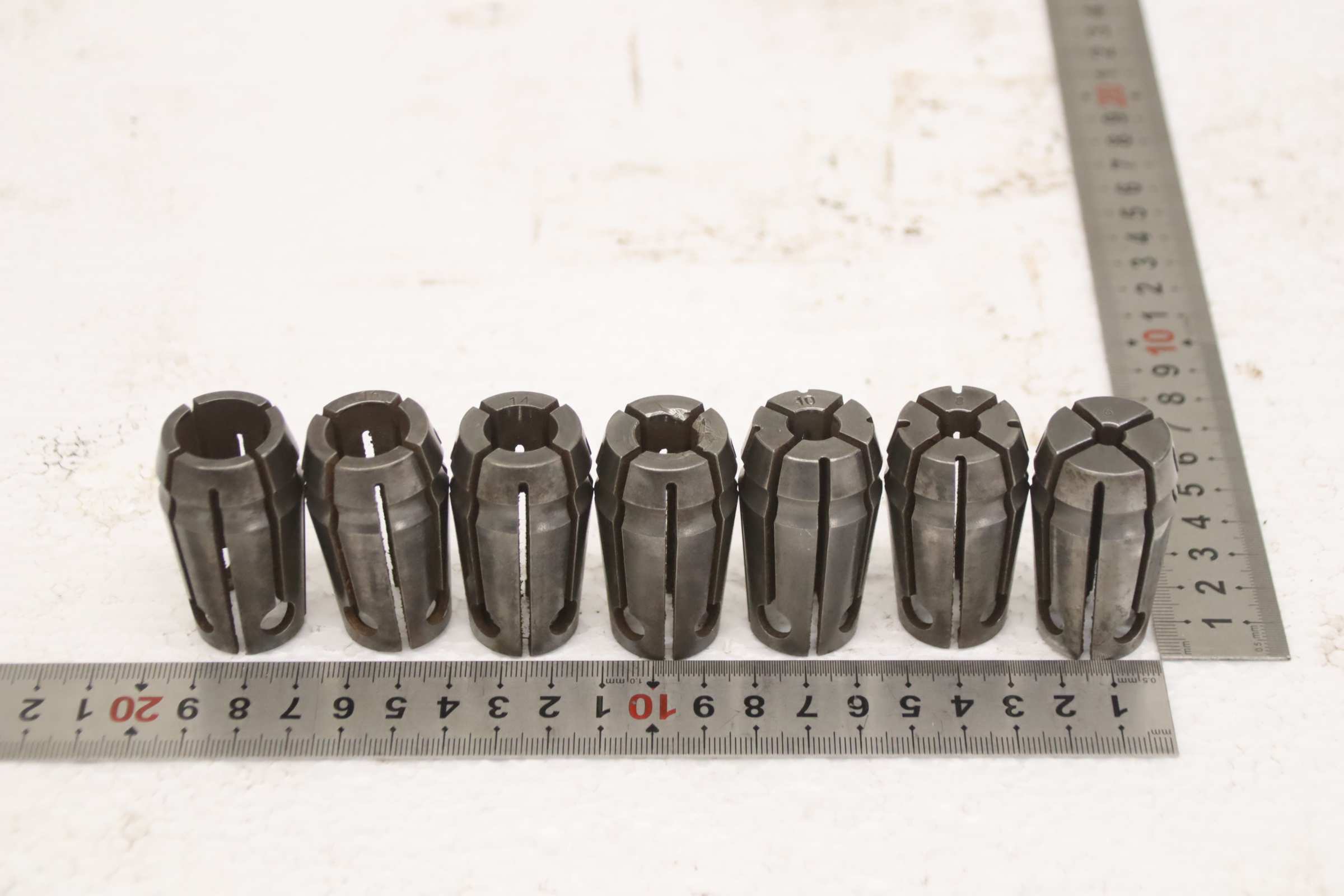 Collet head, pressure collet, collet sleeves, collet, tool holder, tool holder, milling chuck, milling tool, collets -Clamping sleeves: Length 50 mm, 7 pieces Sizes: Ø 6/8/10/12/14/16/18 mm, see photos -Price/Fee: complete -Transport dimensions: 115/60/H50 mm Weight: 0.7 kg