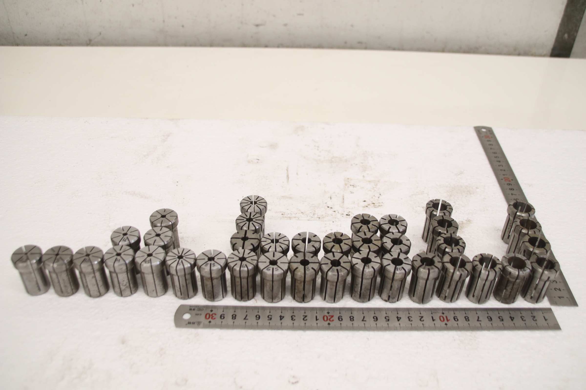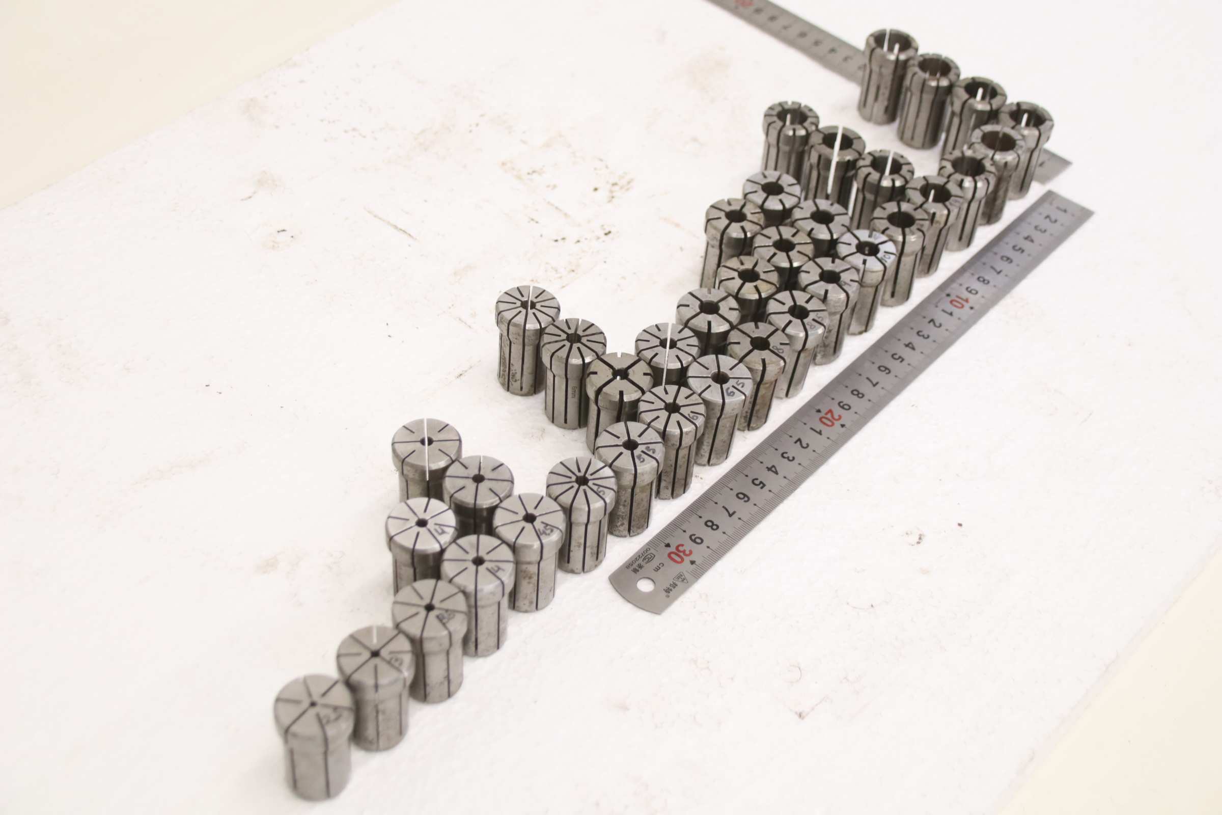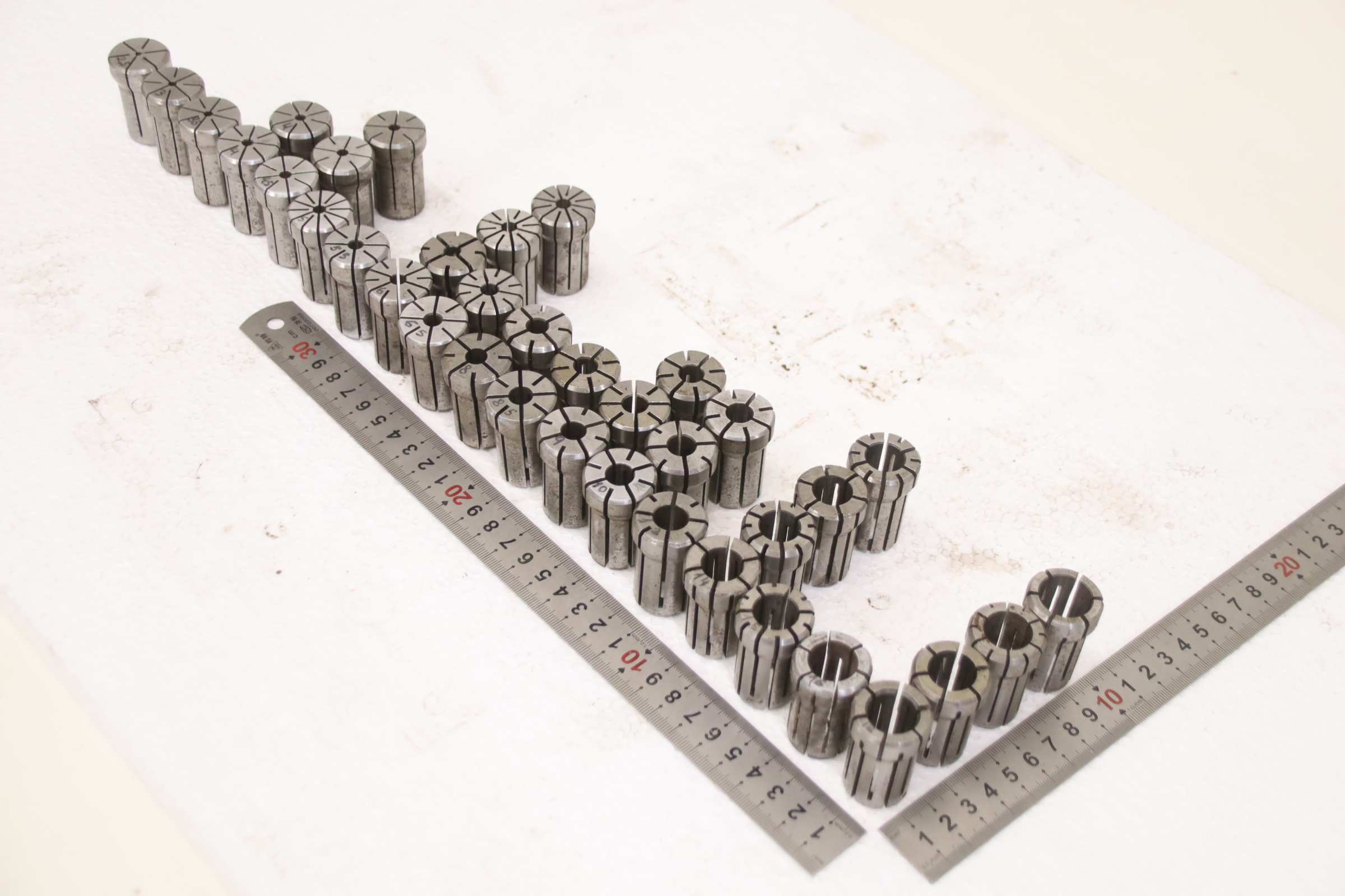 Collet head, pressure collet, collet sleeves, collet, tool holder, tool holder, milling chuck, milling tool, collets -Clamping sleeves: Length 42 mm, 37 pieces -Sizes: Ø 2.5 - 18 mm, see photos / parts list -Price/Fee: complete -Transport dimensions: 180/160/H42 mm -Weight: 3.0 kg