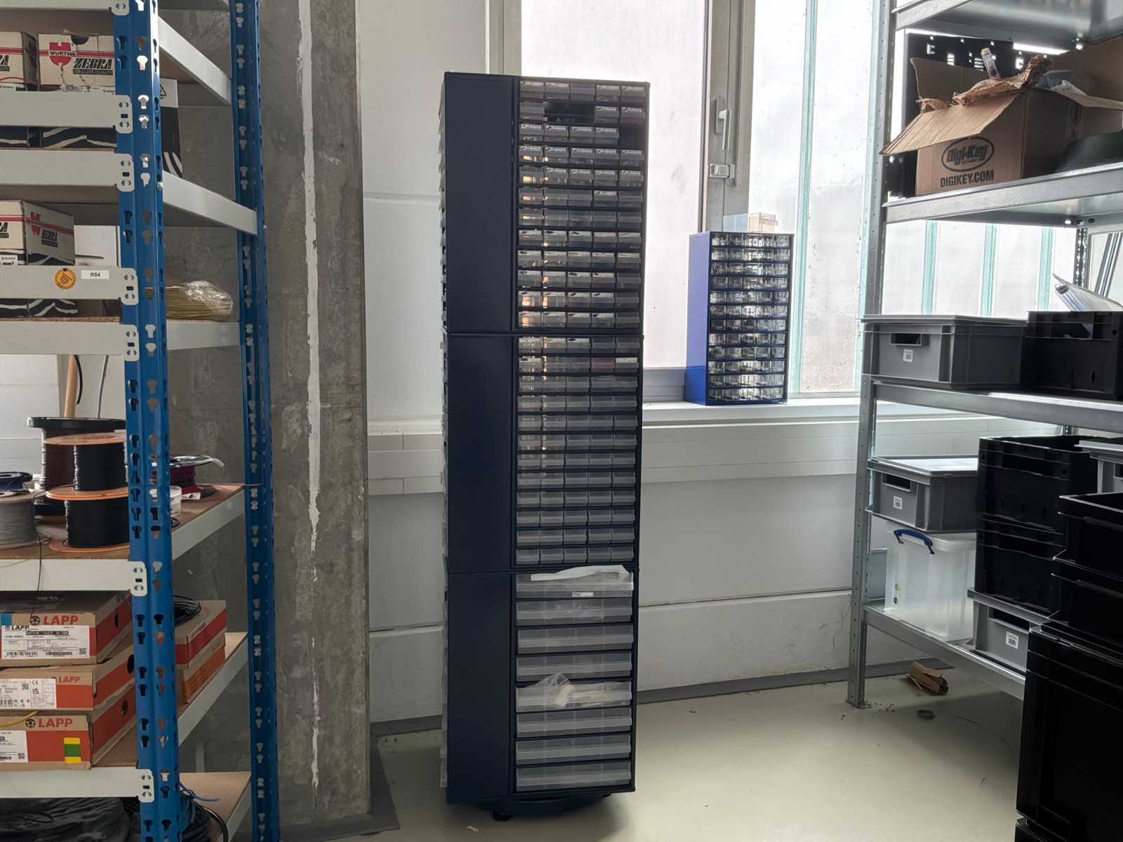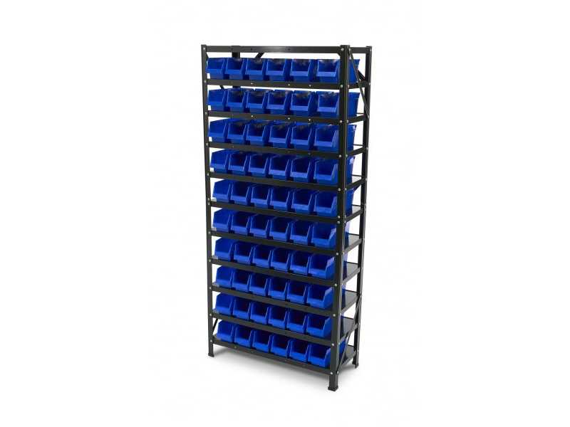 Shelf with 60 storage boxes. External dimensions of the boxes 100 x 295 x 105mm. Packaging dimensions 420 x 340 x 930mm. Weight approx. 30 kg. Storage spaces 60 boxes Weight 30 kg Dimensions L x D x H 780 x 320 x 1670mm Condition: never used / new (5) Auction-ID: A1-45681-729