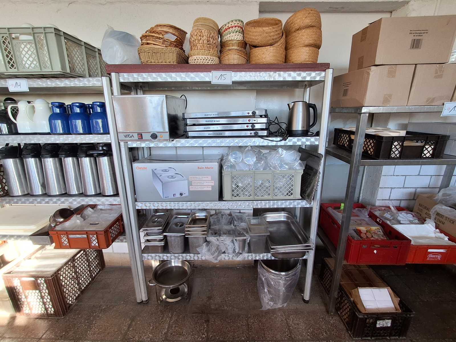 Aluregal BRÖKELMANN FWB with contents, bread + bread baskets + Buffetking warming plates, chopping boards + Baitscher Bain Marie + VEGA Bain Marie + kettle + GN container various sizes + stainless steel bucket Auction-ID: A7-45677-15