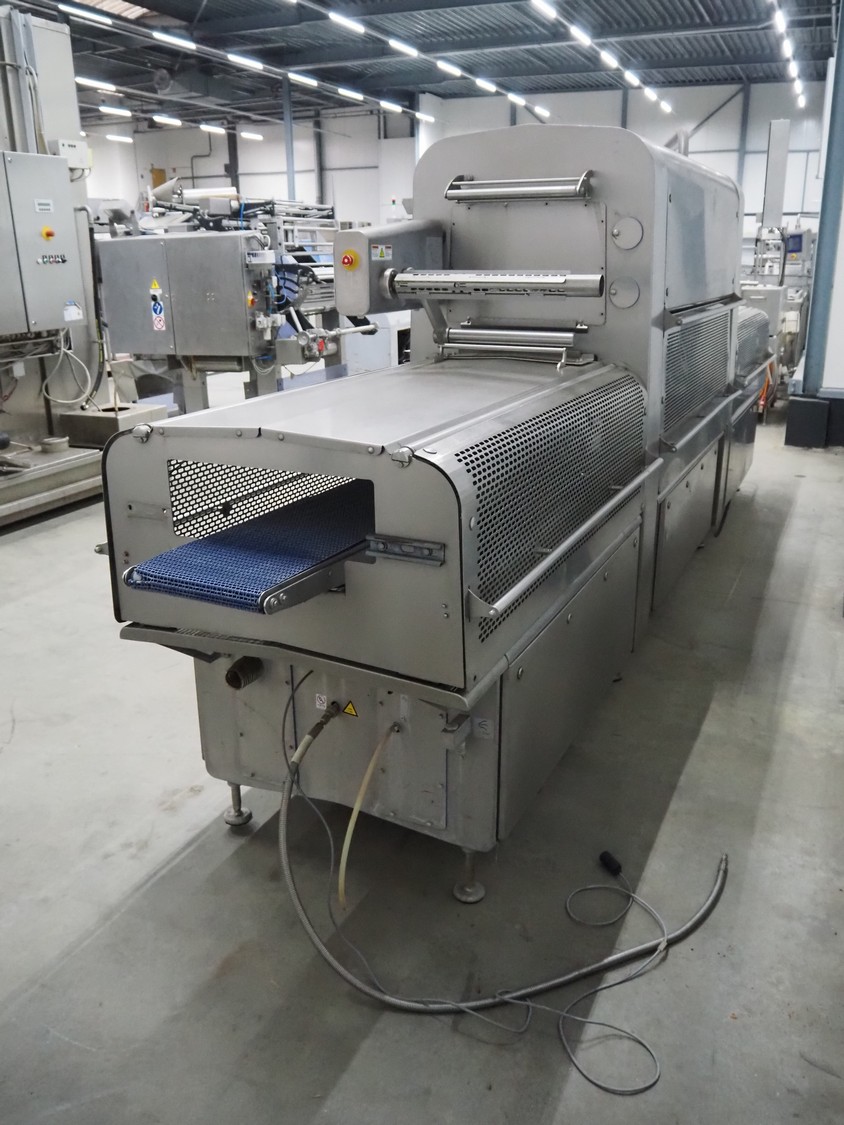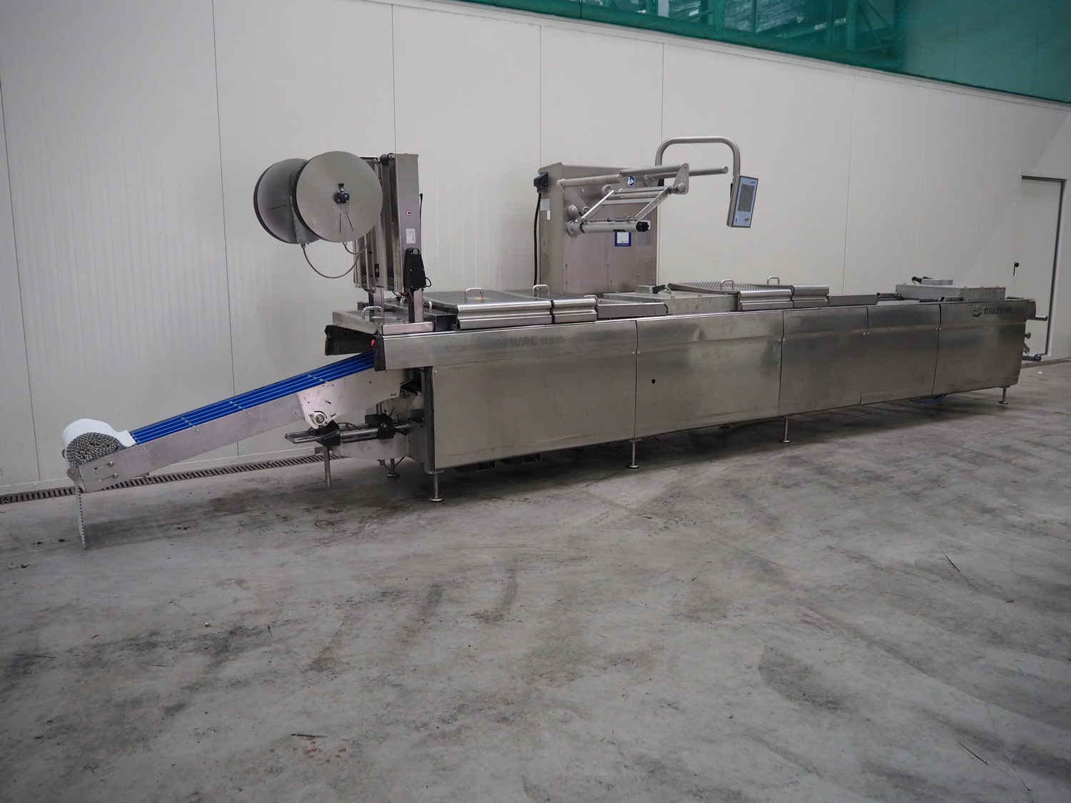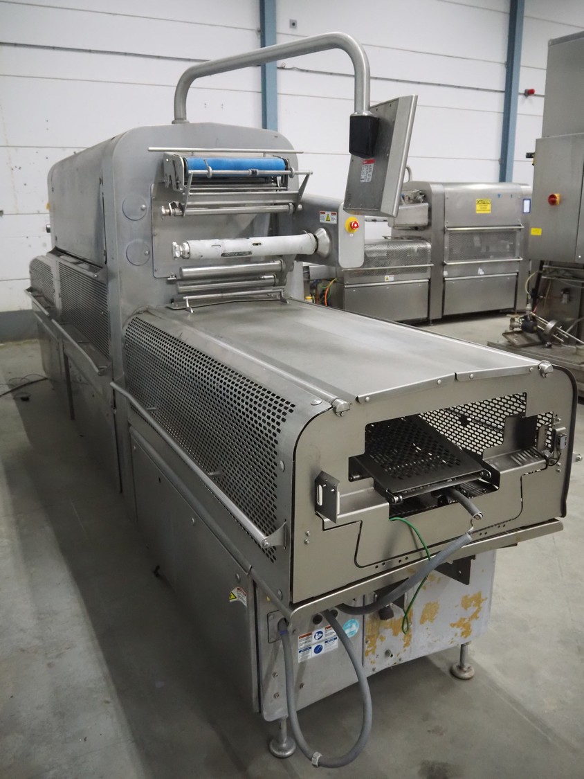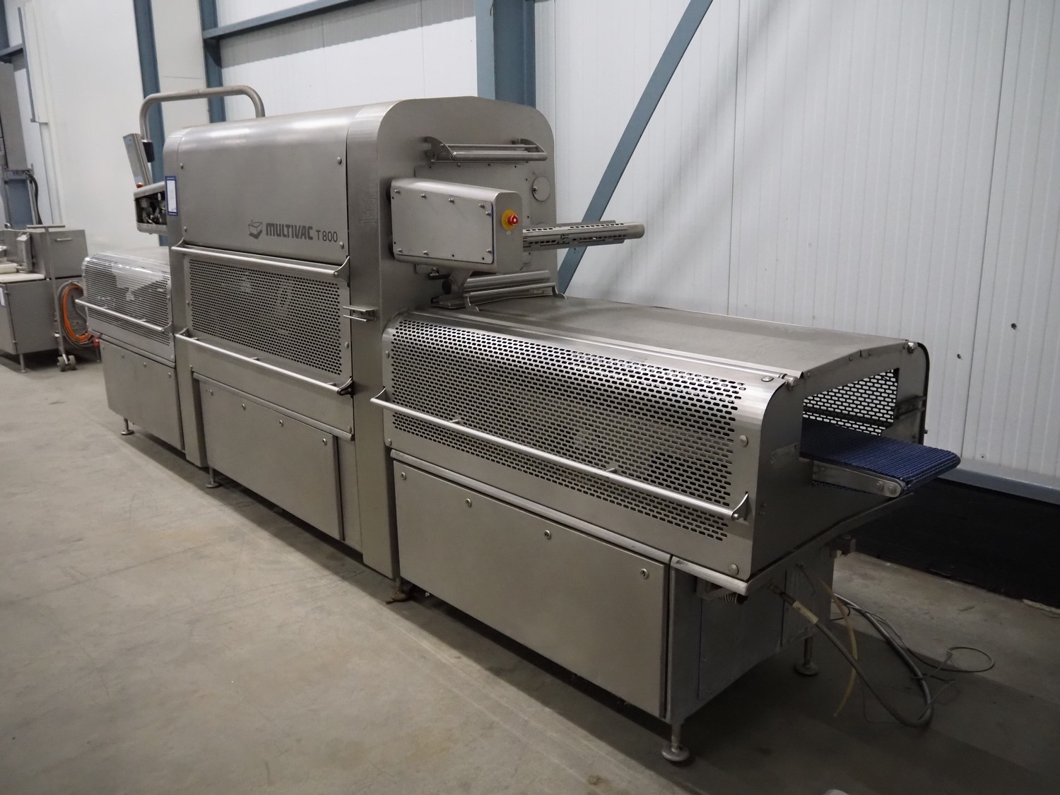 Multivac traysealer, model: T 800, plastic mesh belt, belt width: 250 mm, clearance: 350 mm x 170 mm, film width: 520 mm, infeed belt, belt with dividers, belt width: 205 mm, dividers height: 35 mm, distance between dividers: 290 mm, total dimensions: 6450 mm x 1050 mm x 2060 mm.