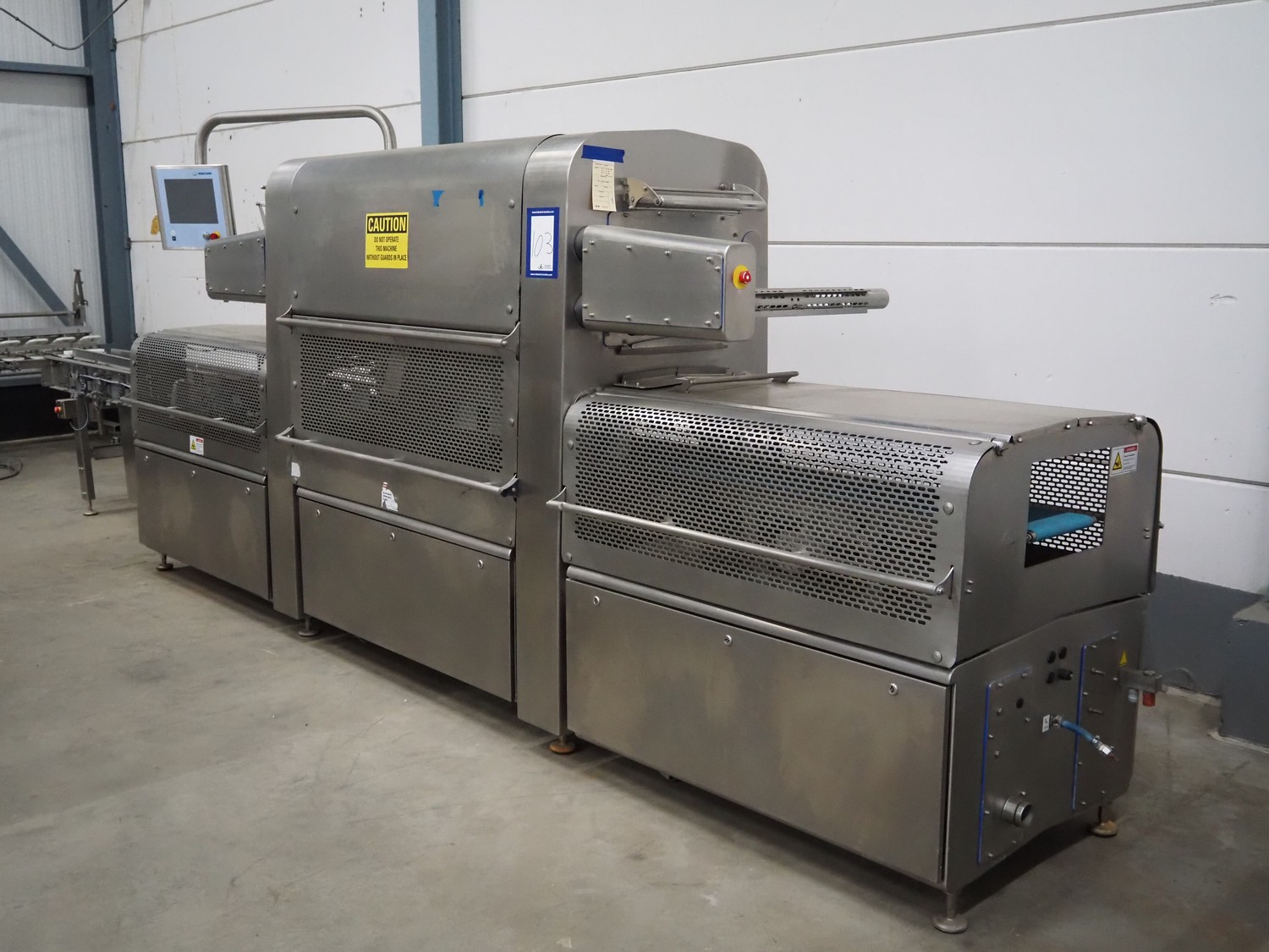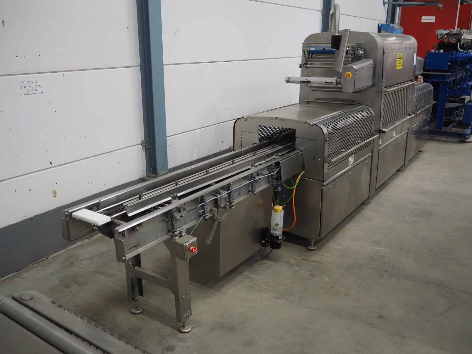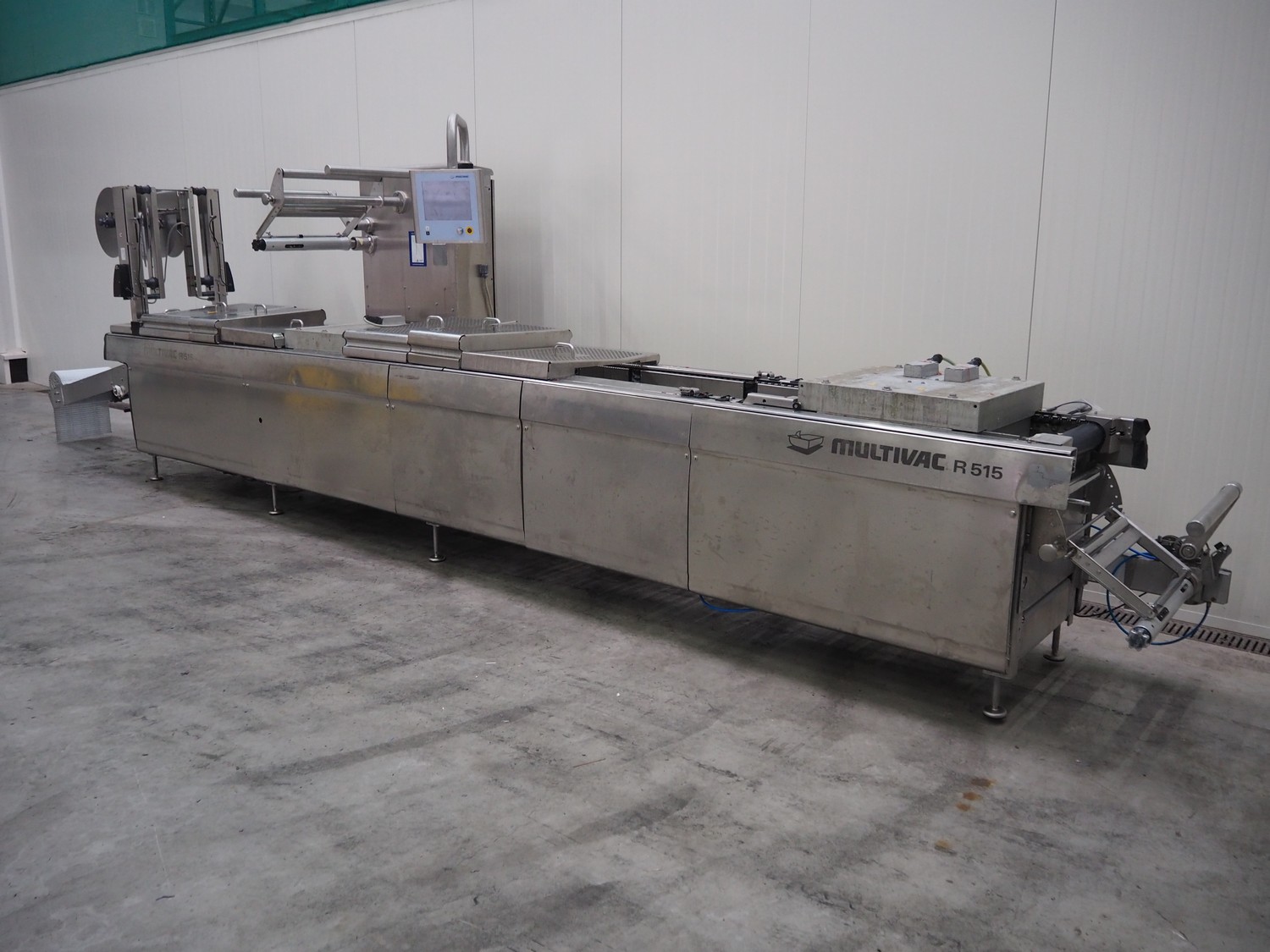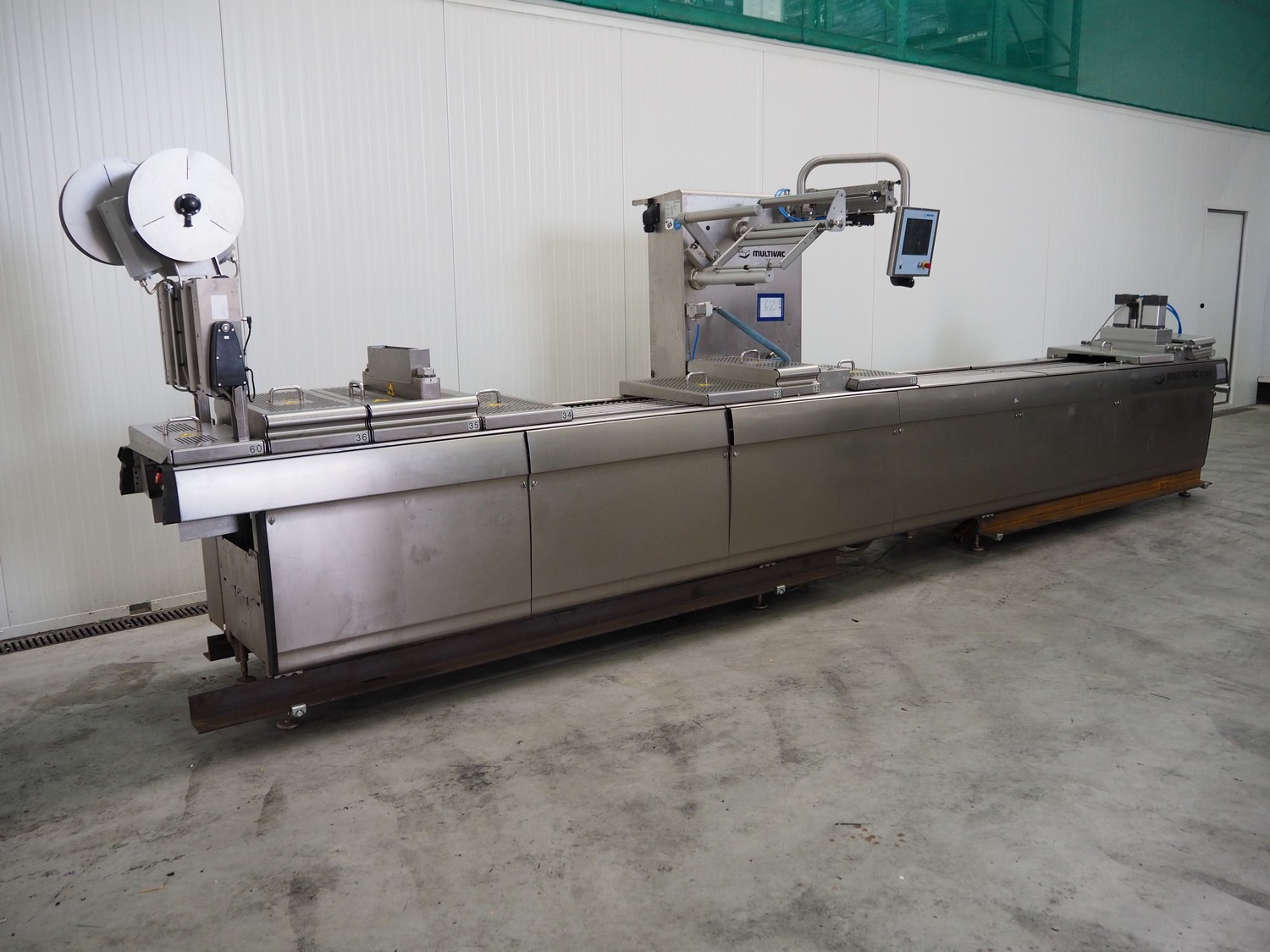 Multivac traysealer, model: T 800, plastic mesh belt, belt width: 250 mm, clearance: 350 mm x 170 mm, film width: 520 mm, infeed belt, belt with dividers, belt width: 205 mm, dividers height: 35 mm, distance between dividers: 290 mm, total dimensions: 6450 mm x 1050 mm x 2060 mm.