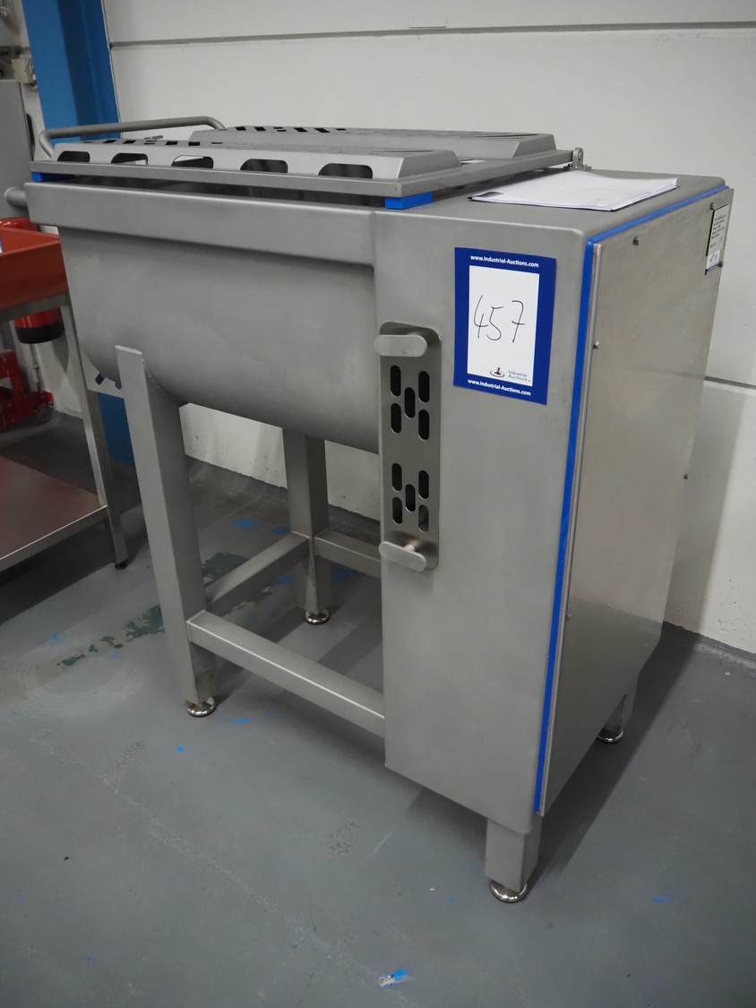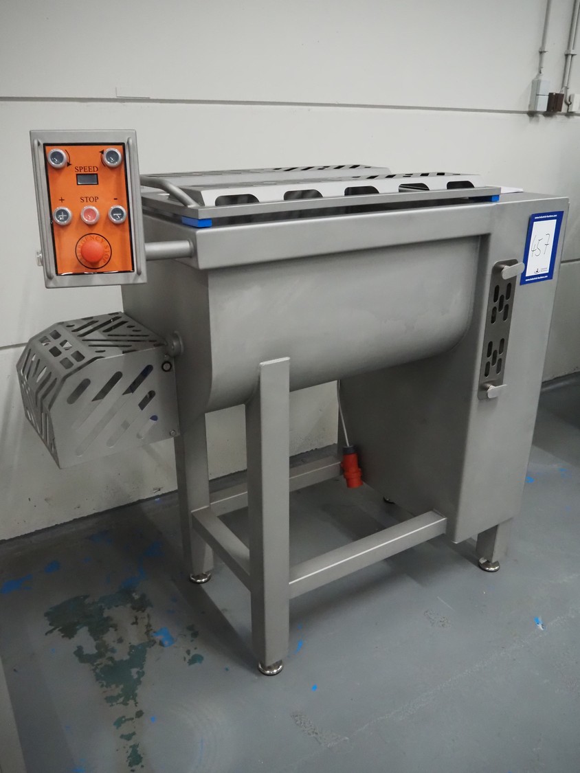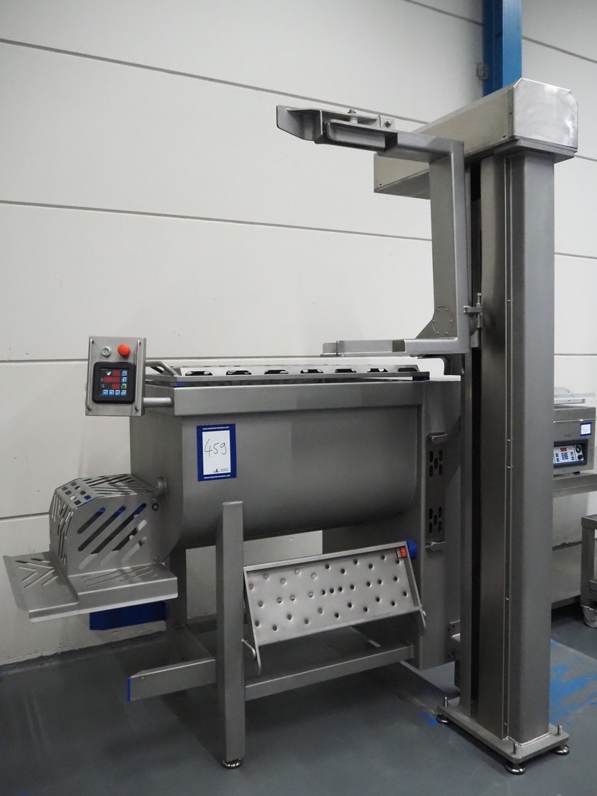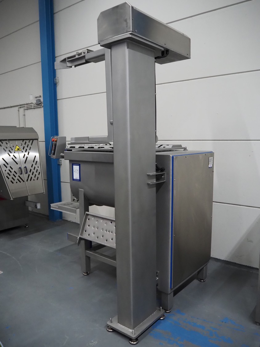 Nesto double shaft paddle mixer with lifter for 200 liter meat bins, type: MIX MAXI-450, serial number: 1030, year of construction: 2026, 400 V, 3 Ph, 4 kW, weight: 620 kg, volume: 450 liter, total dimensions: 2000 mm x 610 mm x 470 mm. Never used.