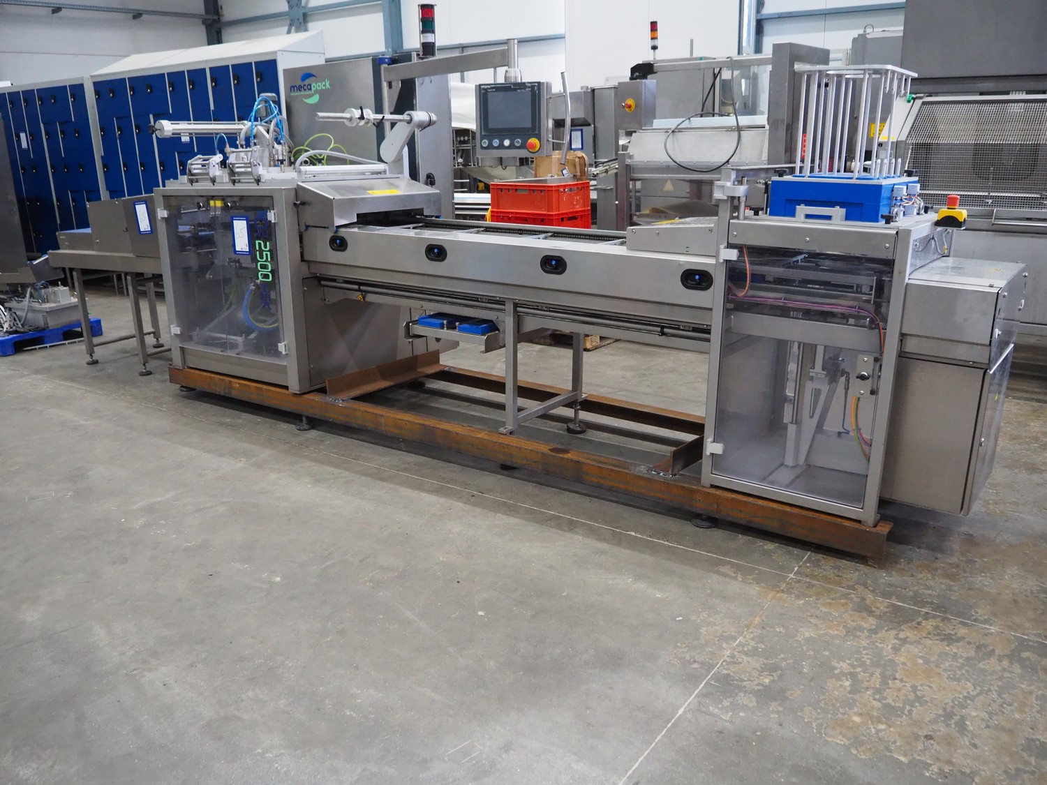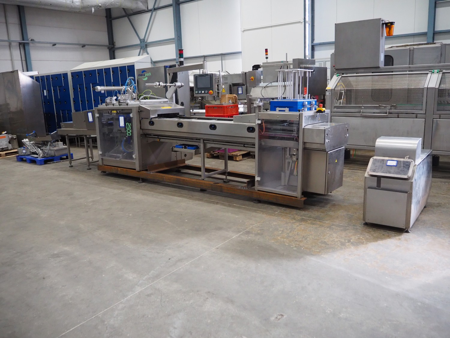 MECAPACK traysealer, type: Q² 2500 HSK, serial number: O08966, year of construction: 2021, 400 V, 3 Ph, 6 A, 16 kW, dye: 225 mm x 200 mm, film width: 460 mm, total dimensions: 4400 mm x 1300 mm x 2100 mm. Including outfeed belt, plastic belt, belt width: 460 mm, total dimensions: 1550 mm x 740 mm x 1180 mm and pallet with parts.