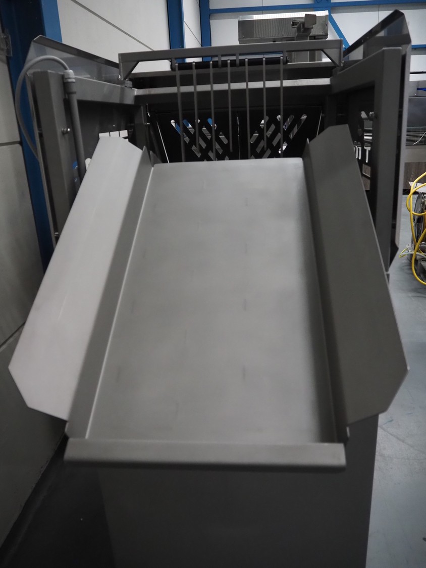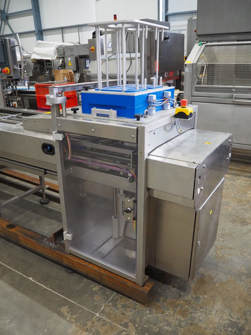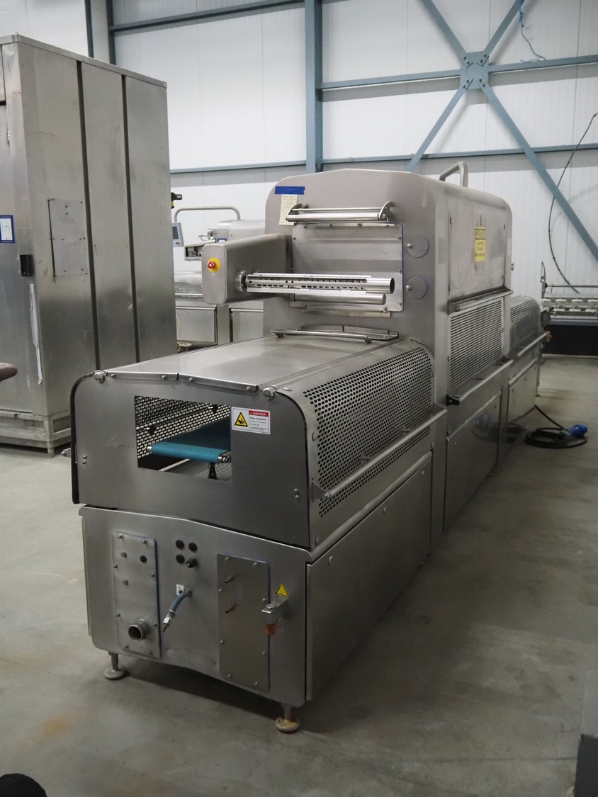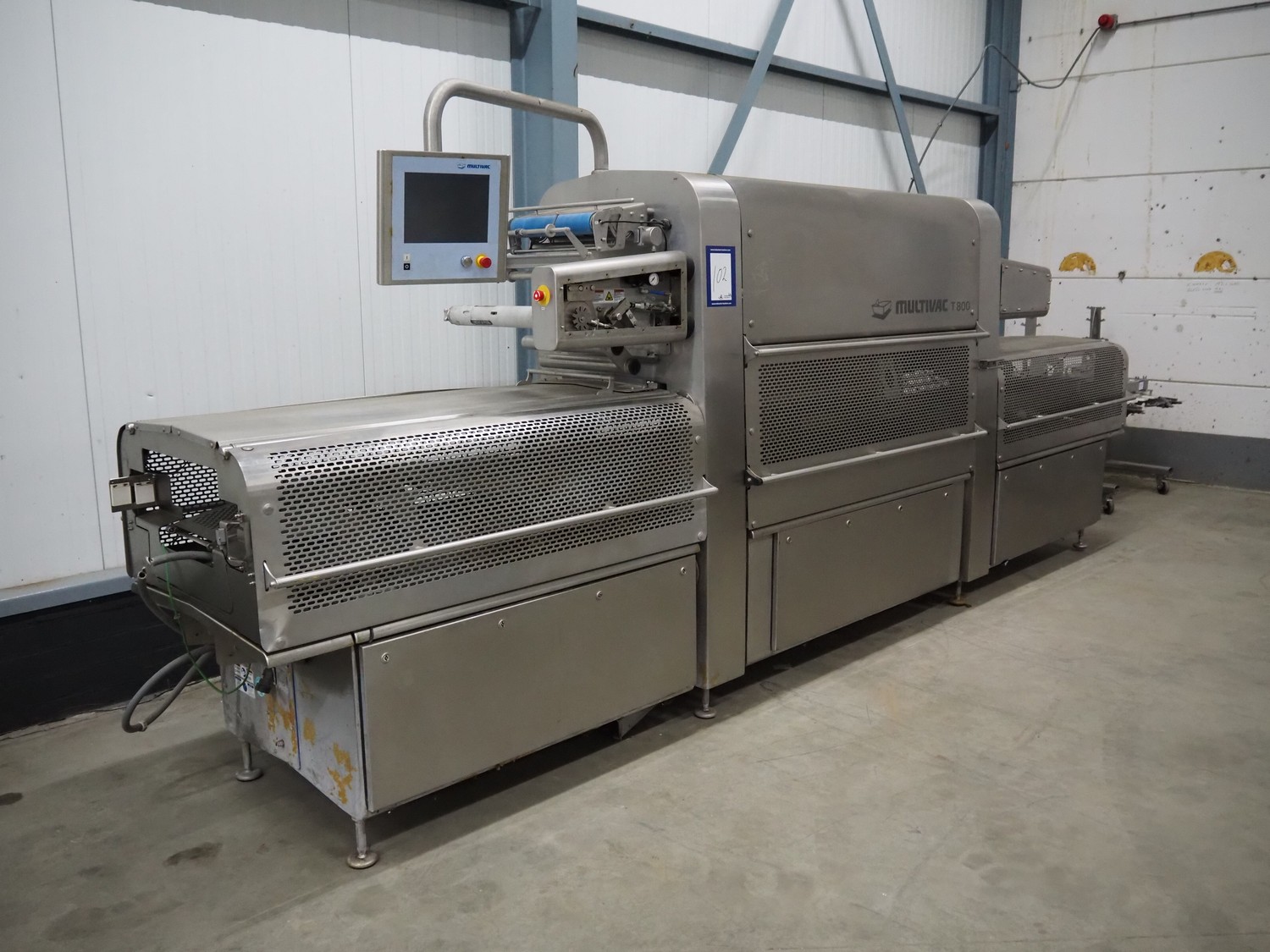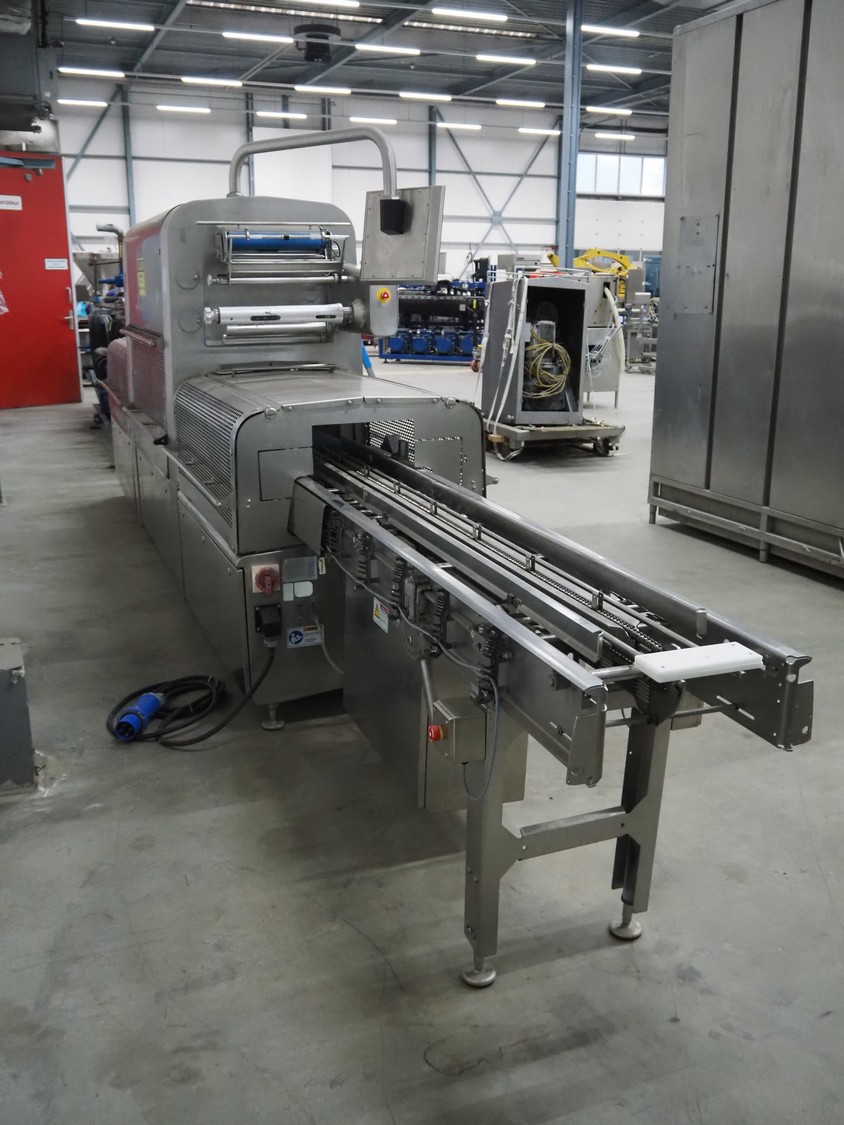 Multivac traysealer, model: T 800, serial number: 239815, year of construction: 12-2016, 220/127 V, 3 Ph, 60 Hz, 32/50 A, 8.4 kW, plastic mesh belt, belt width: 300 mm, clearance: 500 mm x 170 mm, film width: 520 mm, total dimensions: 5400 mm x 1020 mm x 2100 mm. Including trolley with dye, dye: (5x) 190 mm x 130 mm, dimensions trolley: 1050 mm x 1050 mm x 1320 mm.