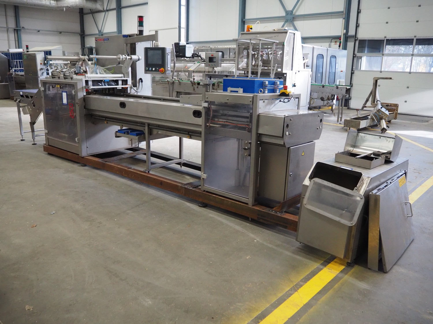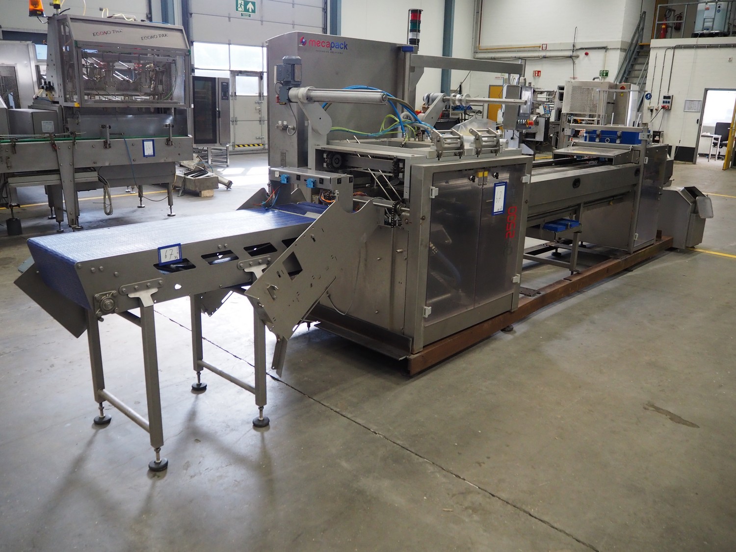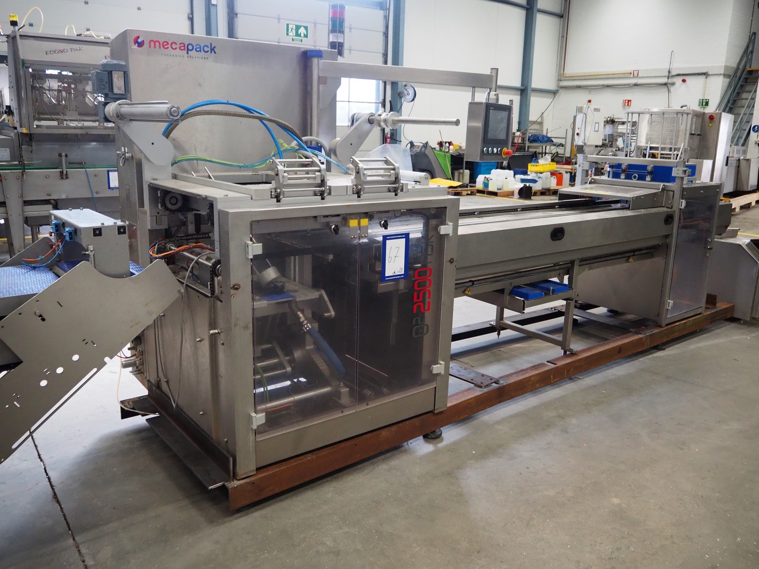 MECAPACK traysealer, type: Q² 2500 HSK, serial number: O08757, year of construction: 2020, 400 V, 3 Ph, 6 A, 16 kW, dye: 225 mm x 200 mm, film width: 460 mm, total dimensions: 4400 mm x 1300 mm x 2100 mm. Including outfeed belt, plastic belt, belt width: 460 mm, total dimensions: 1550 mm x 740 mm x 1180 mm and pallet with parts. Dye is incomplete.