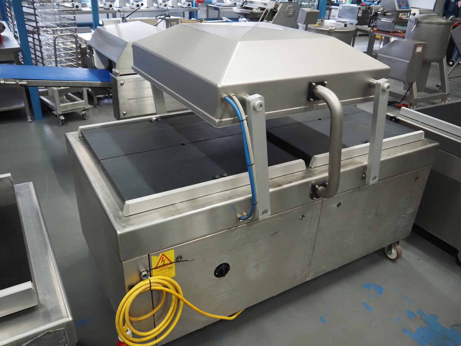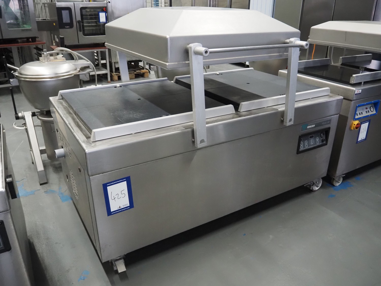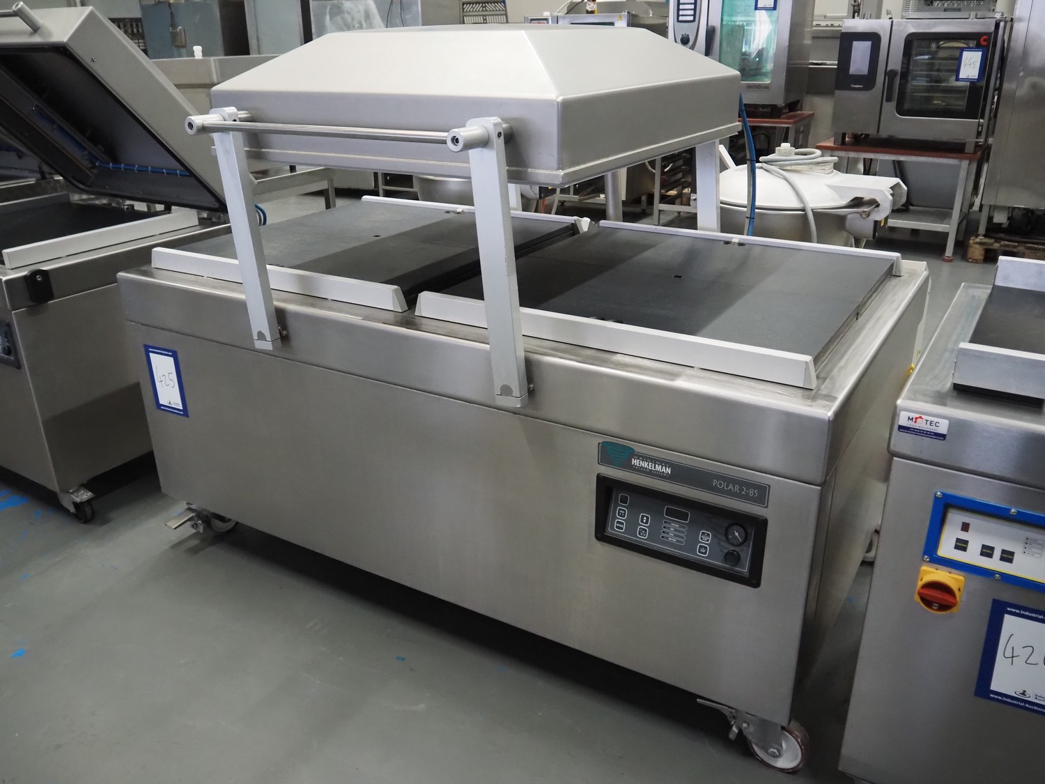 Henkelman mobile double chamber vacuum machine, model: POLAR 2-85, seal length: (4x) 830 mm, chamber dimensions: 830 mm x 830 mm, total dimensions: 1900 mm x 1300 mm x 1100 mm.