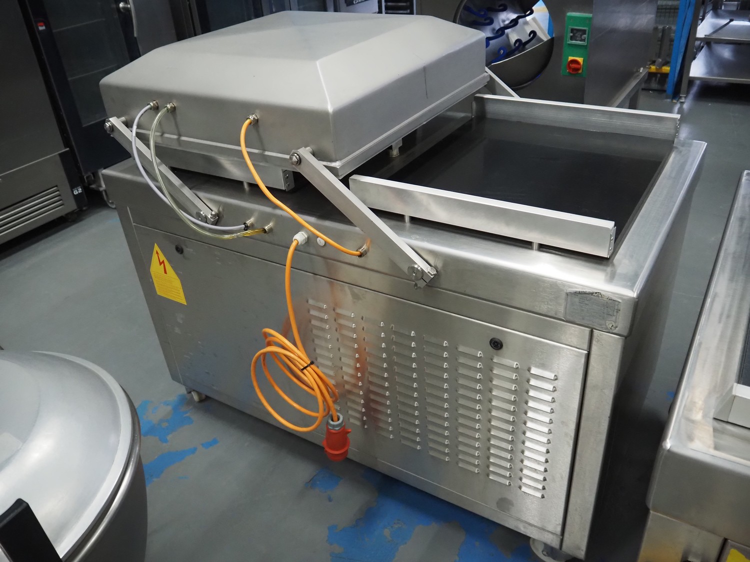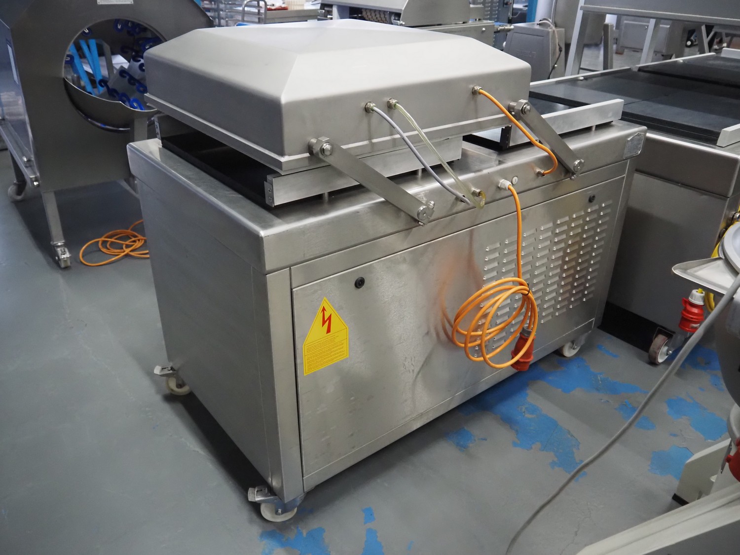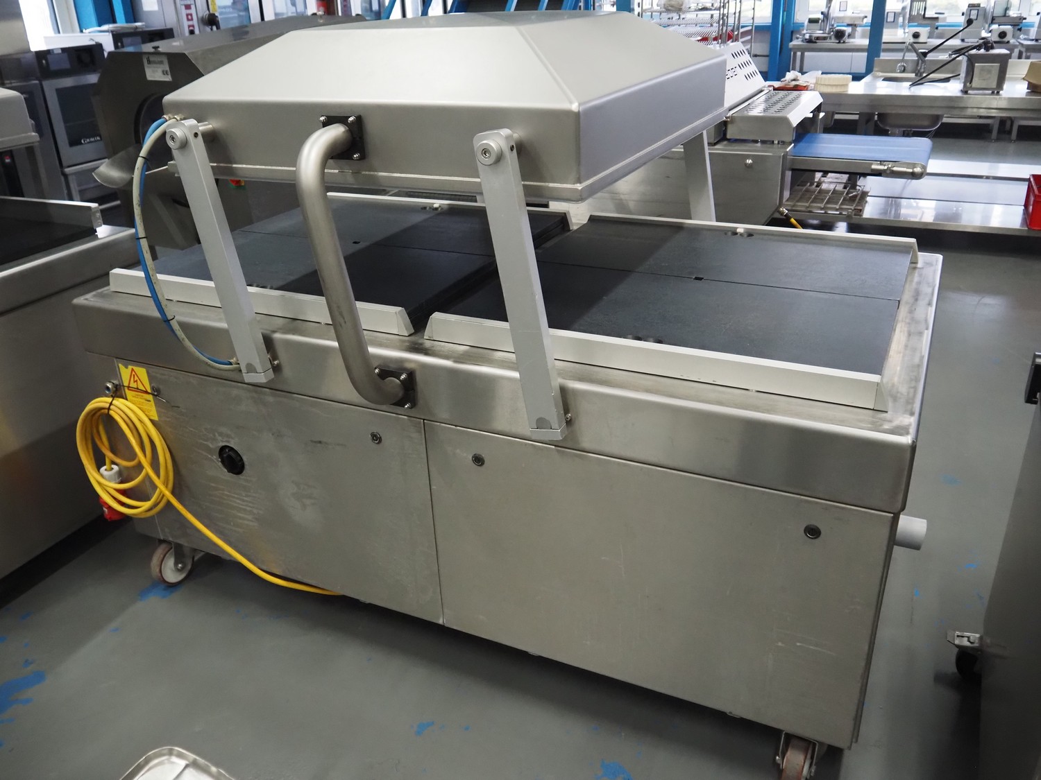 Henkelman mobile double chamber vacuum machine, model: POLAR 2-85, seal length: (4x) 830 mm, chamber dimensions: 830 mm x 830 mm, total dimensions: 1900 mm x 1300 mm x 1100 mm.