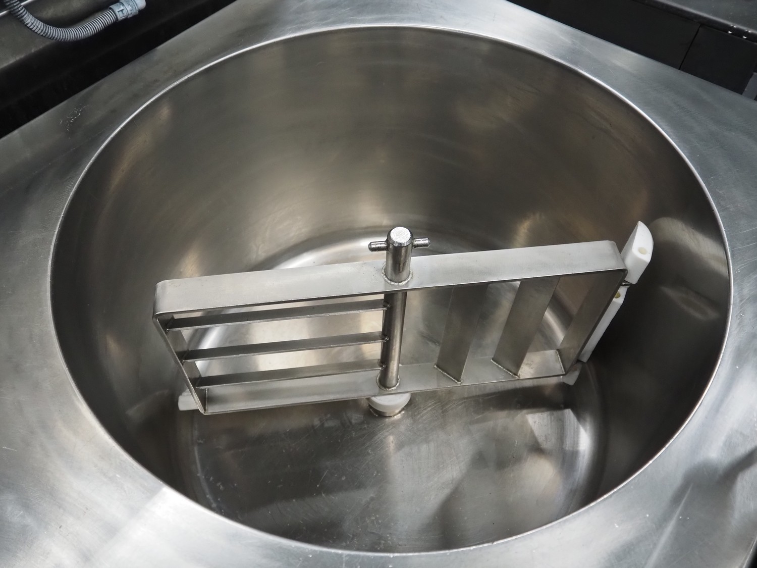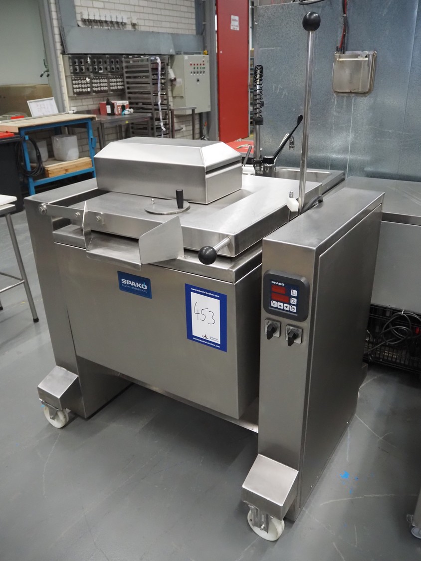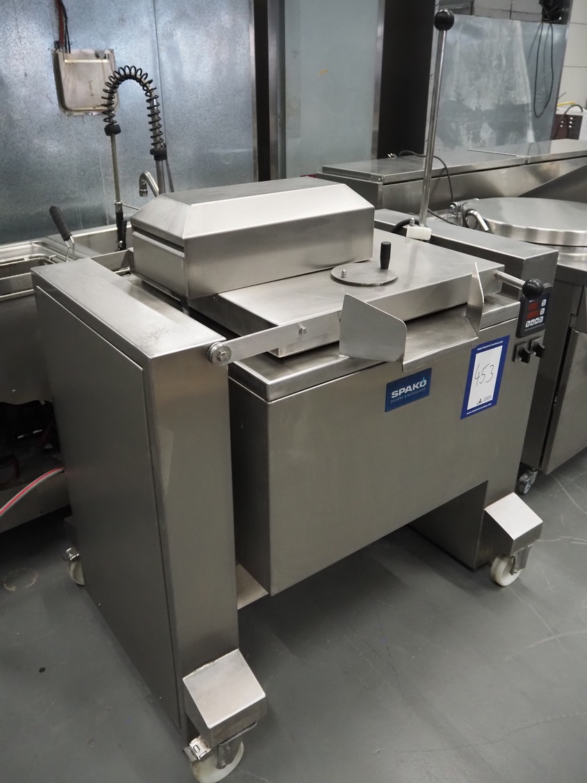 Spako cooking vessel with agitator, type: TRK100, serial number: 21.532, 230/400 V, 50 Hz, 9.5 kW, inside dimensions: Ø 600 mm x 400 mm, total dimensions: 1160 mm x 880 mm x 1590 mm.