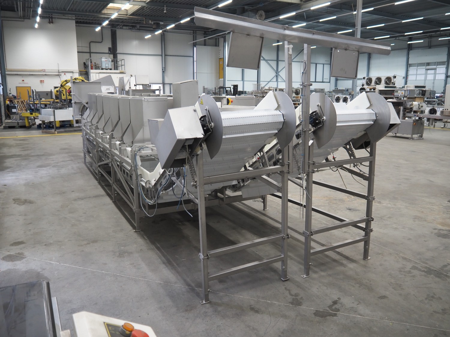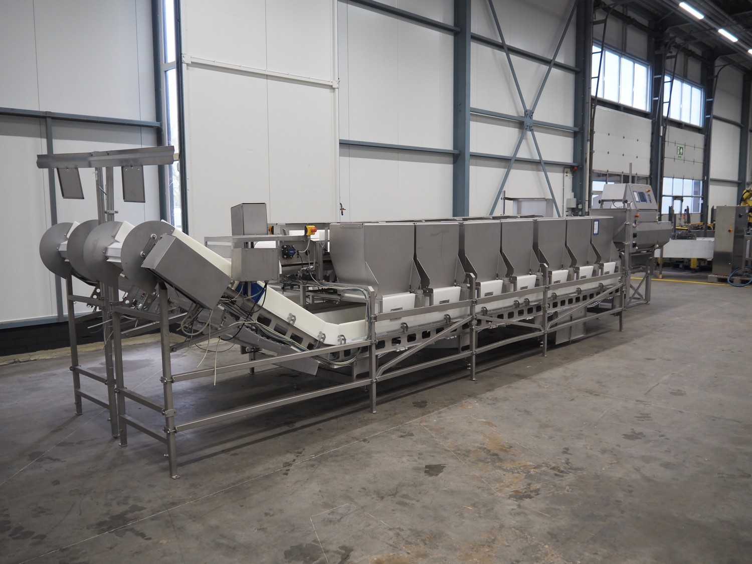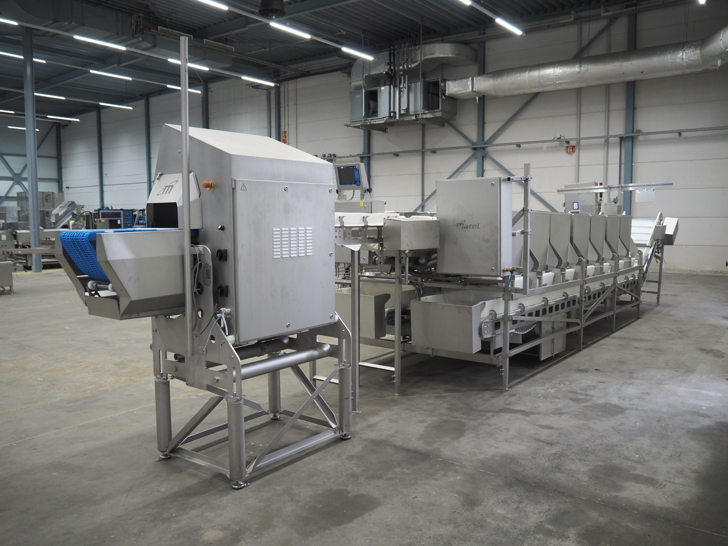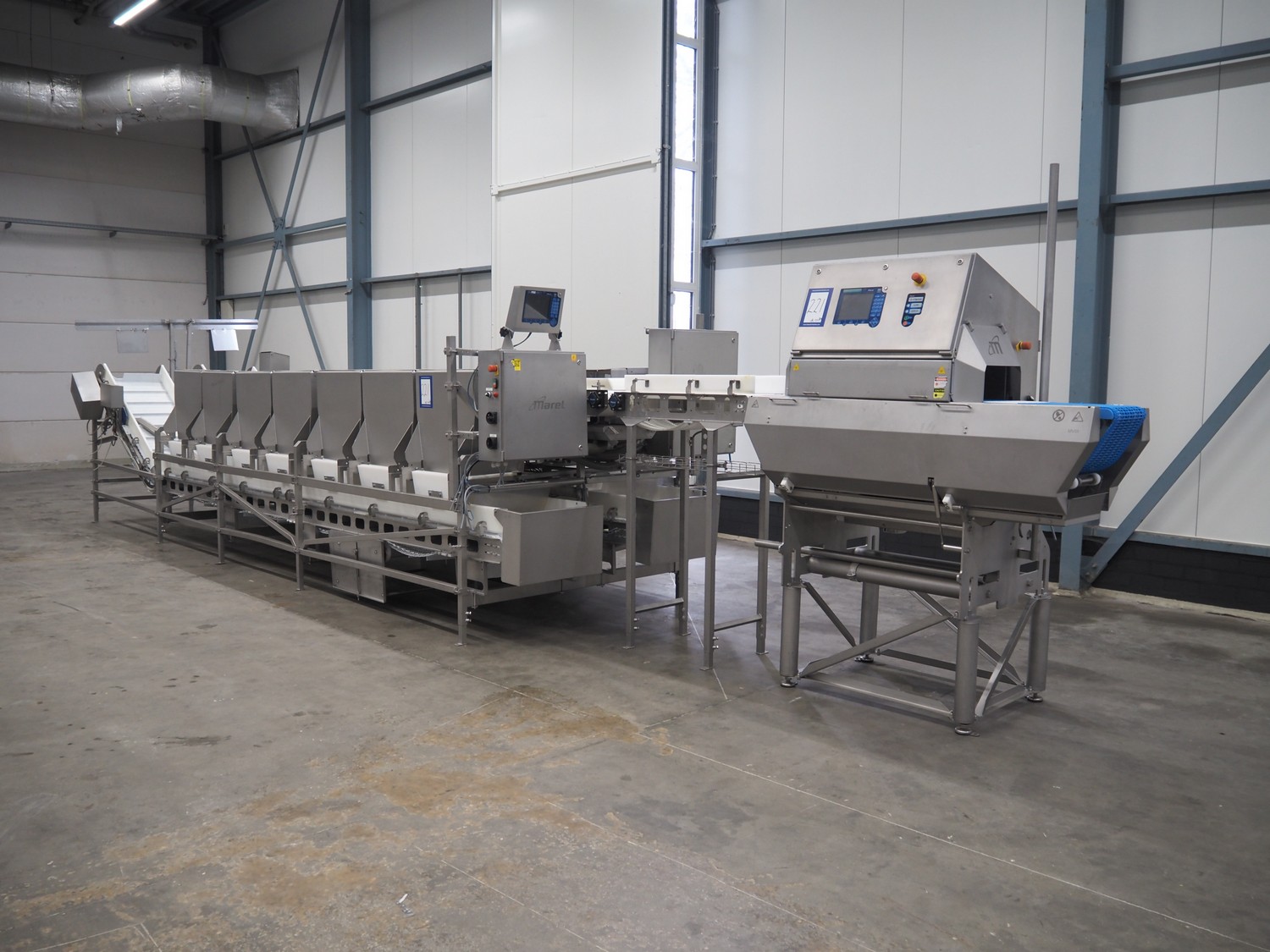 Marel weighing and sorting line, consisting of: Marel grader and Marel 14-stations sorting line, type grader: Vision Unit-300, serial number: A038511, year of construction: 2006, 230/400 V, 3 Ph, 0.15 kW, plastic mesh belt, belt width: 310 mm, total dimensions grader: 1750 mm x 800 mm x 2470,Marel transport belt, type: con-mstr, serial number: A044894, year of construction: 2007, 230/400 V, 3 Ph, 0.25 kW, s/s frame, plastic mesh belt, belt width: 300 mm, total dimensions transport belt: 1050 mm x 700 mm x 1550 mm, Marel 14-stations sorting line, type: dis-ma43, serial number: A045229, year of construction: 2007, 230/400 V, 3 Ph, 0.75 kW, 2x elevating belt with dividers, plastic mesh belt, belt width: 560 mm, distance between dividers: 195 mm and 1800 mm, divider height: 25 mm and 100 mm, elevating height: 1450 mm, total dimensions sorting line: 7100 mm x 2200 mm x 2100 mm
