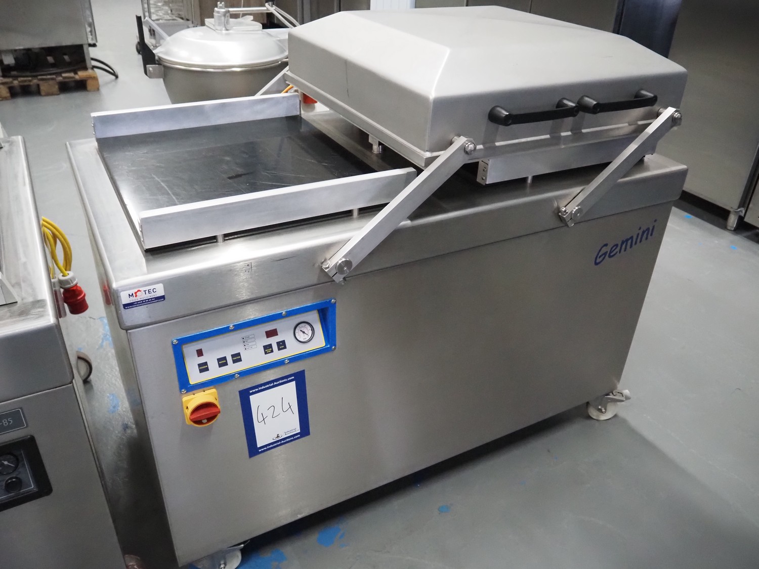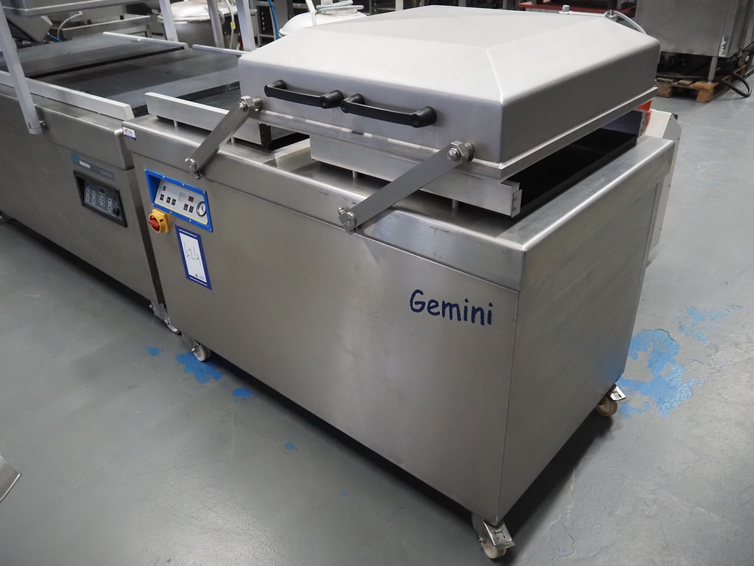 Stephanal Alvac mobile double chamber vacuum machine, type: Gemini, machine number: 1049-5437, year of construction: 2019, 230/400 V, 3 Ph, 50 Hz, 8.5/5 A, 2.2 kW, seal length: (4x) 550 mm, chamber dimensions: 615 mm x 550 mm, Busch vacuum pump, type: RA 0100 F 5R3, serial number: D18061371, capacity: 100 m³ per hour, total dimensions: 1500 mm x 500 mm x 1500 mm.