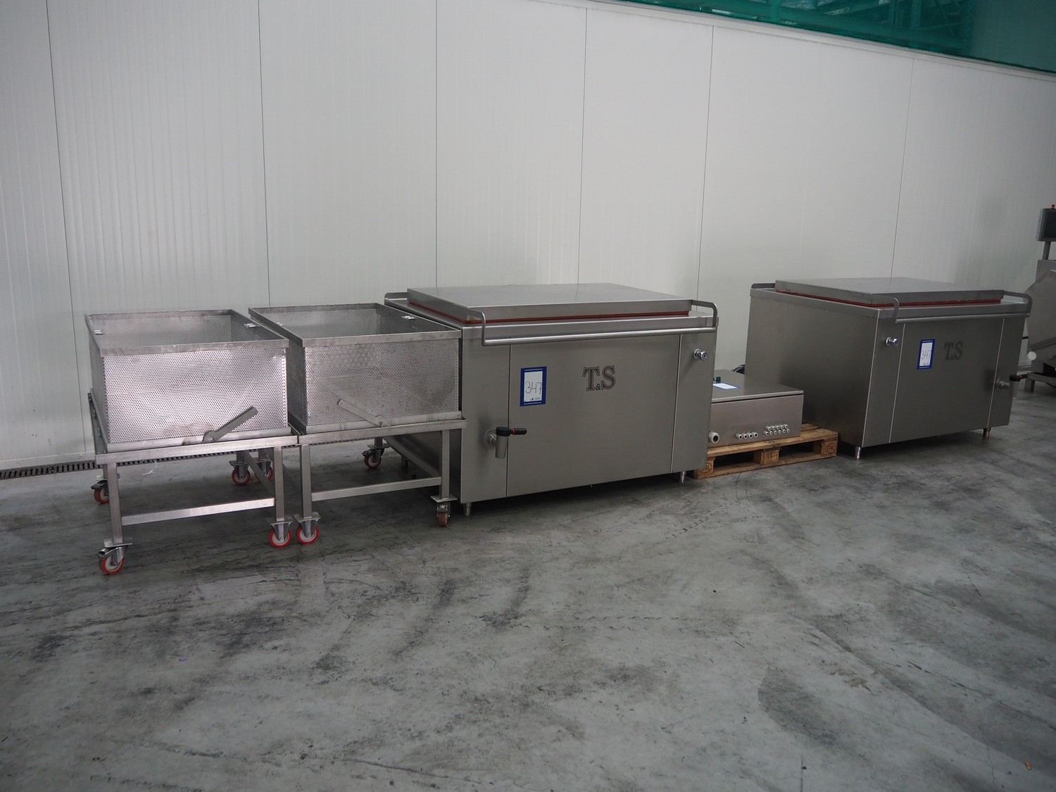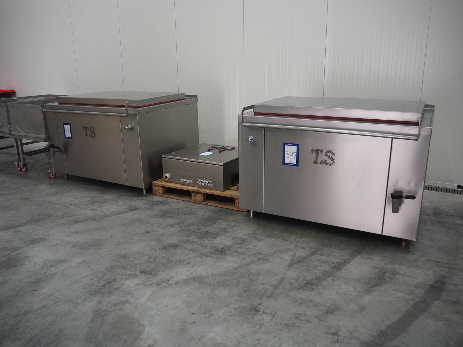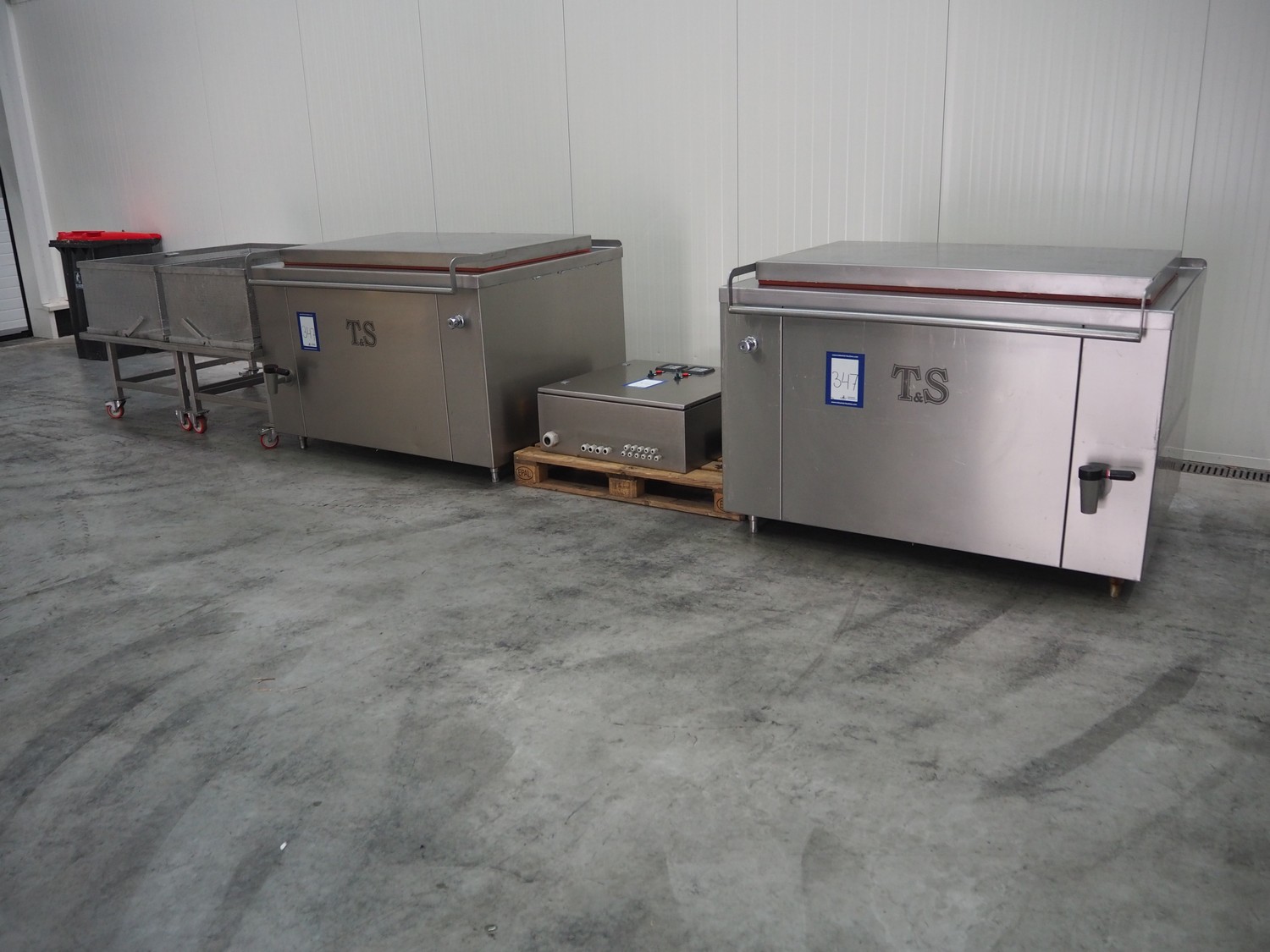 2 Thissen & Stecher BV cooking vessels with build-in steam generator, type: 500EG, volume: 500 liter, total dimensions: (2x) 1550 mm x 1400 mm x 1000 mm. Including 2 trolleys with basket dimensions: (2x) 1350 mm x 850 mm x 1000 mm and s/s switch cabinet.