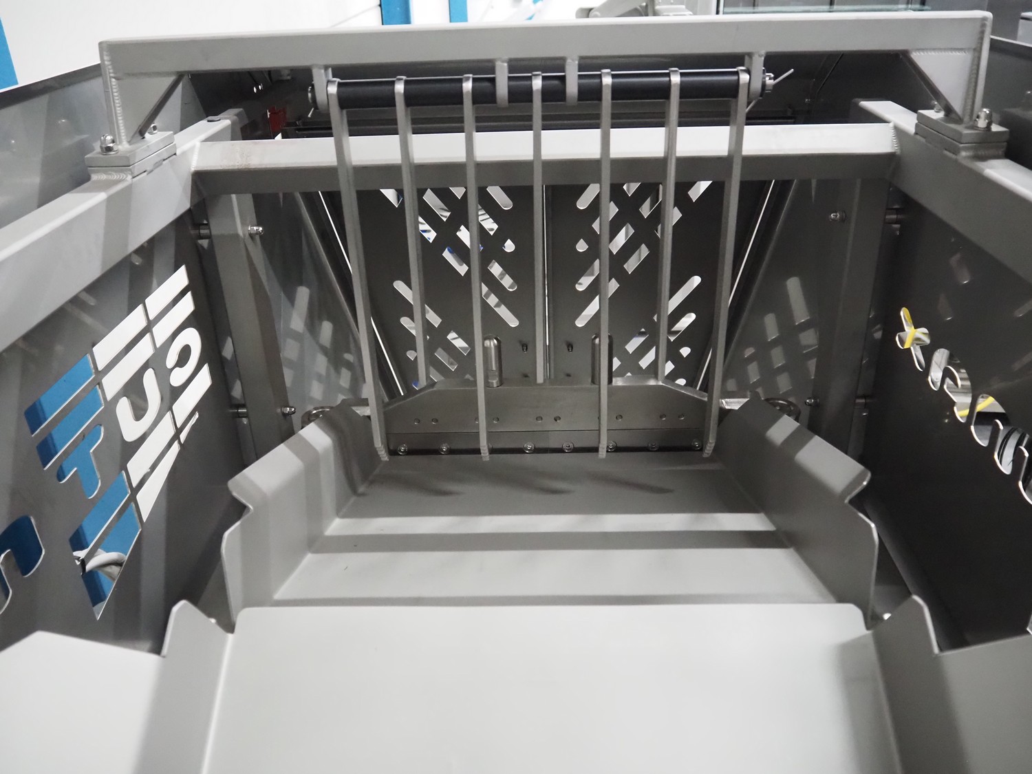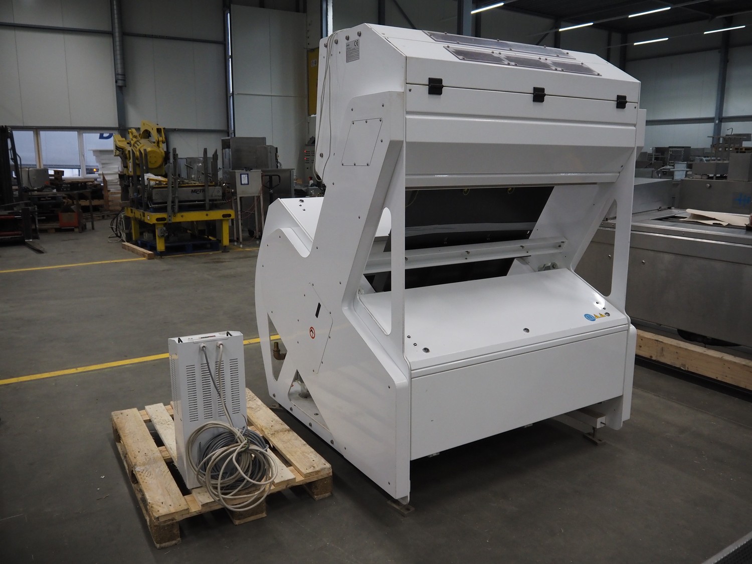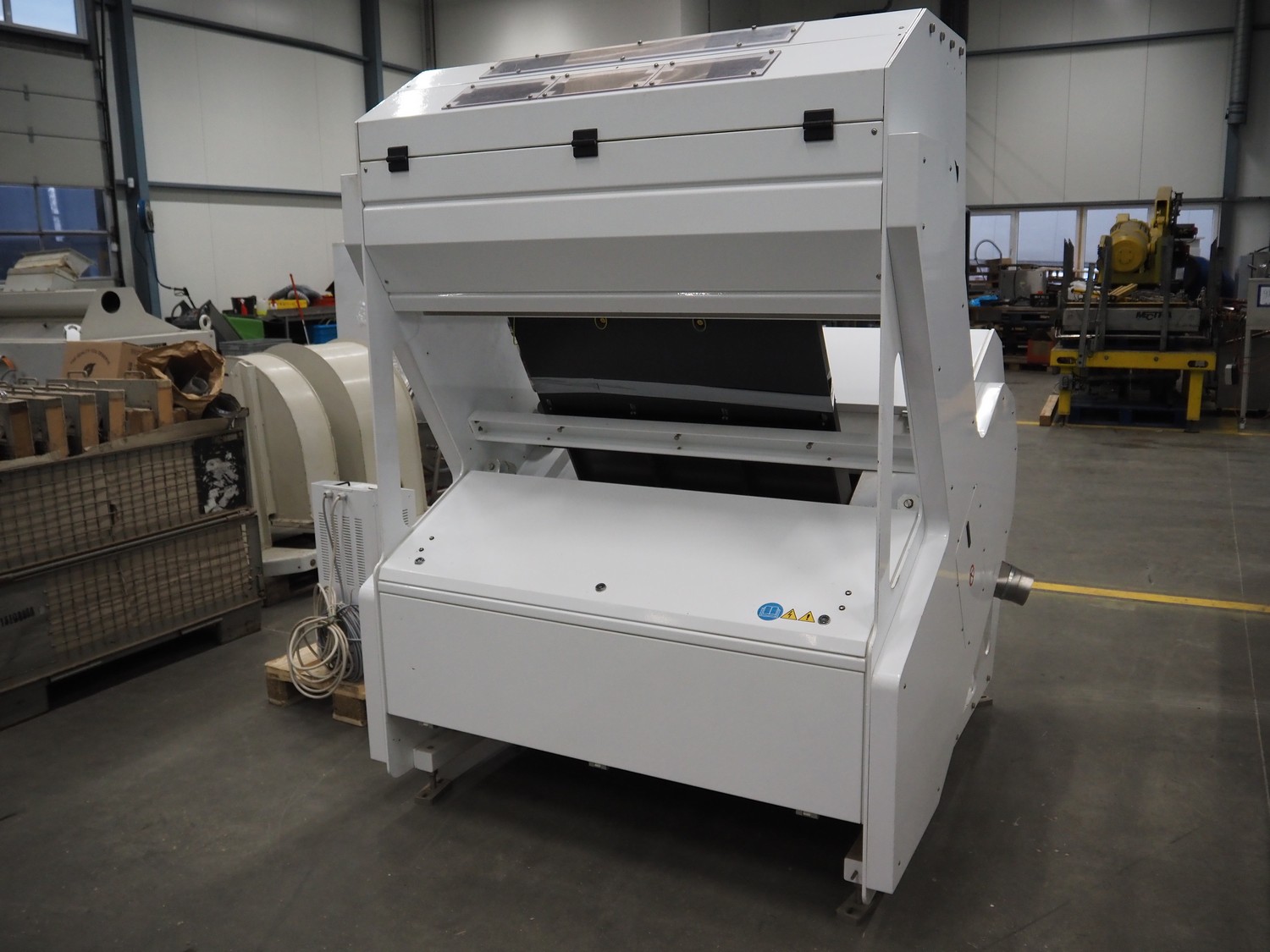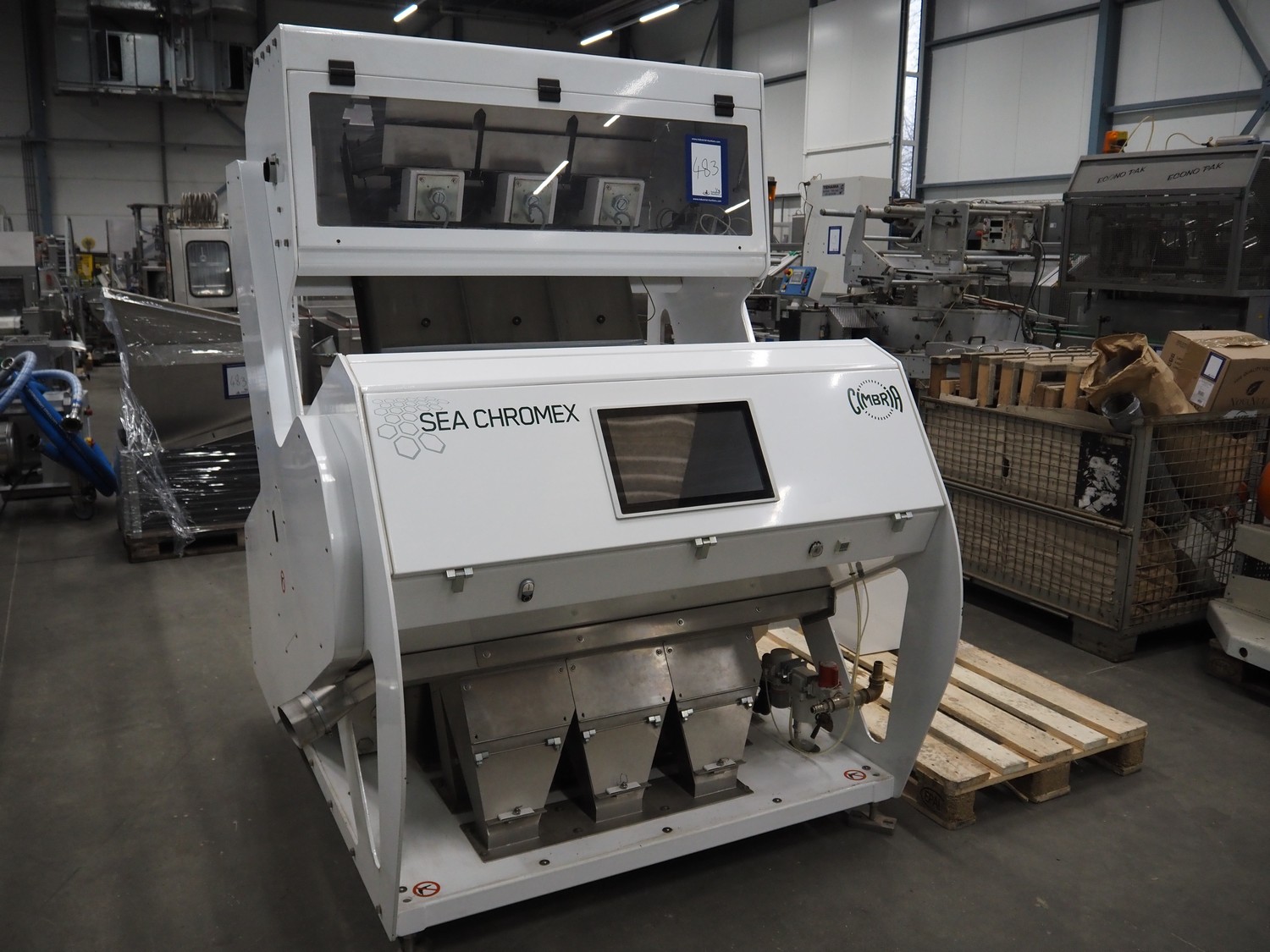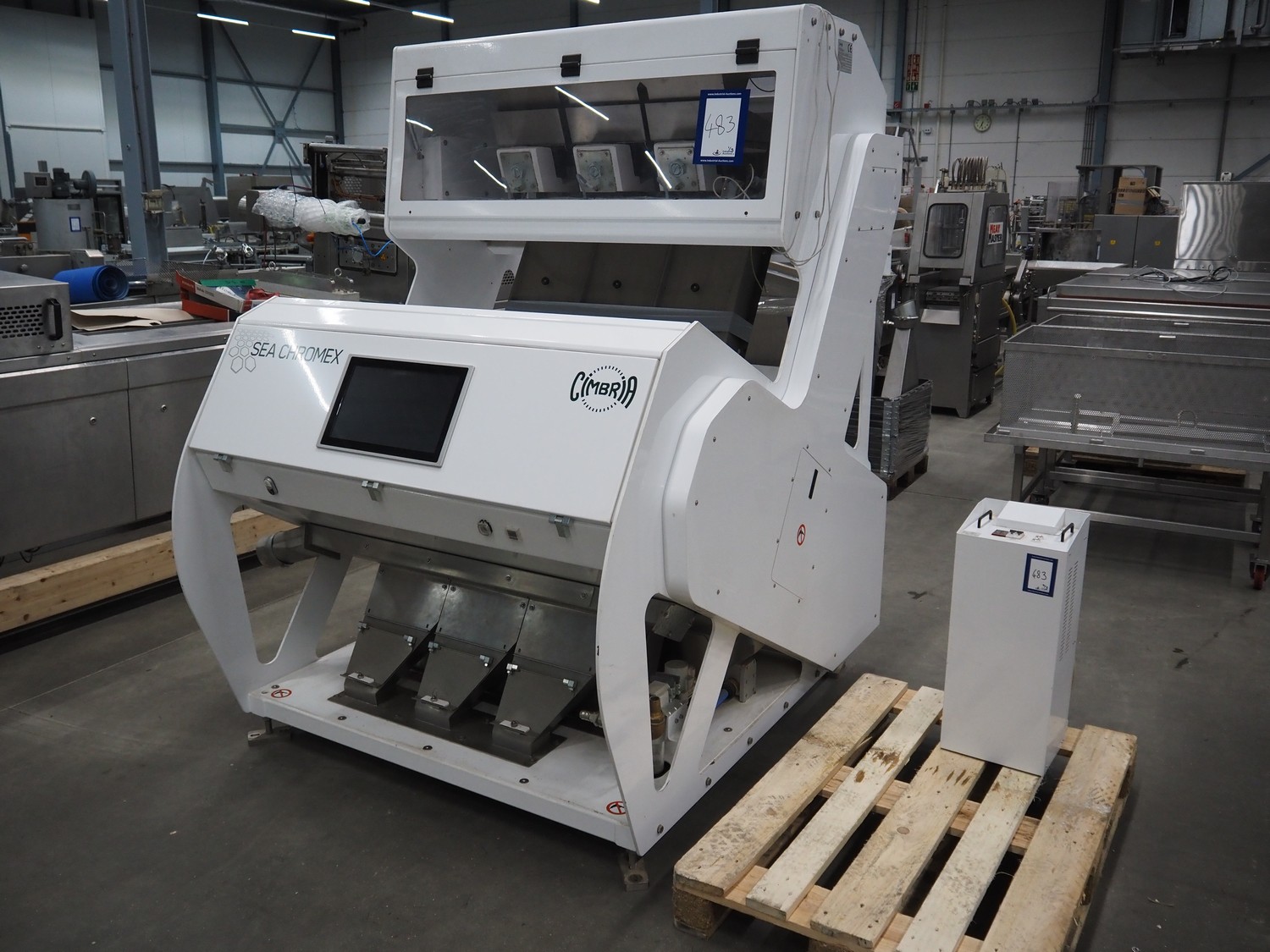 Cimbria S.r.l. colour sorting machine, model: CHROMEX-3 TN-TR, serial number: CX3-TN-TRC1680-17, year of construction: 2017, 230 V, 1 Ph, 50-60 Hz, weight: 1060 kg, 6 digital color cameras and additionally 3 NIR and 3 NIR InGaAs cameras for best possible detection, 2 CCD cameras per chute for real color detection, 4,048 pixels, camera resolution 0.07 mm/pixel, number of nozzles: 162, nozzle spacing: 5 mm, automatic interval cleaning of the detection system, chute width: from 810 mm, total dimensions: 1800 mm x 1100 mm x 2300 mm. Including 3 pallets with parts.