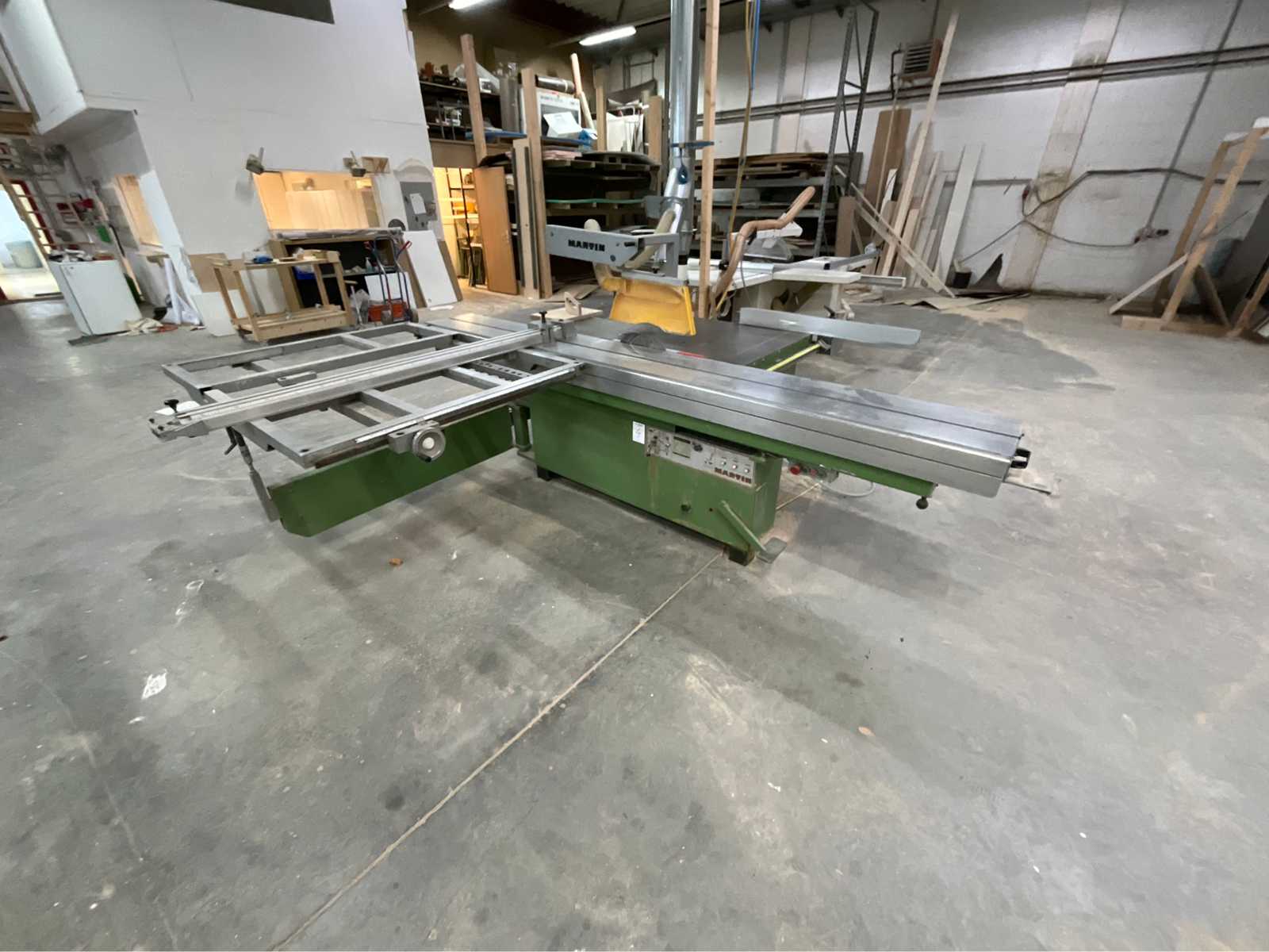 - Total installed power 4.55 KW. - Main disc: 4 KW motor, speed 4000 rpm, maximum disc diameter 300 mm, inner diameter 30 mm, tiltable 0°- 45°. - Scoring disc: 0.55 KW motor, speed 9200 rpm, diameter 120 mm, inner diameter 20 mm. - Carriage length 3000 mm. - Maximum cutting width against the parallel guide approx. 1270 mm. - Maximum cutting height at 0°: approx. 100 mm, maximum cutting height at 45°: approx. 72 mm. - Operating conditions of this machine: unchecked. - This item is delivered loaded by truck. The costs of dismantling and loading are those that are specified as additional costs. Auction-ID: A7-44536-62