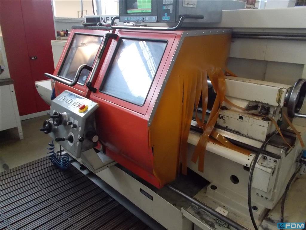 turning diameter over bed:1450 mmturning diameter over slide rest:1000 mmturning length:8000 mmspindle bore:160 mmturning speed range:2,8 - 560 U/minbed width:850 mmfaceplate diameter max.:1400 mmturning diameter in the gap:1800 mmlength of gap:600 mmdimensions of the machine ca.:12 x 2 x 2,5 mwith Digital Readout2 fixed steadies dia 1070 mmchip conveyor