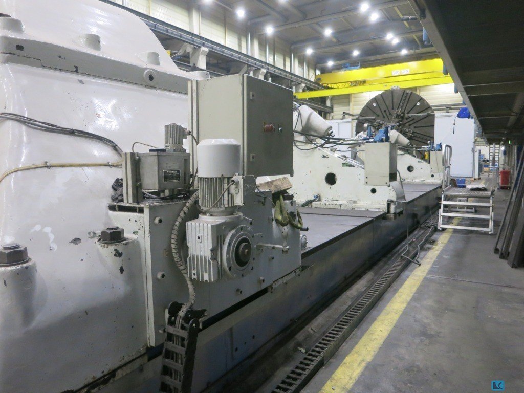 turning diameter over bed:3800 mmturning diameter over slide rest:3200 mmturning length:12000 mmfaceplate turning speed range -stepless-:2 - 200 U/minmax. workpiece weight:90.000 kgbed width:4000 mm2 steadies