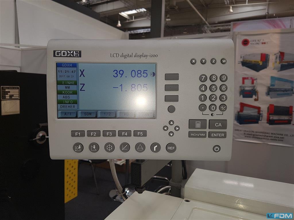 turning diameter over bed:570 mmturning diameter over slide rest:365 mmturning length:2000 mmfeed per revolution:0,06 - 58 / 0,03 - 28 mmspindle turning speed range:11,2 - 2240 U/minspindle bore:62 mmspindle head:8 nach DIN 55022 total power requirement:15 kWweight of the machine ca.:4,8 tdimensions of the machine ca.:4,5 x 1,5 x 1,4 mwith digital readout HEIDENHAINrapid feed, MULTIFIX toolholder system fixed steady dia. 160 mm 3 jaw chuck RÖHM TR 250 coolant attachmentdiverse toolholders, diverse jaws