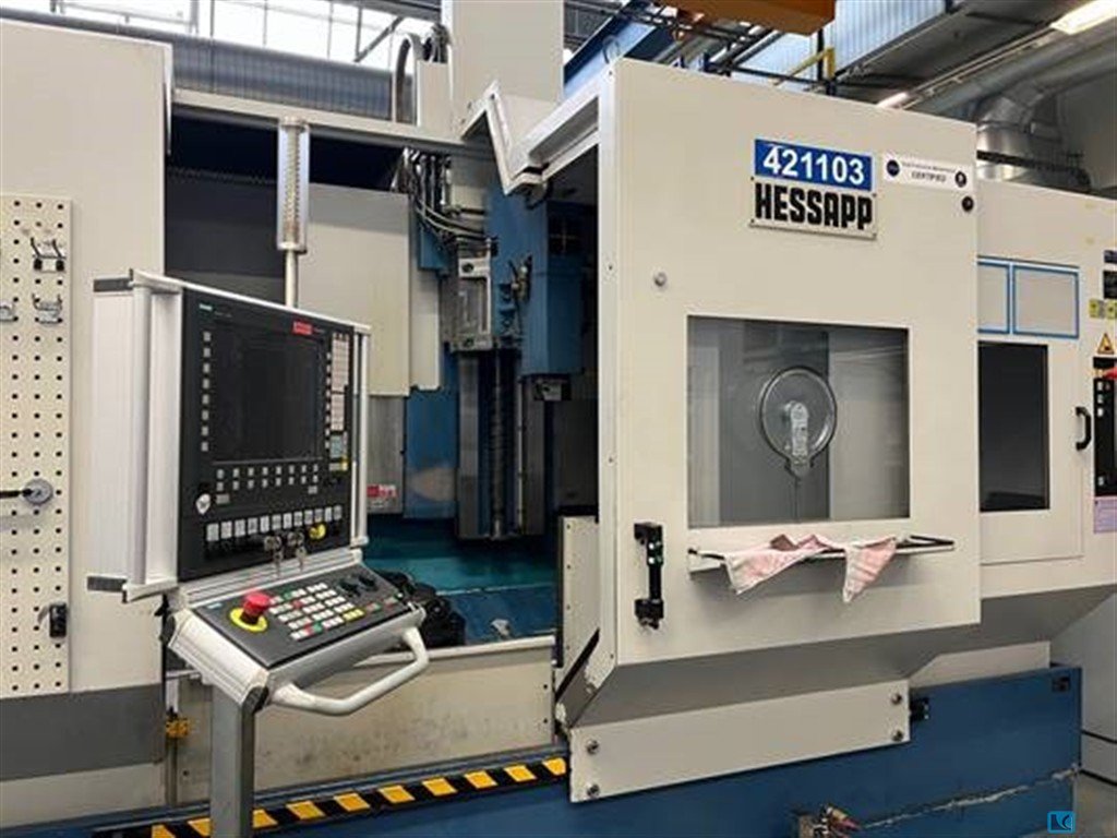 turning diameter:1000 mmswing diameter:1000 mmMachine type: Vertical latheManufacturer: HessappType: DV 62Serial no.: 14.2308Working range of the spindleLargest diameter 1000 mmLargest swing diameter 1000 mmCross slide travelStroke of the vertical slide 900 mmStroke of the horizontal slide 1810 mmTotal travel 2315 mmTurning spindleSpindle head with centering cone according to DIN 55021 A15Spindle diameter in the front bearing 203 mmMain driveVia a controlled asynchronous motor and gear transmissionwith range switching.Spindle speedsSpeed range I: 5 - 350 rpm.Speed range II: 30 - 1000 rpm.Travel speedX/Z axis: 10 m/min.W1 axis: 8 rpmNo C-Axis