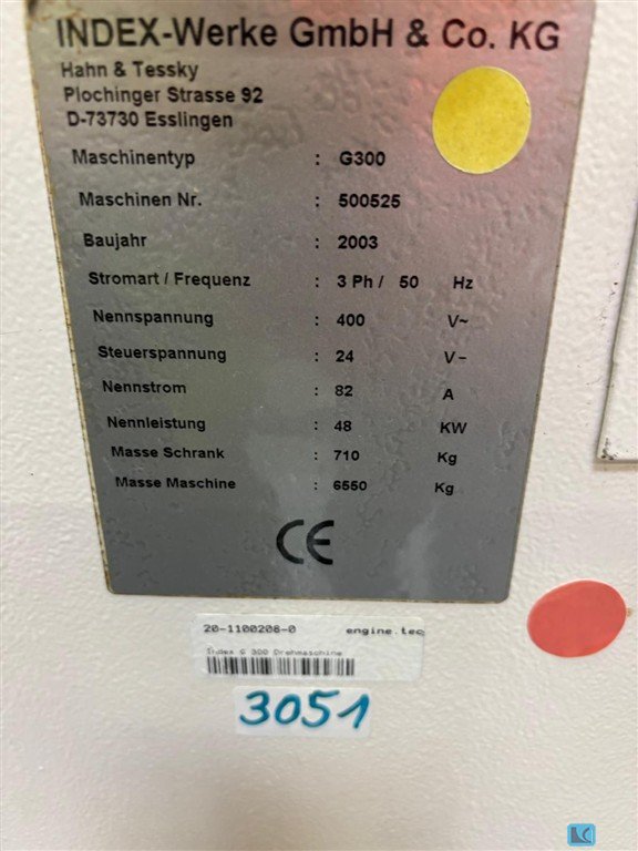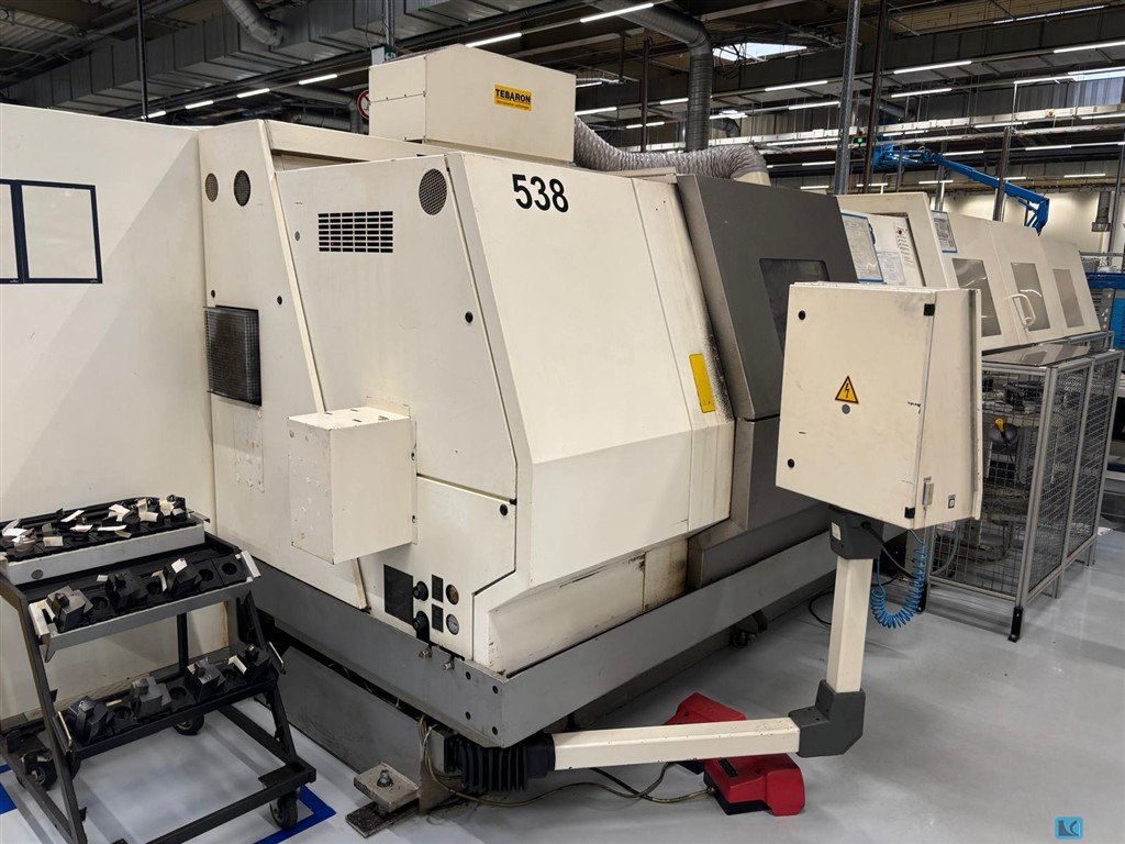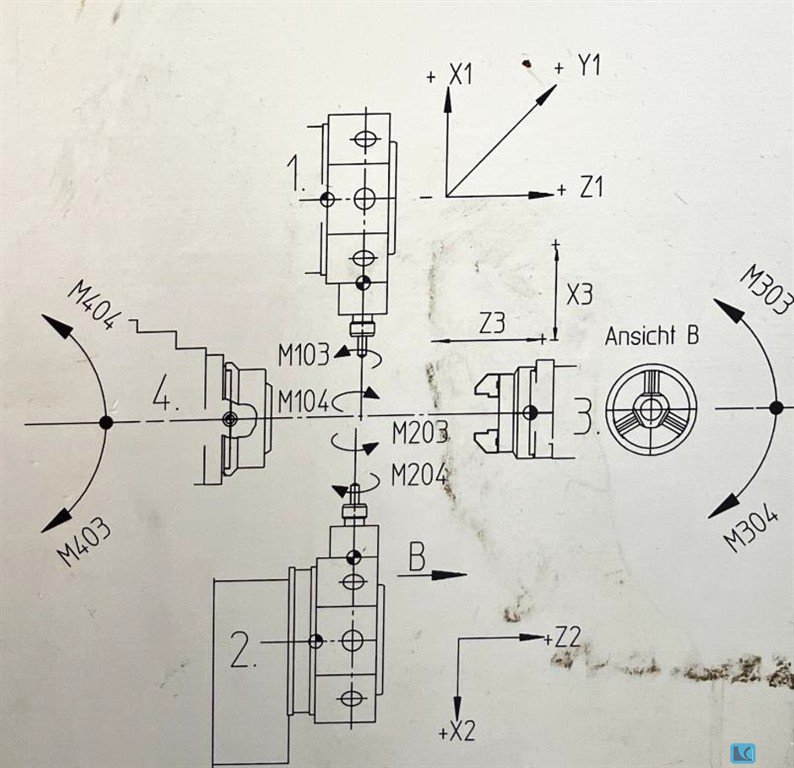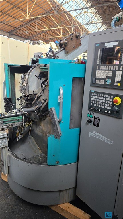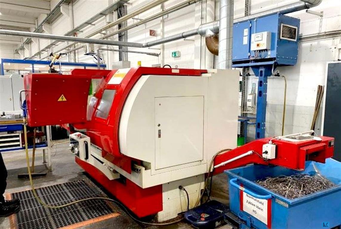 turning diameter:270 mmturning length:710 mmweight of the machine ca.:6,5 tmax. swing diameter:590 mmwith automatic loading and unloading system G300 with "spindle bore clamping capacity 90mm" in tailstock versionChip conveyor, belt filter press, hydraulic unit, as well as infeed and outfeed chain conveyor EWAP, with 33 pallets. The machine has no driven tools. The information in the circuit diagram refers to the rotary drive for indexing the turret, not to driven tools.