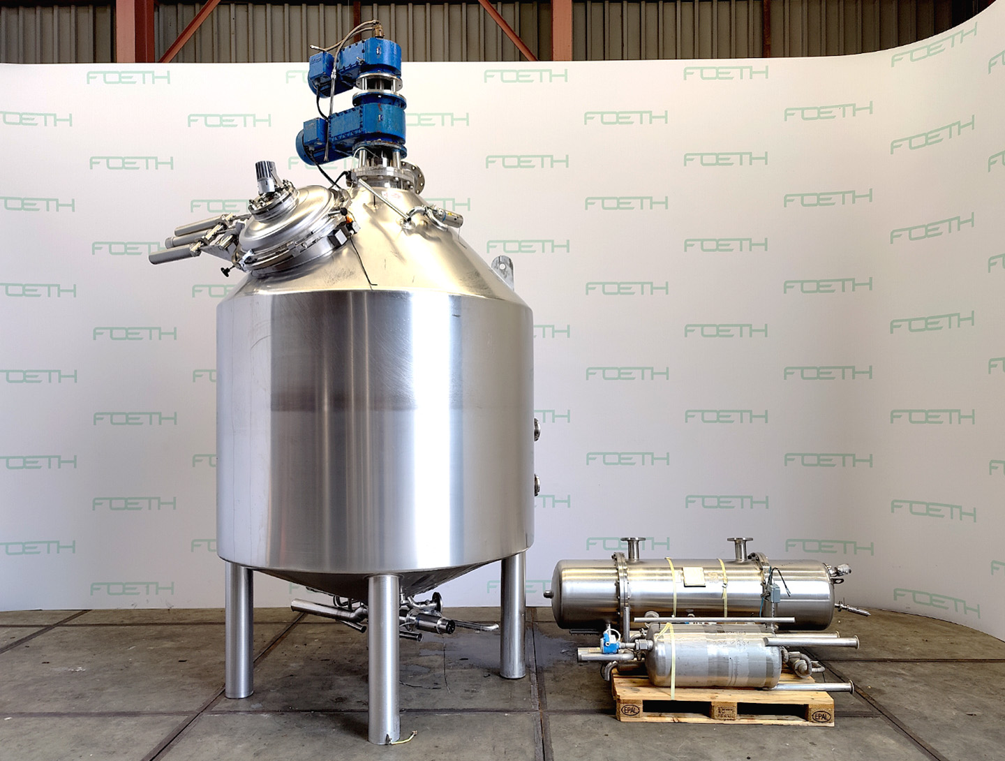 General SKU070A418 MakeStork Plaatwellerij Velsen No.1308 Year of construction1979 LocationBarneveld Pressure Working pressure4.5 Bar Vacuum possiblecheck Working pressure jacket3 Bar Main Features MaterialStainless steel Volume800 Ltr. Motor11 KW Specified Features - Stainless Steel Reactor MaterialStainless steel 1.4571 (316Ti) Stainless Steel Reactors Reactorcheck Capacity1000 l, Useful 800 l Vessel sizesdia. 1042 x 1000mm Dished bottomcheck Conical bottomcheck Dished top sidecheck Manholecheck hand hole dia. 200 mm Top connectionsdia. 150 mm + dia. 40 mm + 2x dia. 25 mm Outletdia. 145 mm With jacketcheck vollume: 80 Ltr Max. temperature150°C With propellor stirrermake Ekato, type EM-060 With paddle stirrercheck Motor11,0 KW, (380/660 Volt, 960 rpm (Ex)) Speed mixing shaft99 rpm Information Floorspace1,4 x 1,4 m Total height3,0 m Weight1600 kg ATE ...