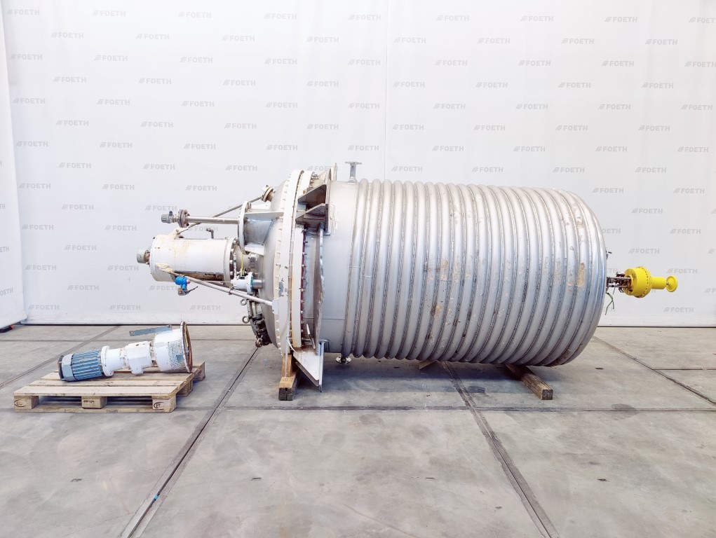 General SKU345S686 MakeAlois Binderberger Albi (AT) No.1248 Year of construction1994 LocationBarneveld Pressure Working pressure3.2 Bar Vacuum possiblecheck Working pressure jacket9 Bar Main Features MaterialStainless steel Volume6300 Ltr. Motor15 KW Specified Features - Stainless Steel Reactor Reactorcheck Capacity6300 Ltr. (max. 7700 Ltr) Vessel sizesdia. 2000x2000 mm Dished bottomcheck Dished top sidecheck ManholeDN600 Top connectionsDN250, DN200, DN100, DN80, DN50 OutletDN80 Half coil jacketedcheck (200 Ltr.) Max. temperature-30/200 °C With paddle stirrercheck Motor15,0 KW, 400 Volt (EExdeIICT4) Speed mixing shaft62 rpm Stainless Steel Reactors MaterialStainless steel 1.4571 (316Ti) Information ATEX compatiblecheckAgrochemicalsPlastic & polymersStainless Steel ReactorsCatalysts & fillersSolventsDetergent & surf.Other pharmaceuticsCosmeticsOrganicsLubr ...
