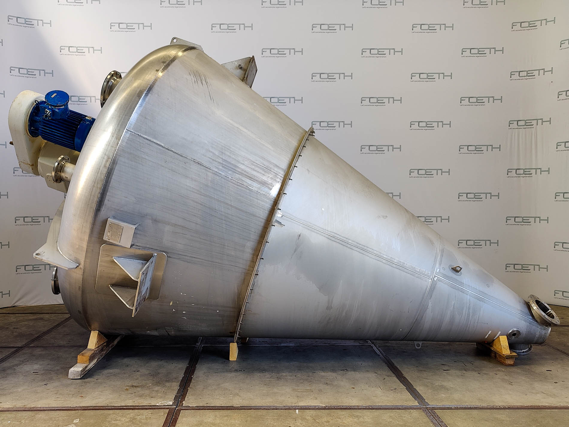 General SKU390T1166 MakeA. Bolz Wangen LocationBarneveld TypeDB-900-M3 Pressure Working pressure0.1 Bar Main Features MaterialStainless steel Volume9000 Ltr. Motor18.5 KW Specified Features - Conical mixer Conical mixercheck Density1.16 kg/dm³ Capacity9000 Ltr. (Bruto. 18000 Ltr.) Largest cone diameter3330 mm Cone height5205 mm ManholeDN700 With stainless steel armcheck Motor1: 18,5 kW, 2: 2,2 kW With variable speed drivecheck screw speed (nominal): 66 rpm, arm speed (nominal): 0,7 rpm Motor3 kW Bottom bearing pintle bearingcheck Max. temperature100 °C Bottom dischargeDN 250/300 (side) MaterialStainless steel 1.4404 (316L) Information No.M041305 Year of construction2000 Floor space3,6x3,6 m Total height6,5 m Weight7250 kg ATEX compatiblecheck Extra SpecificationsThis conical mixer has also a Bolz product discharge, specifically type NW250/NW300. It can ...