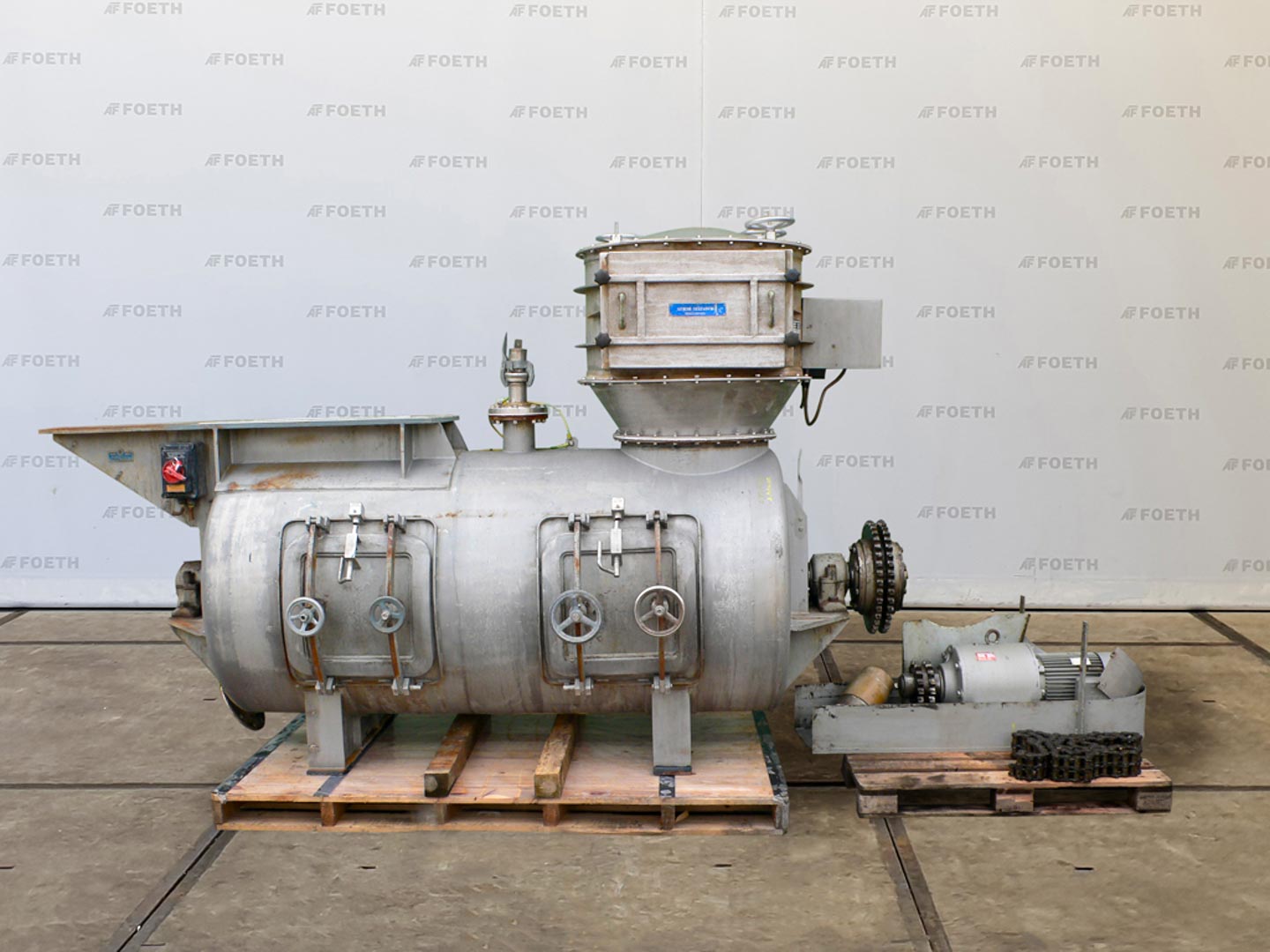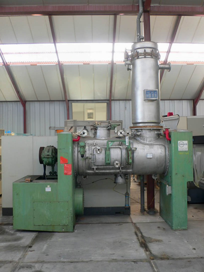 General SKU106N545 MakeDrais TypeTR 1000 No.49693 (Vessel 2602) Year of construction1979 Mounted on framecheck Pressure Working pressure0 Bar Vacuum possiblecheck Working pressure jacket5 Bar Technical specs Max. temperature200 °C Main Features MaterialStainless steel Volume1000 Ltr. Motor35 KW Specified Features - Paddle dryer Paddle dryercheck Capacity1000 l Trough sizesDia. 800 x 2000mm InletDia. 360mm Manholecheck OutletDia. 160mm, Inspection valve 710x450mm With jacketcheck 100 L Shaft can be heatedcheck Max. temperature200°C With adjustable packing glandscheck Motor35 kW, (380 V (Ex)) MaterialStainless steel 1.4552, Stainless steel 1.4306 (304L) Information LocationBarneveld Floorspace4,0 x 1,3 m Total height4,5 m Weight± 5500 kg ATEX compatiblecheckBiotechnologyAgrochemicalsCatalysts & fillersFeed additivesDiscountOther pharmaceuticsCosmetics ...
