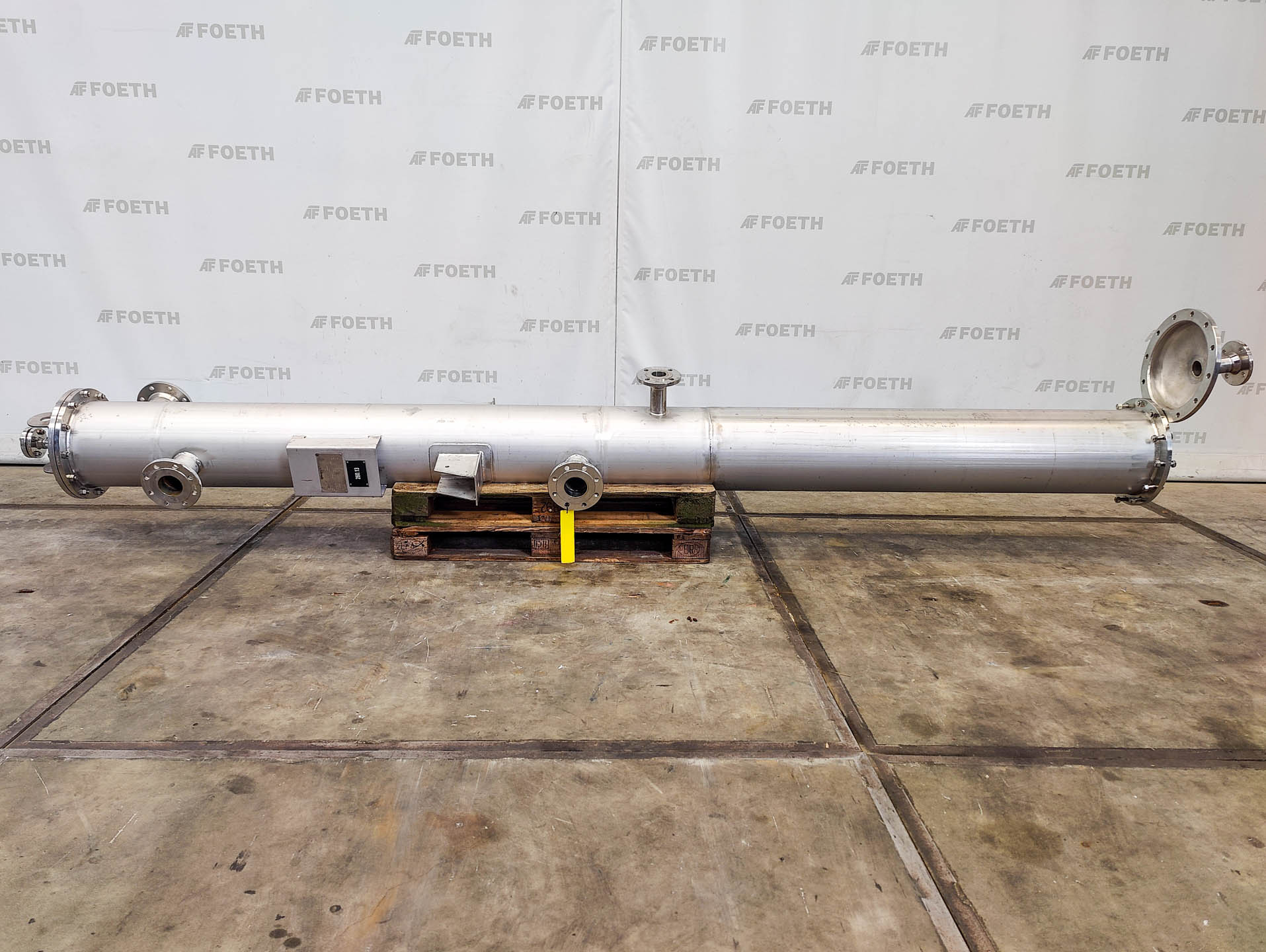 General SKU309N500 MakeFalk gmbh & Co. KG No.3304 Year of construction2007 Mounted on legscheck Material Shell materialStainless steel 1.4571 (316Ti) Cover materialStainless steel 1.4571 (316Ti) Tube materialStainless steel 1.4571 (316Ti) Pressure Working pressure shell1 Bar Working pressure tubes4 Bar Main Features Shell (Material)Stainless steel Tube (Material)Stainless steel Surface150.5 m2 Specified Features - Shell and tube heat exchanger Heat exchangercheck Horizontalcheck Notified bodyAD2000 Heating surface150,5 m2 Tube capacity830 Ltr U-typecheck Number of tubes:157 Tube diameter25mm Tube length(2x)5900mm Wall thickness tubes2,0mm Max. temperature100 degr.C Shell capacity1530 Ltr Shell diameterdia.711mm Shell length6370mm Wall thickness shell5mm Max. temperature100 gr.C. Shell connectionsdn500, dn80 Cover connections(2x)dn200 Information Loca ...